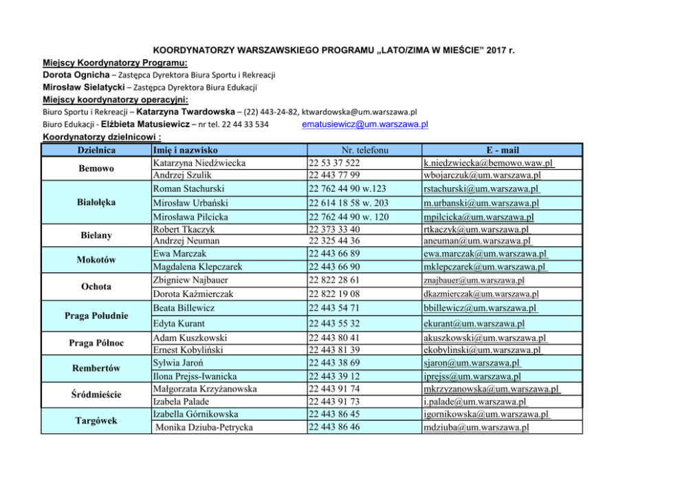 KOORDYNATORZY WARSZAWSKIEGO PROGRAMU „LATO/ZIMA W MIEŚCIE” 2017 r. Miejscy Koordynatorzy Programu: Dorota Ognicha – Zastępca Dyrektora Biura Sportu i Rekreacji Mirosław Sielatycki – Zastępca Dyrektora Biura Edukacji Miejscy koordynatorzy operacyjni: Biuro Sportu i Rekreacji – Katarzyna Twardowska – (22) 443-24-82, [email protected] Biuro Edukacji - Elżbieta Matusiewicz – nr tel. 22 44 33 534 [email protected] Koordynatorzy dzielnicowi : Dzielnica Bemowo Białołęka Bielany Mokotów Ochota Praga Południe Praga Północ Rembertów Śródmieście Targówek Imię i nazwisko Katarzyna Niedźwiecka Andrzej Szulik Roman Stachurski Nr. telefonu 22 53 37 522 22 443 77 99 22 762 44 90 w.123 E - mail [email protected] [email protected] [email protected] Mirosław Urbański Mirosława Pilcicka Robert Tkaczyk Andrzej Neuman Ewa Marczak Magdalena Klepczarek Zbigniew Najbauer Dorota Kaźmierczak Beata Billewicz 22 614 18 58 w. 203 22 762 44 90 w. 120 22 373 33 40 22 325 44 36 22 443 66 89 22 443 66 90 22 822 28 61 22 822 19 08 22 443 54 71 [email protected] [email protected] [email protected] [email protected] [email protected] [email protected] Edyta Kurant Adam Kuszkowski Ernest Kobyliński Sylwia Jaroń Ilona Prejss-Iwanicka Małgorzata Krzyżanowska Izabela Palade Izabella Górnikowska Monika Dziuba-Petrycka 22 443 55 32 22 443 80 41 22 443 81 39 22 443 38 69 22 443 39 12 22 443 91 74 22 443 91 73 22 443 86 45 22 443 86 46 [email protected] [email protected] [email protected] [email protected] [email protected] [email protected] [email protected] [email protected] [email protected] [email protected] [email protected] [email protected] Ursus Ursynów Wawer Wesoła Wilanów Włochy Wola Żoliborz Biuro Edukacji PK w Powsinie SCS Aktywna Warszawa Barbara Dudzińska Norbert Pyza 22 443 60 48 22 443 60 73 [email protected] [email protected] Agnieszka Kowalska 22 443 75 13 [email protected] Piotr Kryziński 22 443 73 18 [email protected] Edyta Michalczyk 22 443 68 92 [email protected] Danuta Młot 22 443 68 97 [email protected] Jacek Karczmarek 22 773 60 46 [email protected] Agata Sokołowska-Mielechin 23 773 60 46 [email protected] Agnieszka Porębska 22 443 50 09 [email protected] Magdalena Cacek-Ganc 22 443 49 90 [email protected] Katarzyna Łazarecka 22 443 43 93 [email protected] Małgorzata Zylm 22 443 56 74 [email protected] Ewa Wocial 22 443 56 73 [email protected] Jolanta Piątkowska 22 443 57 65 [email protected] Gabriela Korczak-Florek 22 443 88 56 [email protected] Łukasz Kula-Orłowski 22 443 90 11 [email protected] Danuta Markiewicz 22 443 35 54 [email protected] Jacek Grzyśka 22 443 35 55 [email protected] Adam Stańczyk 22 649 45 75 [email protected] Iwona Gajewska 22 598 94 77 [email protected] Anna Jasiurska [email protected]