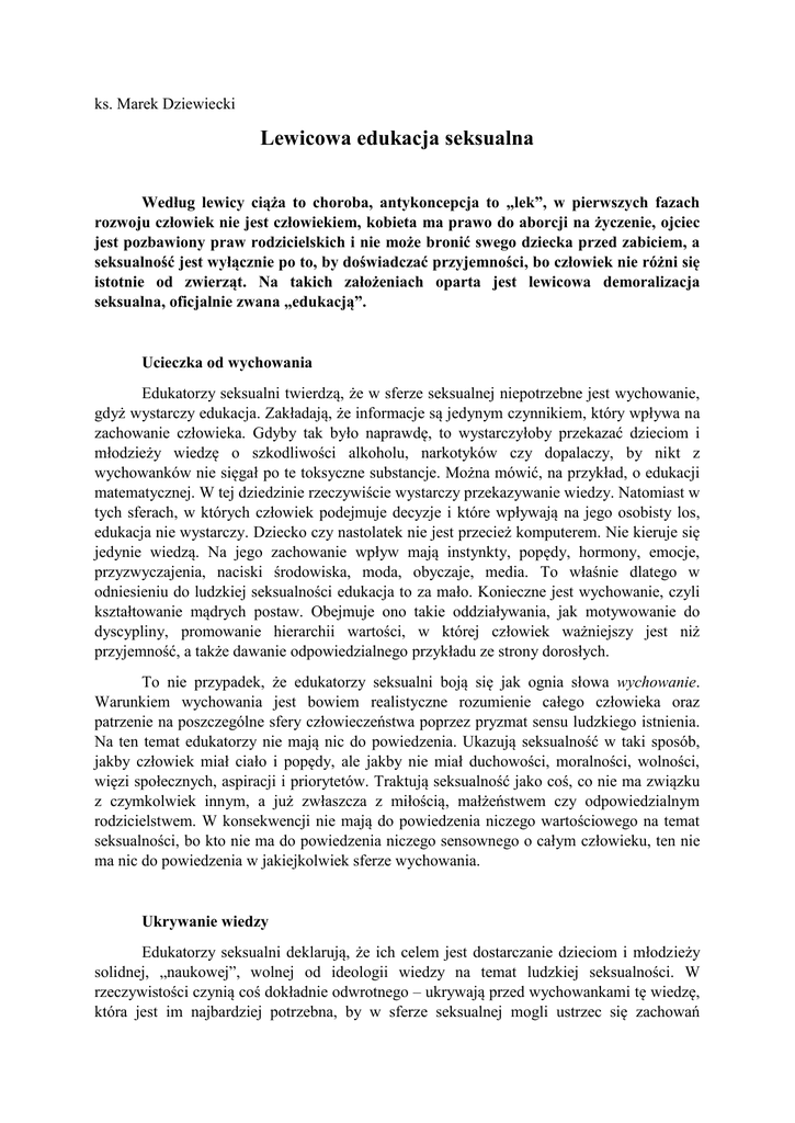 ks. Marek Dziewiecki Lewicowa edukacja seksualna Według lewicy ciąża to choroba, antykoncepcja to „lek”, w pierwszych fazach rozwoju człowiek nie jest człowiekiem, kobieta ma prawo do aborcji na życzenie, ojciec jest pozbawiony praw rodzicielskich i nie może bronić swego dziecka przed zabiciem, a seksualność jest wyłącznie po to, by doświadczać przyjemności, bo człowiek nie różni się istotnie od zwierząt. Na takich założeniach oparta jest lewicowa demoralizacja seksualna, oficjalnie zwana „edukacją”. Ucieczka od wychowania Edukatorzy seksualni twierdzą, że w sferze seksualnej niepotrzebne jest wychowanie, gdyż wystarczy edukacja. Zakładają, że informacje są jedynym czynnikiem, który wpływa na zachowanie człowieka. Gdyby tak było naprawdę, to wystarczyłoby przekazać dzieciom i młodzieży wiedzę o szkodliwości alkoholu, narkotyków czy dopalaczy, by nikt z wychowanków nie sięgał po te toksyczne substancje. Można mówić, na przykład, o edukacji matematycznej. W tej dziedzinie rzeczywiście wystarczy przekazywanie wiedzy. Natomiast w tych sferach, w których człowiek podejmuje decyzje i które wpływają na jego osobisty los, edukacja nie wystarczy. Dziecko czy nastolatek nie jest przecież komputerem. Nie kieruje się jedynie wiedzą. Na jego zachowanie wpływ mają instynkty, popędy, hormony, emocje, przyzwyczajenia, naciski środowiska, moda, obyczaje, media. To właśnie dlatego w odniesieniu do ludzkiej seksualności edukacja to za mało. Konieczne jest wychowanie, czyli kształtowanie mądrych postaw. Obejmuje ono takie oddziaływania, jak motywowanie do dyscypliny, promowanie hierarchii wartości, w której człowiek ważniejszy jest niż przyjemność, a także dawanie odpowiedzialnego przykładu ze strony dorosłych. To nie przypadek, że edukatorzy seksualni boją się jak ognia słowa wychowanie. Warunkiem wychowania jest bowiem realistyczne rozumienie całego człowieka oraz patrzenie na poszczególne sfery człowieczeństwa poprzez pryzmat sensu ludzkiego istnienia. Na ten temat edukatorzy nie mają nic do powiedzenia. Ukazują seksualność w taki sposób, jakby człowiek miał ciało i popędy, ale jakby nie miał duchowości, moralności, wolności, więzi społecznych, aspiracji i priorytetów. Traktują seksualność jako coś, co nie ma związku z czymkolwiek innym, a już zwłaszcza z miłością, małżeństwem czy odpowiedzialnym rodzicielstwem. W konsekwencji nie mają do powiedzenia niczego wartościowego na temat seksualności, bo kto nie ma do powiedzenia niczego sensownego o całym człowieku, ten nie ma nic do powiedzenia w jakiejkolwiek sferze wychowania. Ukrywanie wiedzy Edukatorzy seksualni deklarują, że ich celem jest dostarczanie dzieciom i młodzieży solidnej, „naukowej”, wolnej od ideologii wiedzy na temat ludzkiej seksualności. W rzeczywistości czynią coś dokładnie odwrotnego – ukrywają przed wychowankami tę wiedzę, która jest im najbardziej potrzebna, by w sferze seksualnej mogli ustrzec się zachowań ryzykownych. Dla przykładu, edukatorzy nigdy nie wspominają o tym, że w odniesieniu do zachowań seksualnych jedynym stuprocentowo pewnym sposobem ochrony przed AIDS czy innymi chorobami wenerycznymi jest wstrzemięźliwość przedmałżeńska i wzajemna wierność małżeńska. Gdy w czasie spotkania z młodzieżą spytałem jednego z edukatorów, który występował przede mną, dlaczego nie wspomniał o powyższym fakcie, mój rozmówca zmieszał się, a następnie próbował uciec od tematu. Powiedział, że AIDS można zarazić się nawet w trakcie wizyty u dentysty. Wyjaśniłem, że leczenie zębów nie jest zachowaniem seksualnym. Wtedy edukator próbował „ratować się” w inny sposób. Stwierdził, że chce zachować neutralność światopoglądową i dlatego nie będzie promował określonych postaw. Wyjaśniłem, że nie oczekiwałem od niego promowania określonych postaw, lecz jedynie dostarczenia młodzieży elementarnej wiedzy o tym, jakie zachowania seksualne są wolne od ryzyka. Gdy „edukator” zorientował się, że jego cynizm został zdemaskowany, spuścił głowę i do końca naszego spotkania z licealistami już tylko milczał. Edukatorzy seksualni moją też inne tematy tabu. Dla przykładu, w ogóle nie przekazują nastolatkom wiedzy na temat cyklu płodności pary ludzkiej. Czynią wszystko, by przed dziećmi i młodzieżą ukryć fakt, że kobieta jest płodna niecałą dobę w cyklu, a para ludzka płodna jest kilka dni w cyklu, gdyż tyle plemniki mogą przeżyć w narządach rodnych kobiety w oczekiwaniu na dojrzałą komórkę jajową. Edukatorzy ukrywają tę wiedzę po to, by wmówić młodzieży, że jedynym sposobem kierowania płodnością jest antykoncepcja. Od edukatorów seksualnych nastolatki nie dowiedzą się o tym, że biologicznym sensem współżycia jest przekazywania życia dzieciom. Przeciwnie, otrzymają dawkę ideologicznych sloganów o tym, jakim to złem i nieszczęściem jest ciąża i jak starannie należy się przed nią „zabezpieczać” – także w dorosłym życiu. Kolejny temat tabu to wiedza na temat rozwoju dziecka w okresie prenatalnym czy na temat optymalnych warunków wychowania dzieci przez mamę i tatę w trwałej i szczęśliwej rodzinie. Edukatorzy seksualni nie wspomną nawet o tym, że żadna antykoncepcja czy prezerwatywa nie chroni człowieka przed popadaniem w erotomanię, przed przestępstwami seksualnymi, przed byciem wykorzystanym i porzuconym czy przed zdradami małżeńskimi. Manipulowanie faktami Na stronach „Pontonu” (http://ponton.org.pl/pl/strona/prawo-seks) edukatorzy zapewniają dzieci i młodzież, że „polskie prawo nie ingeruje w sferę życia seksualnego, jak to ma miejsce np. w USA. Polskie przepisy zapewniają swobodę i wolność wyboru, jeśli chodzi o rodzaj aktywności i jej częstotliwość, płeć partnera (bądź partnerów), jego (ich) wiek i stan cywilny czy rodzaj sto