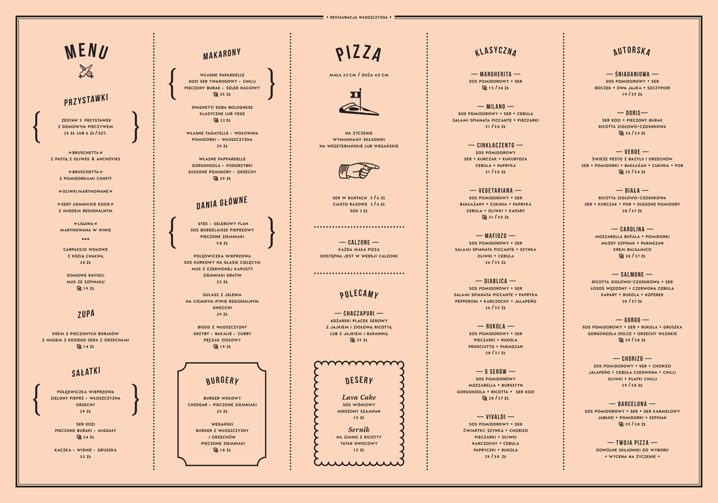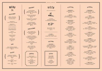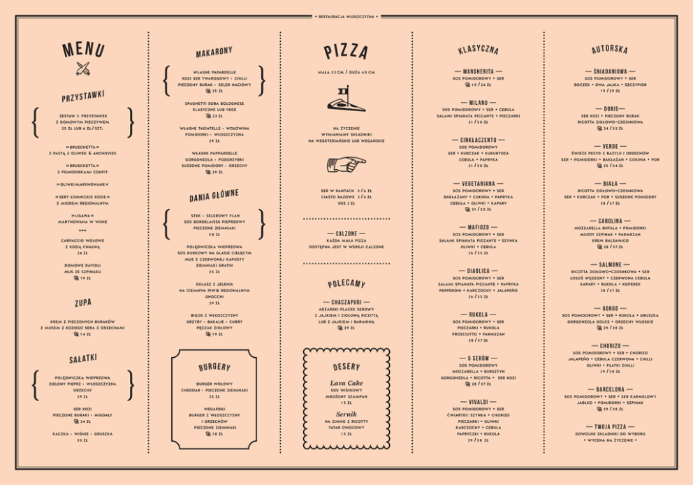 • restauracja włoszczyzna • menu makaron y własne papardelle pizza mała 3 2 cm / duża — m a rgher i ta — 4 0 cm kozi ser twarogowy • chilli sos pomidorowy 1 5 / 2 4 zł pieczony burak • seler naciowy p r z y s taw ki 25 zł » bruschetta « 2 2 zł salami z pastą z oliwek & anchovies » bruschetta « z pomidorkami confit » oliwki marynowane « » sery łomnickie kozie « z miodem regionalnym własne tagiatelle • wołowina na życzenie pomidorki • włoszczyzna wymianiamy składniki 29 zł na wegeteriańskie lub wegańskie własne pappardelle ser 29 zł wne dania głó stek • selerowy flan pieczone ziemniaki ser w rantach 3 / 6 zł ciasto razowe 2 / 4 zł sos 2 zł 5 8 zł — calz one — polędwiczka wieprzowa dostępna jest w wersji calzone carpaccio wołowe każda mała pizza sos kurkowy na glasie cielęcym • kurczak • kukurydza cebula • papryka 2 1 / 3 0 zł ser kozi mus ze szpinaku 1 9 zł ziemniaki gratin świeże pesto z bazylii i orzechów ser • pomidorki • bakłażan • cukinia • por 25 / 3 4 zł — bi a ł a — ricotta ziołowo-czosnkowa ser • kurczak • por • suszone pomidory 2 8 / 3 7 zł — c a rol in a — — m a f io Z o — • ser spianata piccante • szynka oliwki • cebula 2 6 / 3 5 zł sos pomidorowy gulasz z jelenia na ciemnym piwie regionalnym zupa gnocchi 29 zł polecamy — chacz ap u ri — adżarski placek serowy bigos z włoszczyzny z jajkiem i ziołową ricottą krem z pieczonych buraków grzyby • bakalie • curry lub z jajkiem i baraniną z musem z koziego sera z orzechami pęczak ziołowy 1 4 zł s a ł at k i 1 9 zł burgery polędwiczka wieprzowa zielony pieprz • włoszczyzna burger wołowy orzechy cheddar • pieczone ziemniaki 29 zł 25 zł 29 zł młody szpinak krem balsamico 2 8 / 3 7 zł desery Lava Cake 1 5 zł pieczone buraki • migdały burger z włoszczyzny Sernik i orzechów na zimno z ricotty pieczone ziemniaki tatar owocowy 3 5 zł 1 8 zł • ser • czerwona cebula • rukola • koperek 2 8 / 3 7 zł łosoś wędzony kapary — gorgo — — rukol a — sos pomidorowy • ser • ser • rukola • gruszka • orzechy włoskie 29 / 3 8 zł gorgonzola dolce • rukola • parmezan 2 8 / 3 7 zł pieczarki — chor iz o — • ser • chorizo • cebula czerwona • chilli oliwki • płatki chilli 29 / 3 8 zł sos pomidorowy — 5 seró w — jalapeño sos pomidorowy • bursztyn • ricotta • ser 2 8 / 3 7 zł mozzarella gorgonzola kozi sos wiśniowy mrożony szampan wegański kaczka • wiśnie • gruszka ricotta ziołowo-czosnkowa prosciutto ser kozi 2 4 zł • ser salami spianata piccante • papryka pepperoni • karczochy • jalapeño 2 6 / 3 5 zł sos pomidorowy sos pomidorowy • pomidorki • parmezan mozzarella bufala — S A L MONE — — di a bl ic a — 3 5 zł burak — v erde — mus z czerwonej kapusty domowe ravioli • pieczony 2 4 / 3 3 zł sos pomidorowy salami • szczypior ricotta ziołowo-czosnkowa — v ege ta r i a n A — • ser bakłażany • cukinia • papryka cebula • oliwki • kapary 2 1 / 3 0 zł jajka 1 9 / 29 zł — cink ł ac zen t o — suszone pomidory • orzechy sos bordelaisse pieprzowy 2 4 zł • dwa • ser — doris — • ser • cebula spianata piccante • pieczarki 2 1 / 3 0 zł gorgonzola • podgrzybki » ligawa « z kozią chałwą boczek sos pomidorowy marynowana w winie *** sos pomidorowy sos pomidorowy z domowym pieczywem 25 zł lub 6 zł / szt. — ŚNI A DA NIO WA — • ser — mil a no — spaghetti soba bolognese klasyczne lub vege zestaw 5 przystawek autorska klasyczna 1 5 zł — v i va l di — sos pomidorowy ćwiartki: szynka • ser • chorizo • oliwki karczochy • cebula papryczki • rukola 29 / 3 8 zł pieczarki — b a rcel on a — • ser • ser karmelowy • pomidorki • szpinak 29 / 3 8 zł sos pomidorowy jabłko — T w o ja p iz z a — dowolne składniki do wyboru • wycena na życzenie •