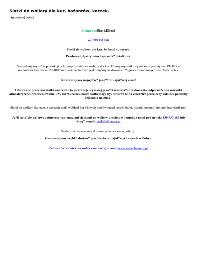 Siatki do woliery dla kur, bażantów, kaczek. [Sprzedam] Usługi LinaremSiatkiSieci tel. 539 937 180 Siatki do woliery dla kur, ba?antów, kaczek. Producent, dystrybutor i sprzeda? detaliczna. Specjalizujemy si? w produkcji ochronnych siatek na woliery dla kur. Oferujemy siatki wykonane z polietylenu PE HD, o wielko?ciach oczek od 20-100mm. Siatki wolierowe wykonujemy na dowolne d?ugo?ci z okre?lonych szeroko?ci rolek. Gwarantujemy najwy?sz? jako?? w najni?szej cenie! Oferowane przez nas siatki wolierowe to gwarancja wysokiej jako?ci materia?u i wykonania, odporno?ci na warunki atmosferyczne, promieniowanie UV, dzi?ki czemu nasze siatki mog? by? stosowane na zewn?trz przez ca?y rok, bez potrzeby ?ci?gania na zim?! Siatki na woliery skutecznie zabezpieczaj? wybiegi kur i innych ptaków przed jastrz?biami, lisami, kunami i innymi drapie?nikami! Je?li jeste?cie pa?stwo zainteresowani naszymi siatkami na woliery prosimy o kontakt z nami pod nr tel.: 539 937 180 lub drog? e-mail: [email protected] Serdecznie zapraszamy do skorzystania z naszej oferty. Gwarantujemy szybk? dostaw? produktów w najni?szych cenach w Polsce. Pe?na oferta siatek na woliery na naszej stronie www.siatki.linarem.pl Informacje dodatkowe Brak Adres ogłoszenia http://www.superoferty24.pl/siatki-do-woliery-dla-kur-bazantow-kaczek,o602 Kontakt Mail: [email protected] Telefon: 539937180 Lokalizacja , Kraków - Cała Polska Małopolskie (Polska) Ogłoszenie dodano: 2016-10-09 17:45:49 Ogłoszenie wygasa: 2017-01-07 17:45:49 Powered by TCPDF (www.tcpdf.org)