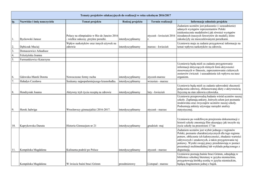 Tematy projektów edukacyjnych do realizacji w roku szkolnym 2016/2017 lp. Nazwisko i imię nauczyciela Temat projektu Rodzaj projektu Termin realizacji 1. Byckowski Janusz Polacy na olimpiadzie w Rio de Janeiro 2016 - wielkie sukcesy ,przykre porażki. interdyscyplinarny Informacje odnośnie projektu Zadaniem uczniów jest pokazanie ( i uzasadnienie) udanych występów reprezentantów Polski (niekoniecznie medalistów) jak również występów styczeń - kwiecień 2016 nieudanych (naszych faworytów do medali), które r. zakończyły sie nieoczekiwanymi porażkami. 2. Dębiczak Maciej Wpływ narkotyków oraz innych używek na zdrowie interdyscyplinarny marzec - kwiecień Uczniowie maja za zadanie przygotować informacje na temat wpływu narkotyków na zdrowie. 3. Domaszewicz Arkadiusz 4. Felsztyńska Joanna 5. Furmankiewicz Katarzyna Uczniowie będą mieli za zadanie przygotowanie informacji dotyczących różnych form aktywności stosowanych w fitnessie, zaprezentowanie ciekawych zestawów ćwiczeń i uzasadnienie ich wpływu na nasz organizm. 6. Gdowska-Marek Dorota Nowoczesne formy ruchu interdyscyplinarny styczeń-marzec 7. Haładyn Czesława Szukamy najpopularniejszego krasnoludka. interdyscyplinarny wrzesien - marzec 8. Hendrysiak Joanna Aktywny tryb życia receptą na zdrowie interdyscyplinarny luty - kwiecień 9. Herok Jadwiga Wrocławscy gimnazjaliści 2016-2017. interdyscyplinarny styczeń - marzec 10. Kaprykowska Danuta Historia Gimnazjum nr 21 interdyscyplinarny grudzień- maj 11. Kempińska Magdalena Kulinarna podróż po Polsce interdyscyplinarny styczeń - marzec Kempińska Magdalena W świecie baśni braci Grimm przedmiotowy Listopad - marzec Uczniowie będą mieli za zadanie udowodnić słuszność połączenia zdrowej, zbilansowanej diety z aktywnością fizyczną na stan zdrowia człowieka. Uczniowie przeprowadzą badania wśród uczniów naszej szkoły. Zaplanują ankiety, których celem jest poznanie środowiska oraz zwyczajów uczniów naszej szkoły. Podsumują ankiety używając narzędzi analizy statystycznej. Uczniowie po wniklliwym przejrzeniu dokumentacji z historii szkoły zmontują film ukazujący jak toczyło się życie szkoły na przestrzeni 17 lat Zadaniem uczniów jest wybór jednego z regionów Polski, poznanie charakterystycznych dla tego regionu potraw, obliczenie ich kaloryczności, zbadanie wartości odżywczych i smakowych, a także przygotowanie tej potrawy. Wyniki swojej pracy przedstawiają w postaci prezentacji multimedialnej lub wykładu połączonego z degustacją. Uczniowie poznają baśnie braci Grimm, odnajdują w bibliotece szkolnej literaturę w języku niemieckim, przygotowują ktrótką scenkę w języku niemieckim, będącą fragmentem jednej z bajek. Tematy projektów edukacyjnych do realizacji w roku szkolnym 2016/2017 lp. Nazwisko i imię nauczyciela 12. Laskowska-Serwin Małgorzata 13. Łazorczyk-Szkudlarska Magdalena 14. Łuszczak Urszula 15. Majcher Janina 16. Małecki Bartosz 17. Niedziałek Anna 18. Noworytto Krzysztof 19. Poprawska-Lech Magdalena 20. Piotrowicz Maria 21. Podgórska Marta 22. Romanowicz Małgorzata 23. Raputa Elżbieta 24. Roos-Krajewska Ewa 25. Sendecka Zyta 26. Beata Sęczkowska-Rudzka 27. 28. Spychała Patrycja Szela Małgorzata Temat projektu Nasze miasto - jak feniks z popiołów Rodzaj projektu interdyscyplinarny Termin realizacji Informacje odnośnie projektu listopad - marzec Uczniowie poznają historię Wrocławia przedwojennego i powojennego. Obiekty niedostępne interdyscyplinarny listopad - kwiecień Czasem w życiu zdarza się tak, że musimy zmierzyć jakiś bardzo duży lub bardzo wysoki przedmiot albo odległość od miejsca, do którego dostęp jest utrudniony. Tradycyjny pomiar jest wtedy niemożliwy. I tu z pomocą przychodzi geometria. Podczas realizacji tego projektu uczniowie będą wykorzystywać różne twierdzenia geometryczne do obmyślenia sprytnych sposobów wykonania pomiarów w takich sytuacjach. Życie szkoły w obiektywie aparatu. interdycyplinarny listopad - maj Przygotowanie prezentacji (power point lub Prezi) listopad - maj Bionika to nauka badająca budowę i zasady działania organizmów oraz ich adaptowanie w technice (zwłaszcza w automatyce) i budowie urządzeń. Zadaniem uczniów jest podanie przykładów takich adaptacji. luty-kwiecień 2017 Zapoznanie się ze związkami chemicznymi znajdującymi się w mydłach oraz proszkach do prania odpowiedzialnymi za usuwanie brudu. Poznanie wpływu składników mydeł i proszków na środowisko przyrodnicze. Uczniowie opracują krótki przewodnik po znanych miejscach Wrocławia w języku angielskim. Bionika - przyroda w służbie nauki. interdyscyplinarny Dlaczego mydła myją, a proszki piorą? przedmiotowy The Rough Guide To Wroclaw językowy luty-kwiecień 2017 Szkoła dla jerzyków. przedmiotowy Listopad - marzec Skały wokół nas przedmiotowy /geografia październik - grudzień Uczeń prowadzi obserwacje otoczenia szkoły, miasta pod kątem zastosowania skał. Wskazuje 10 miejsc, w których w różny sposób wykorzystano skały dokumentuje zadanie m.in wykonując zdjęcia [projekt zalecany uczniom klas I] 28. Szela Małgorzata Tematy projektów edukacyjnych do realizacji w roku szkolnym 2016/2017 lp. Nazwisko i imię nauczyciela 29. Wysokińska Katarzyna 30. Wolniczek Radosław 31. Zarzycka Jolanta Temat projektu Państwa Europy Łacińskiej Rodzaj projektu przedmiotowy / geografia Termin realizacji listopad - grudzień Mocne i słabe strony naszego regionu przedmiotowy / geografia I lub II półrocze GALERIA WIELKICH LUDZI. "Boso ze św. Jadwigą Śląską - patronką m.in Wrocławia oraz pojednania i pokoju" interdyscyplinarny / I lub II półrocze wos, geografia, religia, historia Informacje odnośnie projektu Uczeń przygotowuje się do udziału w Międzygimnazjalnym Konkursie poświęconym krajom: Portugalia, Hiszpania, Francja, Włochy, Rumunia, Mołdawia. Poszerza wiedzę w kategoriach: historia, środowisko przyr