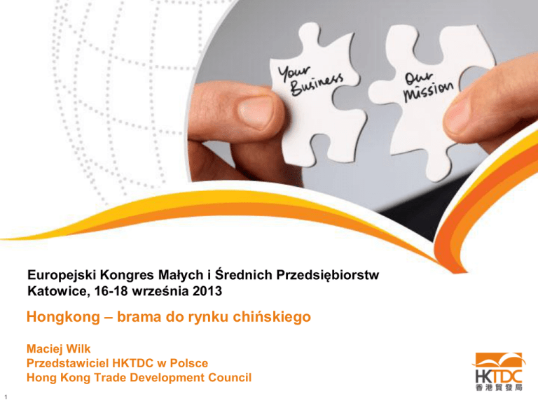 Europejski Kongres Małych i Średnich Przedsiębiorstw Katowice, 16-18 września 2013 Hongkong – brama do rynku chińskiego Maciej Wilk Przedstawiciel HKTDC w Polsce Hong Kong Trade Development Council 1 Chiny – kierunek przemian Wczoraj → fabryka świata Dziś → ogromy rynek konsumencki Jutro → źródło globalnego kapitału Chiny – rynek konsumencki Wzrost sprzedaży detalicznej o 17.1% w 2011 Powiększająca się klasa średnia — 300 milionów Przyspieszenie urbanizacji — przewidywana liczba mieszkańców miast to 1 miliard w 2030 roku! 4 Rosnąca pozycja Chin w globalnej gospodarce Ranking wg. nominalego PKB Szanse dla zagranicznych przedsiębiorstw • szybko rosnący popyt wewnętrzny (2009 - 36%PKB → 2015 – 50%PKB) oraz rozwój sektora usług • rozwój infrastruktury • wzrost zamożności i zwiększona siła nabywcza • wzrost i koncentracja popytu konsumenckiego • rosnące zapotrzebowanie na doradztwo i nowoczesne rozwiązania technologiczne • rosnące zapotrzebowanie na infrastrukturę, sprzęt i usługi medyczne (uniwersalny system opieki zdrowotnej do 2020) • wzrost bezpieczeństwa socjalnego - spadek oszczędności wzrost wydatków na konsumpcję Rynek chiński – szanse i zagrożenia Chiny to jeden z największych i najbardziej perspektywicznych rynków świata, ale... wejście na rynek chiński może być czasochłonne, kosztowne i ryzykowne Główne bariery: 7 • Bariery taryfowe (stawki celne na niekóre towary, w tym artykuły spożywcze są bardzo wysokie) • Ograniczona transparentność systemu i przepisów prawnych • Problemy z weryfikacją wiarygodności partnerów handlowych • Rozbudowana biurokracja i czasochłonne procedury • Niedostateczna ochrona własności intelektualnej • Różnice kulturowe i brak znajomości języka Hongkong – Międzynarodowe Centrum Biznesu • • • • Najbardziej liberalna gospodarka na świecie (wg Heritage Foundation) Jedno z trzech najważniejszych światowych centrów finansowych (obok Londynu i NY) Wolny handel, wolny rynek i niezależne media Główne centrum kapitałowe Chin Harbin Changchun Delhi Calcutta Mumbai Shenyang Shijiazhuang Beijing Dalian Tianjin Seoul Taiyuan Jinan Tokyo Zhengzhou Nanjing Xian Hefei Osaka Chengdu Fukuoka Wuhan Shanghai Chongqing Hangzhou Changsha Nanchang Guiyang Fuzhou Kunming Guangzhou Gulin Dhaka Taipei Hong Kong Haikou Hanoi Bangkok Bangalore Colombe Dostęp do największych rynków Manila Ho Chi Minh City 4 hours Kuala Lumpur Singapore 5 hours Jakarta Dostęp do połowy populacji świata Hongkong & Delta Rzeki Perłowej IDEALNA LOKALIZACJA • Hongkong znajduje się w bezpośrednim sąsiedztwie Delty Rzeki Perłowej • Ponad 50 tys. firm z Hongkongu posiada tu swoje placówki i zakłady produkcyjne, zatrudniając w sumie ok. 9 milionów pracowników PRD: • 56 milionów ludzi • 24% chińskiego importu i eksportu • 9.9% wzrost PKB w 2011 roku Hongkong bramą do rynku chińskiego • System prawny oparty na prawie brytyjskim, ochrona własności intelektualnej • Łatwość zakładania firm (możliwość założenia firmy przez Internet i jeszcze w tym samym dniu rozpoczęcia działalności) • Prosty i przejrzysty system podatkowy (niskie stopy podatkowe: CIT max 16,5%, PIT max 15%), nie ma podatku od zysków kapitałowych, podatku u źródła, podatku Belki, podatku od sprzedaży ani VAT • Międzynarodowe centrum logistyczne i handlowe (największe lotnisko cargo na świecie, status wolnego portu) • Regionalne centrum dystrybucji i zarządzania łańcuchem dostaw (zwłaszcza dla produktów wysokiej wartości i typu time sensitive) Hongkong bramą do rynku chińskiego • Hongkońskie firmy znają kulturę biznesową, specyfikę rynku oraz posiadają sieć powiązań biznesowych w Chinach kontynentalnych • Dobre postrzeganie produktów, marek, usług hongkońskich firm przez klasę średnią w Chinach • Dzięki współpracy z firmami hongkońskimi zagraniczne firmy mogą skorzystać z przywilejów wynikających z umowy o wolnym handlu z Chinami • Język angielski powszechnie stosowany w biznesie Hongkong – centrum kreacji trendów i promocji międzynarodowych marek • • • Wszystkie największe międzynarodowe marki są obecne w Hongkongu Marka która z sukcesem zaistnieje w Hongkongu ma zdecydowanie większe szanse odnieść sukces w Chinach kontynentalnych i innych krajach regionu W każdym tygodniu Hongkong odwiedza ponad 650 tys. turystów z Chin Kolejki pod sklepami luksusowych marek w Hongkongu Polskie marki i produkty w Hongkongu • Prawie 30% produktów sprowadzanych z Polski do Hongkongu jest reeksportowanych 13 Wzrost wymiany handlowej pomiędzy Polską a Hongkongiem US$ Million 1200 1000 800 600 400 200 0 2003 2004 2005 2006 2007 2008 2009 2010 2011 2012 HK Imports from Poland HK Exports to Poland HK-Poland Total Trade (Source: Hong Kong Trade Statistics, Census & Statistics Department) 14 Hongkong & Polska • - Najlepiej sprzedające się polskie produkty: mięso, podroby i artykuły spożywcze (20%), sprzęt telekomunikacyjny (15%) sprzęt i części dla przemysłu (27%). biżuteria , szkło artystyczne • - Szanse na polskich eksporterów szkło artystyczne produkty luksusowe (biżuteria) technologie, ochrona środowiska Hong Kong Trade Development Council • Ponad 40 biur na całym świecie, w tym 12 w Chinach kontynentalnych • Promocja współpracy handlowej pomiędzy Hongkongiem, Chinami i resztą świata • Jeden z największych operatorów targowych w Azji London Frankfurt Beijing Tokyo Hong Kong Bangkok Johannesburg Sydney New York HKTDC – największy organizator targów w Hongkongu 36 imprez targowych w ciągu roku 3 imprezy o randze największych na świecie 6 największych w Azji (pod względem liczby wystawców) Watch & Clock Gifts & Premium Toys & Games Fashion Week F/W Spring Electronics Licensing FILMART Houseware Show Autumn Electronics TARGI BRANŻOWE HKTDC W HONGKONGU • Dofinansowanie d