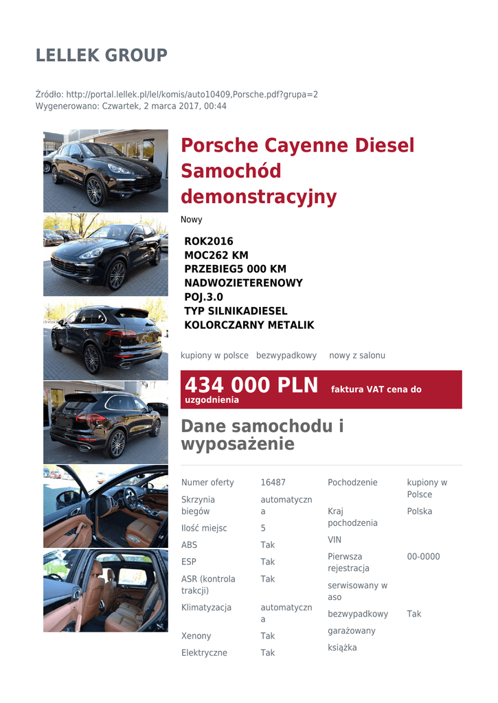 LELLEK GROUP Źródło: http://portal.lellek.pl/lel/komis/auto10409,Porsche.pdf?grupa=2 Wygenerowano: Czwartek, 2 marca 2017, 00:44 Porsche Cayenne Diesel Samochód demonstracyjny Nowy ROK2016 MOC262 KM PRZEBIEG5 000 KM NADWOZIETERENOWY POJ.3.0 TYP SILNIKADIESEL KOLORCZARNY METALIK kupiony w polsce bezwypadkowy 434 000 PLN nowy z salonu faktura VAT cena do uzgodnienia Dane samochodu i wyposażenie Numer oferty 16487 Skrzynia biegów automatyczn a Ilość miejsc 5 ABS Tak ESP Tak ASR (kontrola trakcji) Tak Klimatyzacja automatyczn a Xenony Tak Elektryczne Tak Pochodzenie kupiony w Polsce Kraj pochodzenia Polska VIN Pierwsza rejestracja 00-0000 serwisowany w aso bezwypadkowy garażowany książka Tak szyby Handlowiec Michał Michałowski +48 58 550 911 2 zapytaj mobile +48 696 444 222 Charakterystyka spalania cykl miejski 8.4 l/100km cykl pozamiejski 6.5 l/100km cykl mieszany 7.2 l/100km emisja CO2 189 g/km Gwarancja Gwarancja dostępna Ubezpieczenie Ubezpieczenie dostępne Elektryczne lusterka Tak I właściciel Szyberdach Tak kupiony w salonie Wspomaganie kierownicy Tak tunning Komputer Tak Radioodtwarza cz Tak Alarm Tak Immobilizer Tak Centralny zamek Tak Nawigacja satelitarna Tak Światła przeciwmgieln e Tak Czujnik deszczu Tak Czujniki parkowania Tak Podgrzewane fotele Tak Zaw. pneumatyczne Tak Tempomat Tak 4x4 Tak Alufelgi Tak Miejsce postoju Sopot homologacja stan idealny właściciel niepalący Opis dodatkowy Kredyt Kredyt serwisowa dostępny Kolor nadwozia: Czarny 2T Jet Black Tapicerka wnętrza: LH Black - Cohiba Brown 1N3 Wspomaganie układu kierowniczego Plus 1BK Pneumatyczne zawieszenie z PASM 0TD Dywaniki 3FU Dach panoramiczny 3S1 Relingi dachowe wykończone w aluminium 4F2 Porsche Entry & Drive Zeskanuj kod, aby zobaczyć ofertę online 4KF Przyciemniane szyby 4A3 Podgrzewane fotele z przodu 4D3 Wentylowane fotele 7X8 Asystent parkowania z przodu i z tyłu z kamerą cofania PA2 Automatycznie przyciemniane lusterka PP6 Pakiet komfortowego oświetlenia PE5 Fotele komfortowe 14-pozycyjne z pakietem pamięci 9W5 Przygotowanie do telefonu komórkowego 9VL System nagłośnienia BOSE Surround sound 7T1 Porsche Communication Management z modułem nawigacji 8JE Reflektory Bi-ksenonowe z PDLS U01 21' koła 911 Turbo Design z poszerzeniem nadkoli QR1 Kompas na desce rozdzielczej Informacje od handlowca KONTAKTY: Michał Michałowski | Doradca ds. Sprzedaży E-mail: [email protected] , Telefon: +48 696 444 222 Daniel Komisarczyk | Doradca ds. Sprzedaży E-mail: [email protected] , Telefon: +48 602 312 777 Adam Wąsik | Doradca ds. Sprzedaży E-mail: [email protected] , Telefon: +48 785 911 103 Aleksander Chrzan | Doradca ds. Sprzedaży E-mail: [email protected] , Telefon: +48 605 260 615 Michał Bartoszewicz | Doradca ds. Sprzedaży E-mail: [email protected] , Tel: +48 669 910 911 Informacja nie stanowi oferty w rozumieniu art. 66kc. Podane dane maja charakter wyłącznie informacyjny Nota prawna Informacja nie stanowi oferty w rozumieniu art. 66 Kodeksu Cywilnego. Podane dane mają charakter wyłącznie informacyjny. Pełna informacja dostępna jest u handlowca. Sprzedający nie odpowiada za ewentualne błędy lub nieaktualność ogłoszenia.