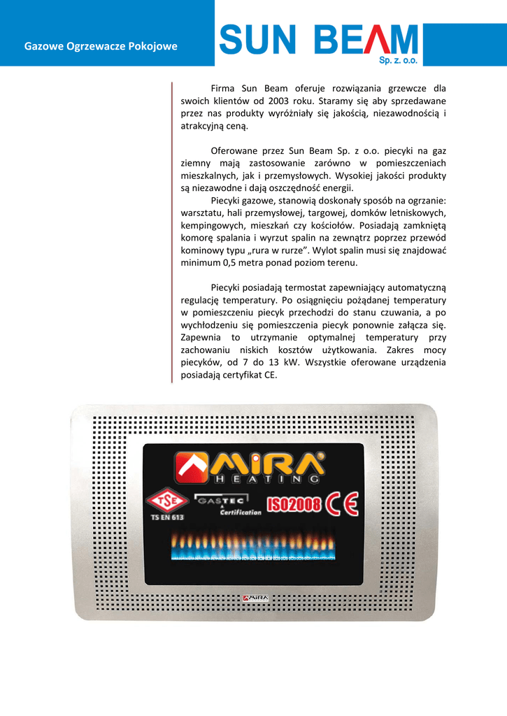 Gazowe Ogrzewacze Pokojowe Firma Sun Beam oferuje rozwiązania grzewcze dla swoich klientów od 2003 roku. Staramy się aby sprzedawane przez nas produkty wyróżniały się jakością, niezawodnością i atrakcyjną ceną. Oferowane przez Sun Beam Sp. z o.o. piecyki na gaz ziemny mają zastosowanie zarówno w pomieszczeniach mieszkalnych, jak i przemysłowych. Wysokiej jakości produkty są niezawodne i dają oszczędność energii. Piecyki gazowe, stanowią doskonały sposób na ogrzanie: warsztatu, hali przemysłowej, targowej, domków letniskowych, kempingowych, mieszkań czy kościołów. Posiadają zamkniętą komorę spalania i wyrzut spalin na zewnątrz poprzez przewód kominowy typu „rura w rurze”. Wylot spalin musi się znajdować minimum 0,5 metra ponad poziom terenu. Piecyki posiadają termostat zapewniający automatyczną regulację temperatury. Po osiągnięciu pożądanej temperatury w pomieszczeniu piecyk przechodzi do stanu czuwania, a po wychłodzeniu się pomieszczenia piecyk ponownie załącza się. Zapewnia to utrzymanie optymalnej temperatury przy zachowaniu niskich kosztów użytkowania. Zakres mocy piecyków, od 7 do 13 kW. Wszystkie oferowane urządzenia posiadają certyfikat CE. H7F1 Moc: 7 kW Zużycie gazu: 0,73 m3/h Wymiary: (wys/głęb/szer) 650x265x700 (mm) H7F2 Moc: 7 kW Zużycie gazu: 0,73 m3/h Wymiary: (wys/głęb/szer) 650x265x700 (mm) H7W1 Moc: 7 kW Zużycie gazu: 0,73 m3/h Wymiary: (wys/głęb/szer) 625x270x770 (mm) H7W2 Moc: 7 kW Zużycie gazu: 0,73 m3/h Wymiary: (wys/głęb/szer) 625x270x770 (mm) H11W4 Moc: 11kW Zużycie gazu: 0,94 m3/h Wymiary: (wys/głęb/szer) 560x270x770 (mm) H11F2 Moc: 11kW Zużycie gazu: 0,94 m3/h Wymiary: (wys/głęb/szer) 620x270x950 (mm) H13MF Moc: 13 kW Zużycie gazu: 1,25 m3/h Wymiary: (wys/głęb/szer) 700x300x1050 (mm) Więcej informacji na www.piecykigazowe.com.pl