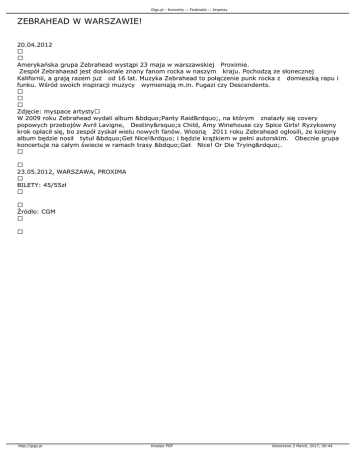 Gigs.pl - Koncerty :: Festiwale :: Imprezy ZEBRAHEAD W WARSZAWIE! 20.04.2012 Amerykańska grupa Zebrahead wystąpi 23 maja w warszawskiej Proximie. Zespół Zebrahaead jest doskonale znany fanom rocka w naszym kraju. Pochodzą ze słonecznej Kalifornii, a grają razem już od 16 lat. Muzyka Zebrahead to połączenie punk rocka z domieszką rapu i funku. Wśród swoich inspiracji muzycy wymieniają m.in. Fugazi czy Descendents. Zdjęcie: myspace artysty W 2009 roku Zebrahead wydali album „Panty Raid”, na którym znalazły się covery popowych przebojów Avril Lavigne, Destiny’s Child, Amy Winehouse czy Spice Girls! Ryzykowny krok opłacił się, bo zespół zyskał wielu nowych fanów. Wiosną 2011 roku Zebrahead ogłosili, że kolejny album będzie nosił tytuł „Get Nice!” i będzie krążkiem w pełni autorskim. Obecnie grupa koncertuje na całym świecie w ramach trasy „Get Nice! Or Die Trying”. 23.05.2012, WARSZAWA, PROXIMA BILETY: 45/55zł Źródło: CGM http://gigs.pl Kreator PDF Utworzono 2 March, 2017, 00:44