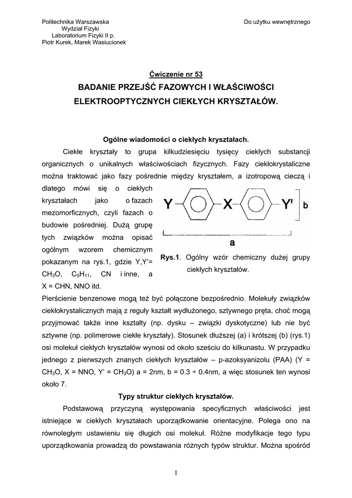 Politechnika Warszawska Wydział Fizyki Laboratorium Fizyki II p. Piotr Kurek, Marek Wasiucionek Do użytku wewnętrznego Ćwiczenie nr 53 BADANIE PRZEJŚĆ FAZOWYCH I WŁAŚCIWOŚCI ELEKTROOPTYCZNYCH CIEKŁYCH KRYSZTAŁÓW. Ogólne wiadomości o ciekłych kryształach. Ciekłe kryształy to grupa kilkudziesięciu tysięcy ciekłych substancji organicznych o unikalnych właściwościach fizycznych. Fazy ciekłokrystaliczne można traktować jako fazy pośrednie między kryształem, a izotropową cieczą i dlatego mówi kryształach się o ciekłych jako o fazach mezomorficznych, czyli fazach o budowie pośredniej. Dużą grupę tych związków ogólnym można wzorem opisać chemicznym pokazanym na rys.1, gdzie Y,Y’= CH3O, C5H11, CN i inne, Rys.1. Ogólny wzór chemiczny dużej grupy ciekłych kryształów. a X = CHN, NNO itd. Pierścienie benzenowe mogą też być połączone bezpośrednio. Molekuły związków ciekłokrystalicznych mają z reguły kształt wydłużonego, sztywnego pręta, choć mogą przyjmować także inne kształty (np. dysku – związki dyskotyczne) lub nie być sztywne (np. polimerowe ciekłe kryształy). Stosunek dłuższej (a) i krótszej (b) (rys.1) osi molekuł ciekłych kryształów wynosi od około sześciu do kilkunastu. W przypadku jednego z pierwszych znanych ciekłych kryształów – p-azoksyanizolu (PAA) (Y = CH3O, X = NNO, Y’ = CH3O) a = 2nm, b = 0.3 ÷ 0.4nm, a więc stosunek ten wynosi około 7. Typy struktur ciekłych kryształów. Podstawową przyczyną występowania specyficznych właściwości jest istniejące w ciekłych kryształach uporządkowanie orientacyjne. Polega ono na równoległym ustawieniu się długich osi molekuł. Różne modyfikacje tego typu uporządkowania prowadzą do powstawania różnych typów struktur. Można spośród 1 nich wyróżnić: nematyki i smektyki oraz ich odmiany chiralne – nematyki chiralne i smetyki chiralne. Nematyki. W tych związkach jedynym ograniczeniem ułożenia molekuł jest warunek równoległości ich długich osi. W nematykach istnieje jednak pewien rozrzut kierunków długich osi ze względu na drgania termiczne. Średni kierunek długich osi molekuł jest wyznaczony wektor przez jednostkowy uporządkowania n (rys.2). nematyków jest mała, Lepkość Rys.2. Schemat struktury nematyka. porównywalna z lepkością mleka. Nematyki chiralne. W tworzą tym przypadku quasi-warstwy, molekuły przy czym długie osie molekuł są skierowane równolegle względem warstw. Cechą charakterystyczną tej grupy jest to, że średnie kierunki ułożenia długich osi molekuł, w obrębie pozostając pojedynczej równoległe warstwy ulegają skręceniu o niewielki kąt przy przejściu do warstw sąsiednich (rys.3). Przyczyną tego skręcenia jest Rys.3. Skręcenie molekuł w kolejnych warstwach nematyka chiralnego. występowanie w molekułach nematyków chiralnych bocznych grup atomowych, powodujących, że najkorzystniejszym energetycznie ułożeniem molekuł z sąsiednich warstw jest ułożenie ukośne. Skręcenie prowadzi do helikoidalnej struktury tych ciekłych kryształów. Skok helisy zależy od wielu czynników takich jak np. temperatura, może wynosić od 200nm do około 5000 nm. W większości przypadków w miarę wzrostu temperatury ten skok początkowo szybko maleje, po czym szybko ustala się, choć są materiały, w których ta zależność temperaturowa jest przeciwna. Fakt, że skok helisy jest porównywalny z długością fal świetlnych z zakresu światła widzialnego (400 ÷ 700nm), prowadzi do zjawiska odbicia w warstwach nematyków chiralnych światła o określonej długości fali i powstania charakterystycznych dla nich 2 czystych, metalicznych barw, zmieniających się z temperaturą. Lepkość ciekłych kryształów z tej grupy jest dużo większa niż lepkość nematyków. Smektyki. Cechą wspólną smektyków jest to, że molekuły, będąc równoległe względem siebie tworzą warstwy. Znanych jest szereg odmian smetyków z których najważniejsze to: - smektyki A, w których długie osie molekuł ustawione są prostopadle do warstw (rys.4) ale wewnątrz warstw molekuły mogą się bezładnie przemieszczać, tworząc Rys.4. Schemat struktury smetyka 2-wymiarową ciecz. - smektyki B, w których, w odróżnieniu od smetyków A, molekuły tworzą wewnątrz warstw struktury uporządkowane przypominające 2-wymiarowy kryształ. Jest to rzadziej spotykany typ struktury. - smektyki C, popularny typ smektyków, które od smetyków A różnią się tym, że długie osie molekuł są ustawione ukośnie do warstw. Molekuły rozmieszczone są wewnątrz warstw w sposób bezładny. - smektyki chiralne, w związkach tej grupy mamy do czynienia ze strukturą warstwową. Molekuły w warstwie są pochylone, a kąt pochylenia waha się między 13° a 50° . Dodatkowo kierunek pochylenia w kolejnych warstwach ulega skręceniu wokół osi prostopadłej do warstw. Struktura taka wykazuje istnienie lokalnej spontanicznej polaryzacji elektrycznej, która pozwala na sterowanie właściwościami elektrycznymi warstw ciekłokrystalicznych przy pomocy zewnętrznego pola elektrycznego. Do tej grupy należą ferroelektryczne ciekłe kryształy znajdujące zastosowanie w przetwarzaniu obrazów. Lepkość smektyków jest na ogół większa niż lepkość nematyków i nematyków chiralnych, mogąc osiągać wartości porównywalne z lepkością wosku. Przejścia fazowe w ciekłych kryształach pod wpływem ogrzewania. Ciekłe kryształy powstające w wyniku stopienia fazy krystalicznej lub ochłodzenia cieczy izotropowej, czyli w rezultacie przemian termicznych, nazywamy termotropowymi ciekłymi kryształami. Innym sposobem otrzymania struktur ciekłokrystalicznych jest mieszanie pewnych rozpuszczalników z określonymi 3 substancjami organicznymi. Fazy, które można uzyskać tylko na tej drodze liotropowymi ciekłymi kryształami. (W dalszym ciągu będzie mowa tylko o związkach termotropowych). Ciekłe kryszta