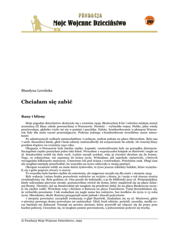 Blandyna Lewińska Chciałam się zabić Rany i blizny Moje pogodne dzieciństwo skończyło się 1 września 1939. Skończyłam 8 lat i wkrótce miałam zostać uczennicą III klasy szkoły powszechnej w Warszawie. Niestety – wybuchła wojna. Piekło, jakie wtedy przeżywałam, głęboko wryło mi się w pamięć i psychikę. Naloty, bombardowania w płonącej Warszawie były dla mnie czymś przerażającym. Podczas jednego z bombardowań straciliśmy nasze mieszkanie. Po zakończonych walkach zamieszkaliśmy w jednym, małym pokoju na placu Mirowskim. Było nas 7 osób. Straszliwa bieda, głód i brak odzieży uniemożliwiły mi uczęszczanie do szkoły. Do trzeciej klasy poszłam dopiero we wrześniu 1941 roku. Okupacja w Warszawie była bardzo ciężka. Łapanki, rozstrzeliwania były na porządku dziennym. Szczególnie ciężko przeżyłam jeden taki dzień. Wracałam z wypożyczalni książek ze Starówki i nagle na ul. Senatorskiej zrobił się duży ruch. Ludzie zaczęli uciekać, więc ja również skryłam się do bramy. Tego, co zobaczyłam, nie zapomnę do końca życia. Widziałam, jak zajechały ciężarówki, z których wyciągnięto kilkunastu mężczyzn. Ustawiono ich pod ścianą i rozstrzelano. Przeżyłam szok. Długi czas nie mogłam tamtędy przechodzić, bo wszystko na nowo odżywało w mojej pamięci. Okropne wrażenie robiły na mnie dzieci żydowskie, te żywe jeszcze szkielety ludzkie, które wymykały się z getta poprzez otwory w murze. To wszystko było bardzo ciężkie do zniesienia, ale najgorsze zaczęło się dla mnie 1 sierpnia 1944. Były wakacje i mimo braku pozwolenia rodziców na wyjście z domu, ja i moja o rok starsza siostra wymknęłyśmy się. Była godzina 16. Ona poszła do koleżanki, a ja do biblioteki przy ul. Świętojańskiej, kiedy usłyszałam pierwsze strzały, postanowiłam wrócić do domu, który znajdował się na placu Żelaznej Bramy. Niestety; już na Senatorskiej nie mogłam się przedrzeć dalej, bo na placu Bankowym zaczęły się ciężkie walki. Wróciłam więc i skryłam w Ratuszu na placu Teatralnym. Tutaj dowiedziałam się, że wybuchło powstanie. I tak znalazłam się nagle sama bez rodziców, bez środków do życia w 13 roku życia. Mieszkańcy okolic Ratusza przygarnęli mnie jednak i dawali pożywienie. 7 sierpnia powstańcy zarządzili ewakuację w głąb Starówki. Znalazłam się na ul. Mostowej, gdzie w piwnicy pewnego domu pozwolono mi zamieszkać. Głód, brak odzieży, pościeli, ręcznika, mydła coraz bardziej mi dokuczał. Pomógł mi pewien sierżant, który pozwolił mi włączyć się do pracy przy kuchni polowej. Cieszyłam się, że mogłam pomóc powstańcom, a jednocześnie pożywić się trochę. © Fundacja Moje Wojenne Dzieciństwo, 1999 Blandyna Lewińska, Chciałam się zabić 2 W dniu 13 sierpnia przeżyłam szok, który na długo pozostawił ślad w mojej psychice. Otóż chłopcy z Szarych Szeregów zdobyli pierwszy czołg niemiecki. Radość była ogromna. Masa dzieciaków ze Starówki, a wśród nich i ja, biegła za sunącym w kierunku Podwala czołgiem. Podczas tego biegu rozleciał mi się sandał (drewniak) i nie mogąc dalej iść, wróciłam do mieszkającego opodal szewca. W tym czasie, gdy uprzejmy szewc reperował mi sandał, usłyszałam potężny huk. Wyszłam na ulicę i zobaczyłam, jak ludzie biegną w kierunku Podwala. Pobiegłam i ja. To, co zobaczyłam, wprawiło mnie w straszny stan przerażenia. Wszędzie na ulicy, na pobliskich domach, balkonach leżały i wisiały szczątki ludzi, ich nogi, ręce i kawałki ciał. „Zdobyczny” czołg okazał się pułapką, zawierającą bombę zegarową. Ten silny wstrząs, ciągła strzelanina i bombardowania, coraz większy głód, brak środków higieny (wszawica) sprawiły, że załamywałam się coraz bardziej. Powoli traciłam nadzieję na przeżycie tego piekła, jakie rozpętało się na Starówce. Najgorszy jednak stał się dzień 26 sierpnia, kiedy podczas kolejnego nalotu dwie bomby spadły na dom, w którym przebywałam. Nagle cały dom runął na mnie. Pochłonęła mnie ciemność i straszliwie gęsty kurz, który zatykał mi gardło, nos i oczy. Leżałam na podłodze, ale koło mnie było trochę luzu, tak jak bym znalazła się w jakiejś skrzyni. Zrozumiałam, że przecież ja leżę pod kozetką, która przewracając się na nogi, zebrała na siebie cały gruz, chroniąc mnie przed śmiercią. Wokół słyszałam krzyki i jęki rannych, ludzie dusili się. W pewnym momencie poczułam, że pryska na mnie strumień wody z pękniętej rury wodociągowej. Całymi garściami chłonęłam tę wodę, uzyskując w ten sposób trochę tlenu. Po jakimś czasie, który wydawał mi się wiecznością, zobaczyłam maleńki promyk światła. Zaczęto nas odkopywać. Doczołgałam się w tym kierunku i wydostałam na zewnątrz. Miałam zranioną nogę. Z czterdziestu osób, które przebywały wraz ze mną w piwnicy, ocalało tylko siedem. Kiedy dowlokłam się do pobliskiego budynku, byłam tak rozpalona, że przy polewaniu wodą, buchała ze mnie para. Nowy kąt, jaki znalazłam, był w sklepie przy ul. Długiej róg Freta. W trzy dni potem, gdy wyszłam na podwórko do znajdującej się tam studni, zostałam silnie rzucona na ścianę przez podmuch ciężkiego pocisku. Straciłam przytomność, ale po pewnym czasie odzyskałam ją. 2 września dotarli do nas Niemcy, a właściwie własowcy. W rękach mieli miotacze ognia i krzycząc, wyciągali ludzi z piwnic i różnych zakamarków. Nie czekając, aż wszyscy się wydobędą, mimo że słyszeli jęki i krzyki pozostałych tam jeszcze ludzi, puszczali strumień ognia w ich kierunku. To było prawdziwe piekło. Potem ustawiono nas w szeregu i ściągano pierścionki, obrączki i inne kosztowności. Następnie pognano nas w kierunku Woli. Droga przez palącą się zgruzowaną Warszawę była dla mnie straszliwą udręką. Umęczona, z raną na nodze, wlokłam się, wydob