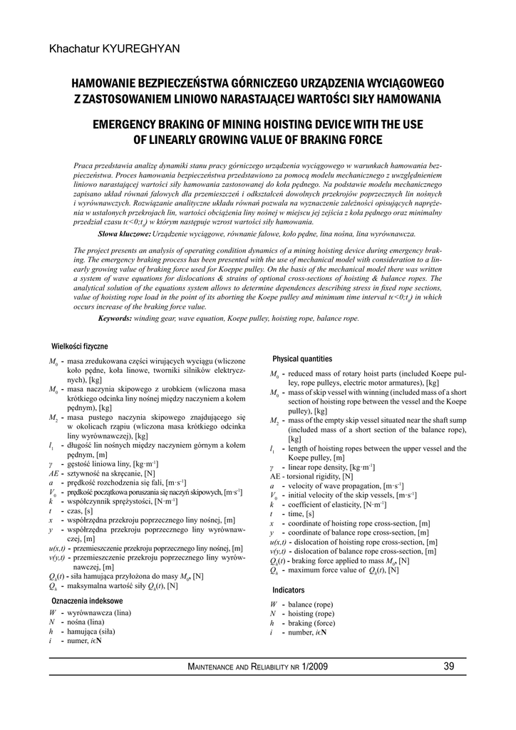 Khachatur KYUREGHYAN HAMOWANIE BEZPIECZEŃSTWA GÓRNICZEGO URZĄDZENIA WYCIĄGOWEGO Z ZASTOSOWANIEM LINIOWO NARASTAJĄCEJ WARTOŚCI SIŁY HAMOWANIA EMERGENCY BRAKING OF MINING HOISTING DEVICE WITH THE USE OF LINEARLY GROWING VALUE OF BRAKING FORCE Praca przedstawia analizę dynamiki stanu pracy górniczego urządzenia wyciągowego w warunkach hamowania bezpieczeństwa. Proces hamowania bezpieczeństwa przedstawiono za pomocą modelu mechanicznego z uwzględnieniem liniowo narastającej wartości siły hamowania zastosowanej do koła pędnego. Na podstawie modelu mechanicznego zapisano układ równań falowych dla przemieszczeń i odkształceń dowolnych przekrojów poprzecznych lin nośnych i wyrównawczych. Rozwiązanie analityczne układu równań pozwala na wyznaczenie zależności opisujących naprężenia w ustalonych przekrojach lin, wartości obciążenia liny nośnej w miejscu jej zejścia z koła pędnego oraz minimalny przedział czasu tϵ<0;t0) w którym następuje wzrost wartości siły hamowania. Słowa kluczowe: Urządzenie wyciągowe, równanie falowe, koło pędne, lina nośna, lina wyrównawcza. The project presents an analysis of operating condition dynamics of a mining hoisting device during emergency braking. The emergency braking process has been presented with the use of mechanical model with consideration to a linearly growing value of braking force used for Koeppe pulley. On the basis of the mechanical model there was written a system of wave equations for dislocations & strains of optional cross-sections of hoisting & balance ropes. The analytical solution of the equations system allows to determine dependences describing stress in fixed rope sections, value of hoisting rope load in the point of its aborting the Koepe pulley and minimum time interval tϵ<0;t0) in which occurs increase of the braking force value. Keywords: winding gear, wave equation, Koepe pulley, hoisting rope, balance rope. Wielkości fizyczne M0 - masa zredukowana części wirujących wyciągu (wliczone koło pędne, koła linowe, tworniki silników elektrycznych), [kg] M0 - masa naczynia skipowego z urobkiem (wliczona masa krótkiego odcinka liny nośnej między naczyniem a kołem pędnym), [kg] M2 - masa pustego naczynia skipowego znajdującego się w okolicach rząpiu (wliczona masa krótkiego odcinka liny wyrównawczej), [kg] l1 - długość lin nośnych między naczyniem górnym a kołem pędnym, [m] γ - gęstość liniowa liny, [kg·m-1] AE - sztywność na skręcanie, [N] a - prędkość rozchodzenia się fali, [m·s-1] V0 - prędkość początkowa poruszania się naczyń skipowych, [m·s-1] k - współczynnik sprężystości, [N·m-1] t - czas, [s] x - współrzędna przekroju poprzecznego liny nośnej, [m] y - współrzędna przekroju poprzecznego liny wyrównawczej, [m] u(x,t) - przemieszczenie przekroju poprzecznego liny nośnej, [m] v(y,t) - przemieszczenie przekroju poprzecznego liny wyrównawczej, [m] Qh(t) - siła hamująca przyłożona do masy M0, [N] Qh - maksymalna wartość siły Qh(t), [N] Oznaczenia indeksowe W N h i - wyrównawcza (lina) nośna (lina) hamująca (siła) numer, iϵN Physical quantities M0 - reduced mass of rotary hoist parts (included Koepe pulley, rope pulleys, electric motor armatures), [kg] M0 - mass of skip vessel with winning (included mass of a short section of hoisting rope between the vessel and the Koepe pulley), [kg] M2 - mass of the empty skip vessel situated near the shaft sump (included mass of a short section of the balance rope), [kg] l1 - length of hoisting ropes between the upper vessel and the Koepe pulley, [m] γ - linear rope density, [kg·m-1] AE - torsional rigidity, [N] a - velocity of wave propagation, [m·s-1] V0 - initial velocity of the skip vessels, [m·s-1] k - coefficient of elasticity, [N·m-1] t - time, [s] x - coordinate of hoisting rope cross-section, [m] y - coordinate of balance rope cross-section, [m] u(x,t) - dislocation of hoisting rope cross-section, [m] v(y,t) - dislocation of balance rope cross-section, [m] Qh(t) - braking force applied to mass M0, [N] Qh - maximum force value of Qh(t), [N] Indicators W N h i - balance (rope) hoisting (rope) braking (force) number, iϵN MAINTENANCE AND RELIABILITY NR 1/2009 39 NAUKA I TECHNIKA 1. Wprowadzenie 1. Introduction W pracy rozważono fizyczny model wielolinowego urządzenia wyciągowego (rys. 1), w skład którego wchodzą koło pędne w układzie wieżowym, dwa naczynia skipowe, liny nośne i wyrównawcze. W cyklu normalnej pracy urządzenia w czasie załadunku jednego ze skipów drugi jest rozładowywany i odwrotnie, ponadto parametry kinematyczne układu w czasie podnoszenia naczynia załadunkowego są identyczne jak przy opuszczania naczynia pustego. Na cykl normalnej pracy opisanego urządzenia wyciągowego składają się następujące etapy: 1) załadunek, 2) rozruch z podszybia naczynia załadunkowego, 3) jazda ustalona naczynia pełnego, 4) hamowanie przy dojeździe do nadszybia, 5) wyładunek, 6) rozruch przy opuszczaniu pustego naczynia z nadszybia, 7) hamowanie przy dojeździe do podszybia. In the project the physical model of multi-rope hoisting device has been considered (Fig. 1). It consists of the Koepe pulley in tower system, two skip vessels, hoisting & balance ropes. In normal cycle of the device work during loading one skip, the second is being unloaded and the other way round. Moreover kinematic parameters of the system during lifting the loading vessel are identical like during lowering the empty vessel. The cycle of normal work of the mentioned hoisting device consists of the following stages: 1) loading, 2) starting from pit bottom of the loading vessel, 3) fixed run of the full vessel, 4) braking while approaching the shaft top, 5) unloading, 6) starting while lowering the empty vessel from the shaft top, 7) braking while approaching the pit bottom. Normalna praca, której schemat przedstawiono powyżej, Normal work, which scheme is presented abov