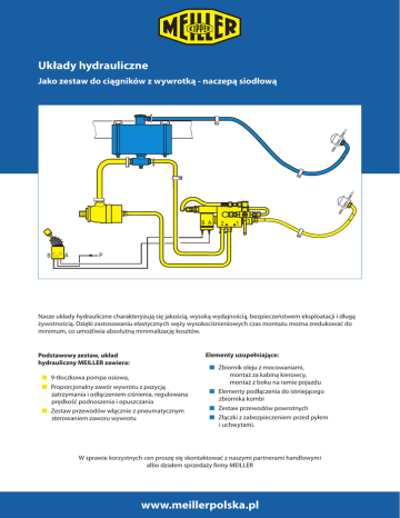 Układy hydrauliczne Jako zestaw do ciągników z wywrotką - naczepą siodłową B A B A 2 1 3 P Nasze układy hydrauliczne charakteryzują się jakością, wysoką wydajnością, bezpieczeństwem eksploatacji i długą żywotnością. Dzięki zastosowaniu elastycznych węży wysokociśnieniowych czas montażu można zredukować do minimum, co umożliwia absolutną minimalizację kosztów. Elementy uzupełniające: Podstawowy zestaw, układ hydrauliczny MEILLER zawiera: I9-tłoczkowa pompa osiowa, IProporcjonalny zawór wywrotu z pozycją zatrzymania i odłączeniem ciśnienia, regulowana prędkość podnoszenia i opuszczania IZestaw przewodów włącznie z pneumatycznym sterowaniem zaworu wywrotu IZbiornik oleju z mocowaniami, montaż za kabiną kierowcy, montaż z boku na ramie pojazdu IElementy podłączenia do istniejącego zbiornika kombi IZestaw przewodów powrotnych IZłączki z zabezpieczeniem przed pyłem i uchwytami. W sprawie korzystnych cen proszę się skontaktować z naszymi partnerami handlowymi albo działem sprzedaży firmy MEILLER www.meillerpolska.pl Od :Do: Meiller Polska Sp. z o.o. ul .Grabska 11 c 32-005 Niepołomice Numer klienta: ❑ Zapytanie ❑ Zamówienie Typ pojazdu:................................................................................. Skrzynia biegów:........................................................................ Typ układu hydraulicznego: Pompa l/min .............. ❑ ❑ ❑ ❑ Układ wysokiego ciśnienia 275 bar ❑ Przesuwana podłoga Układ niskiego ciśnienia 150 bar ❑ Przesuwana podłoga + wywrotka Instalacja kombi (wysokie i niskie ciśnienie) Przewód powrotny w połączeniu ze zbiornikiem oleju / filtrem powrotnym Zbiornik oleju: Montaż za kabiną kierowcy Montaż z boku ❑ Pojemność użytkowa 130 l 1000x260x620 ❑ Poj. użytkowa 120 l 400x636x706 (aluminium) ❑ Pojemność użytkowa 180 l 1300x260x620 ❑ Pojemność użytkowa 130 l 490x620x600 ❑ Poj. użytkowa 154 l 500x636x706 (Aluminium) ❑ Uchwyty mocujące ❑ Pojemność użytkowa 180 l 660x620x600 ❑ Filtr powrotny ❑ Filtr powrotny Elementy przyłączeniowe do istniejącego zbiornika typu kombi ❑ bez filtra powrotnego ❑ z filtrem powrotnym Złącza włącznie z zabezpieczeniem przed kurzem i listwą montażową: ❑ Techno-Chemie Typ 60/61 ❑ Hyva / Edbro G 1" ❑ Argus Typ HDK DN 20 ❑ Argus Typ RK DN 16 ❑ Argus Typ AK DN 16 Akcesoria: ❑ Odbój węża ❑ Konsola do złączy ❑ Konsola i płyta mocująca w połączeniu ze zbiornikiem oleju za kabiną kierowcy ❑ Ramię wychylne ❑ Uchwyt zaworu przechylania ❑ Uchwyt nadajnika w kabinie kierowcy .......................................................................................................................................................................................................................................................................... Termin dostawy: .................................................................................... Miejsce, data: .............................................................................................. ...................................................................................................................... Pieczęć firmowa, podpis MEILLER Polska Sp z o.o. ul. Grabska 11 c · 32-005 Niepołomice Telefon +48 12 6884 200 · Telefax +48 12 6884 201 · [email protected] · www.meillerpolska.pl Druk nr 0814_Pl-761-1112 Inne: ............................................................................................................................................................................................................................................................
