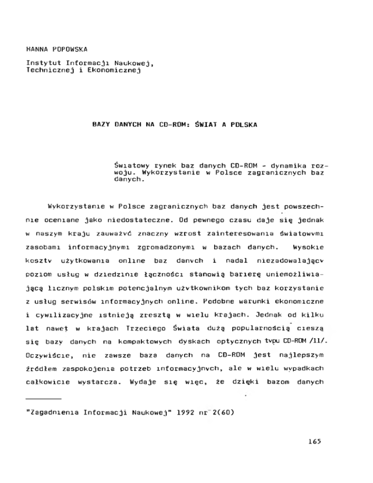 HANNA POPOWSKA Instytut Informacji Naukowej, Technicznej i Ekonomicznej BAZY DANYCH NA CD-ROM: ŚWIAT A PDLSKA Światowy rynek baz danych CD-ROM - dynamika ro z woju. Wykorz ys ta ni e w Polsce z a gr an ic zn yc h baz danych. Wykorzystanie w Polsce z a gr an ic zn yc h baz danych jest p o w s z e c h nie oceniane jako niedostateczne. w naszym kraju zasobami informacyjnymi kosztv zauważyć użytkowania znaczny Od pewnego czasu daje się jednak wzrost za in teresowania zgromadzonymi online poziom usług w dziedzinie baz w bazach danvch łączności i światowymi danych. nadal Wysokie niezadowalający stanowią barierę u n i e m o ż l i w i a jącą licznym polskim pote nc ja ln ym u ż yt ko wn ik om tych baz korzystanie z usług serwisów informacyjnych online. i cywilizacyjne lat nawet się bazy w krajach danvch Oczywiście, istnieją nie na zresztą Trzeciego zawsze baza wystarcza. Wydaje wielu Świata ko mpaktowych źródłem zaspokojenia potrzeb całkowicie w Podobne warunki ekonomiczne dużą dyskach danych krajach. na więc, od kilku popu la rn oś ci ą cieszą optycznych tvpu CD-RDM /II/. CD-ROM informacyjnych, się Jednak że jest najlepszym ale w wielu wypadkach dzięki bazom danych "Zagadnienia Informacji Naukowej" 1992 nr 2(60) 165 na CD-ROM możliwa jest znaczna poprawa naszej sytuacji w dziedzi nie korzystania ze światowych zasobów informacyjnych. ŚWIATOWY RYNEK BAZ DANYCH NA CD-ROM Dferta światowego rynku baz danych jest bogata i z r óż ni co wa na. Bazy danych nych, należą których do rola tych dziedzin i znaczenie produktów i usług informacyj stale wzrasta, a wszystko wskazuje na to, że w przyszłości ta tendencja się utrzyma. Niżej przytoczymy kilka danych liczbowych ilustrujących rozwój światowego rynku baz danych, a zwłaszcza baz danych na CD-RDM. Bazy danych są powszechnie dostępne od połowy lat sześćdziesią tych, w 1965 r. na święcie udostępniano kilkanaście (12-20) baz danych. Początkowo bazy danych byłv wykorzystywane pośr ed ni m (wsadowym, do u t rz ym uj ąc eg o bazę danych, ośrodka nie, a następnie offline}: wyniki użytkownicy tylko w przesyłali trybie pytania gdzie realizowano w y sz uk iw a przekazywano użytkownikom. Dczywiście. w trybie po średnim dokonywano wówczas zarówno RWI (retrospektywnego wyszukiwania informacji), informacji). Przy był możliwości proces długo nia Stosunkowo i SDI wcześnie użytkownik natychmiastowego ujemnie Stanowiło baz danych: (selektywnej wyszukiwaniu (co wpływało czekać na odpowiedź. (wówczas i bezpośredniego, wość wykorzystania nowym wsadowym wyszukiwania offline. jak na pozbawiony ingerowania jego jakość) w i musiał to podstawowe wady wy szukiwa wprowadzono użytkownik także i drugą m o ż l i otrzymywał od dysponenta zazwyczaj o d producenta) bazy jej kopię na nośniku ma sz y przetwarzał ją na własnym komputerze. baz danych wy ko rzystywano taśmy magnetyczne. 166 dystrybucji Do dystrybucji is miarę zachodziły któifc; upływu liczne wywarły czasu w zmianv, istotny informacji, zarówno wpływ na inf orir.atvce ilościowe, rvnek baz jak i i danych. Łączności jakościowe, Dwie z nich zdecydowanie zmieniły sytuację w dziedzinie baz danych: w w USA początkach komercyjne (online), w lat siedem dz ie si ąt yc h ud ostępnianie połowie 1st baz danych w trybie si ed em dz ie si ąt yc h sposób użytkowania baz danych (1972 (lata r.) rozpoczęto be zp oś re dn im 1974/75) ten stał się dostępny także użytkownikom w Europie Zachodniej, w t‘dz 1985 danych CD-RDM na r. zapoczątkowano dvskach udostępniono w ko me rc yj ne ro zp ow sz ec hn ia ni e optycznych'‘tvpu CD-ROM. USA, samvm ale w tvm Pi erwsze roku bazv można na było z ■uch korzystać w Europie Zachodniej. Przypomnijmy, 3ą to że dyski kompaktowe umożliwiającą dyski tylko CD-ROM (Compact Disk Read Dnly Memory) optyczne, odczyt stanowiące utrwaleń i tzw. informacji. pamięć Zaletą stałą, pamięci lypu CD-ROM jest duża pojemność (duża gęstość zapisu w przeliczeniu na jednostkę trwałością cechv i powierzchni nośnika). odpornością na powodująj że bazy na Dyski czynniki CD-ROM są CD-ROM odznaczają zewnętrzne. dużą Wszystkie wygo dn ie js ze się te w rozpow szechnianiu niż bazy na innych nośnikach. W 1985 dwie na r.: bazv CD-ROM, r. na w udostępniano CD-RDM, 1987 3699 baz online prawie 2500 baz danych online w następnym r.: 3370 i 328 na baz roku: 2900 online CD-RDM. l baz 135 w 1989 online na r.: i tylko i o k . 50 CD-ROM, w 1988 4062 bazv online i 753 na CD-ROM /6/. Na początku 1992 r. można już. było korzystać z ponad 2200 baz danych na CD-ROM - w siódmvm wydaniu katalogu TFPL "The CD-ROM 167 Directory 19 92” porównania danvch. - w / 2/ uwzględniono 2212 tvm samym udostępniano czasie baz na tym nośniku. online Z 2212 baz danych omówionych w katalogu TFPL: dukowano w USA, Kanadzie i Ameryce Łacińskiej, Dla 5403 bazy 61,5% w y p r o 31,5% w Europie, 6,6% w Azji. Przewiduje będzie się, że udos tę pn ia ny ch w połowie tego komercyjnie na ich liczba zwiększy się do ok. 6440. zy w (opracowane 1993 r. przez więcej Optical baz roku CD-ROM, 4000 a pod baz danych koniec roku Jeżeli sprawdzą się te pr og no Publishing danych ok. będzie Association), dostępnych na to juz CD-ROM niż online /6/. Światowy oc eniano na opracowane nego 58 kome rc yj ny 440 przez - European min ECU ECU, Ośrodek na Japonię, baz danych na na na drugim miejscu zajmują procent (0,7 %) przypada wana tej jest zaledwie roku szacuje pięciu lat pół kraje /1 00. Z tej kwotv Ws pólnotv Europejskiej, Tak więc, przodują mniej pozostałe 1,4 min 22,2 min baz się na 1,7 mld USD /4,5/. liczba sprzedawanych (20,45%), niż kraje jeden świata. egzemplarzy 245 min USD. Na rok baz 1996 p r og no zo danych, a wartość Tak więc, rocznie min Zjednoczone Japonia a 90 w prenumeracie Stany się (13,18%), ponad ok. (dane Observatory, wszvstkie sprzedaż USD Informacyj na