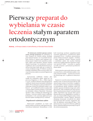 CDP0310_38-40_Jadad 13.09.10 10:18 Seite 1 I Praktyka _ Opis produktu Pierwszy preparat do wybielania w czasie leczenia stałym aparatem ortodontycznym Autorzy _ dr Enrique Jadad, dr Jaime Montoy, dr Gonzalo Arana Gordillo _W niniejszym artykule opisano zastosowanie nowego preparatu do wybielania zębów. Preparat ten wybiela zębinę, działając pod różnymi kątami i we wszystkich kierunkach. Dociera w miejsca pod zamkami ortodontycznymi i dzięki temu umożliwia wybielanie zębów pod aparatem. Pacjenci bardzo chętnie korzystają z tej możliwości zarówno w gabinecie, jak i w warunkach domowych, ponieważ chcą mieć białe zęby już w trakcie leczenia ortodontycznego. W efekcie uzyskano technikę wybielania, która wywiera także znaczący korzystny wpływ na nawyki higieniczne pacjenta. Zastosowanie nadtlenku wodoru jako środka do wybielania zębów opisał po raz pierwszy Kingsbury w 1861 r. Abbot napisał w 1918 r., że lekarze dentyści chcą dysponować szybkimi i skutecznymi metodami wybielania zębów. W tej samej pracy autor przedstawił rewolucyjny system do wybielania zębów w gabinecie – 35 % nadtlenek wodoru w połączeniu z emisją ciepła za pomocą lampy w celu nasilenia oksydacji. Lekarze Haywood i Heymann opisali w 1989 r. technikę do codziennego stosowania z użyciem niskich stężeń nadtlenku karbamidu w celu usuwania głębszych przebarwień zębów nasilających się z wiekiem. _Popularność wybielania zębów Skuteczność produktów na bazie nadtlenku wodoru została już zaakceptowana i potwierdzona badaniami. Komunikaty w środ- 38 I cosmetic dentistry 3_ 2010 kach masowego przekazu spopularyzowały usuwanie pigmentacji i przebarwień zębów związanych m.in. z wiekiem, pożywieniem, piciem koloryzowanych napojów i herbaty, a także paleniem tytoniu. Pacjenci proszą o wybielanie zębów, aby uzyskać bardziej estetyczny wygląd, poprawić uśmiech i zwiększyć pewność siebie – wszystkie te aspekty są ściśle związane z poważnymi przebarwieniami zębów. Wielu autorów opisywało skuteczne wykorzystanie H2O2 w celu wybielania zębów z użyciem różnych technik – zarówno do stosowania domowego, jak i w gabinecie dentystycznym. Pacjenci w czasie leczenia ortodontycznego wiedzą o tym, że muszą utrzymać obecny stan zdrowia jamy ustnej, w tym kolor i wygląd estetyczny zębów. Lekarze i pacjenci rozumieją, że gromadzenie płytki nazębnej wokół elementów aparatu ortodontycznego, jak zamki, pierścienie i łuki ortodontyczne może prowadzić do podrażniania dziąseł i przebarwiania zębów. Zjawiskom tym sprzyja także proces demineralizacji oraz długofalowe czynniki ryzyka, np. nieprawidłowa higiena jamy ustnej. Konwencjonalne metody higieny domowej obejmują stosowanie szczoteczki do zębów (mechanicznej lub ręcznej), irygatorów, płynów do płukania zawierających fluor i nici dentystycznej oraz powierzchowną aplikację fluoru. Jednak problemem pozostaje wciąż niska motywacja pacjenta. CDP0310_38-40_Jadad 13.09.10 10:18 Seite 2 Praktyka _ Opis produktu I Spośród osób zgłaszających się co najmniej 2 razy w ciągu roku do gabinetów stomatologicznych tylko niewielka grupa stosuje większość wymienionych urządzeń i technik pielęgnacji zdrowia jamy ustnej, dlatego efekty i korzyści z nimi związane nie są znaczące. Należy podkreślać dostępność innych rozwiązań, które wraz z opisanymi metodami oraz w połączeniu ze świadomością pacjenta mogą pomóc w poprawie stanu zdrowia osoby poddawanej leczeniu ortodontycznemu. _Zdrowie i estetyka Zdrowie jamy ustnej i higiena są istotnymi aspektami, o których powinni pamiętać pacjenci w trakcie leczenia ortodontycznego. Doskonała higiena wiąże się z pragnieniem odpowiedniej estetyki uśmiechu w czasie i po zakończeniu leczenia. Odpowiadając na to pragnienie estetyki, możemy stosować równolegle inne metody terapeutyczne, które pozwolą utrzymać optymalny stan tkanek przyzębia i jednocześnie chronić zęby, zwiększając mikrotwardość szkliwa i zmniejszając jego podatność na próchnicę. Jest to możliwe dzięki nowemu preparatowi do wybielania zębów, który zawiera jony fluoru azotanu potasu. Produkt o nazwie Opalescence TresWhite Ortho (Ultradent, Opal Orthodontics, South Jordan, Utah) zwiększa mikrotwardość szkliwa, a także zapobiega odwapnieniom związanym z atakiem bakteryjnym, który powoduje powstawanie próchnicy. TresWhite Ortho znajduje się we wzmocnionej szynie zewnętrznej, wewnątrz której umieszczona jest bardzo elastyczna nakładka do stosowania w warunkach domowych lub w gabinecie dentystycznym. Umożliwia ona łatwe dostosowanie się do budowy zębów i ułożenia zamków ortodontycznych. Elastyczna szyna jest wypełniona materiałem zawierającym 8 % nadtlenek wodoru, fluor i azotan potasu. Miękką nakładkę z nadtlenkiem wodoru należy trzymać na zębach z zamkami przez 45 min, aby osiągnąć dostateczny czas kontaktu żelu wybielającego, zębów i aparatu. Po każdej 45-minutowej sesji wybielania elastyczną szynę zdejmuje się i wyrzuca, a następnie usuwa pozostałości żelu w czasie szczotkowania zębów. TresWhite Ortho to pierwsza metoda wybielania zębów, którą można stosować przy stałym aparacie ortodontycznym i która zapobiega demineralizacji szkliwa. Już ponad 35 lat temu wykazano, że nadtlenek wodoru skutecznie usuwa bakterie i płytkę nazębną oraz sprzyja gojeniu tkanek dziąseł. Bakterie Streptococcus mutants (SM) i Lactobacillus (LB) odpowiadają za powstawanie białych plam – ognisk odwapnienia szkliwa. Są to bakterie beztlenowe, co oznacza, że do przeżycia potrzebują ciemnego, ciepłego i wolnego od tlenu środowiska. Ich komórki nie są w stanie wydalać szkodliwych produktów w obecności rodników tlenowych. Tlen uwalniany z nadtlenku wodoru powoduje utlenowanie tkanek i środowiska jamy ustnej, przez co nie ma odpowiednich warunków dla wzrostu i namnażania b