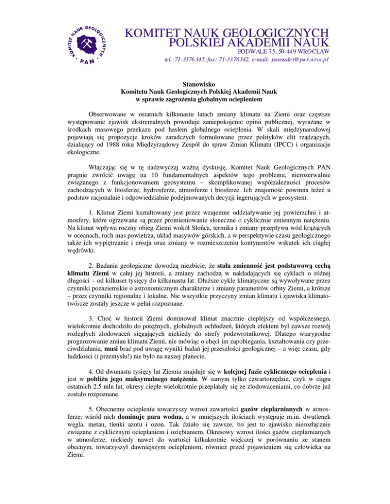 KOMITET NAUK GEOLOGICZNYCH POLSKIEJ AKADEMII NAUK PODWALE 7 5, 50-44 9 WROCŁAW tel.:71-3376 345, fax: 71-33 76342, e-mail: [email protected] Stanowisko Komitetu Nauk Geologicznych Polskiej Akademii Nauk w sprawie zagrożenia globalnym ociepleniem Obserwowane w ostatnich kilkunastu latach zmiany klimatu na Ziemi oraz częstsze występowanie zjawisk ekstremalnych powoduje zaniepokojenie opinii publicznej, wyrażane w środkach masowego przekazu pod hasłem globalnego ocieplenia. W skali międzynarodowej pojawiają się propozycje kroków zaradczych formułowane przez polityków elit rządzących, działający od 1988 roku Międzyrządowy Zespół do spraw Zmian Klimatu (IPCC) i organizacje ekologiczne. Włączając się w tę nadzwyczaj ważną dyskusję, Komitet Nauk Geologicznych PAN pragnie zwrócić uwagę na 10 fundamentalnych aspektów tego problemu, nierozerwalnie związanego z funkcjonowaniem geosystemu – skomplikowanej współzależności procesów zachodzących w litosferze, hydrosferze, atmosferze i biosferze. Ich znajomość powinna leżeć u podstaw racjonalnie i odpowiedzialnie podejmowanych decyzji ingerujących w geosystem. 1. Klimat Ziemi kształtowany jest przez wzajemne oddziaływanie jej powierzchni i atmosfery, które ogrzewane są przez promieniowanie słoneczne o cyklicznie zmiennym natężeniu. Na klimat wpływa roczny obieg Ziemi wokół Słońca, termika i zmiany przepływu wód krążących w oceanach, ruch mas powietrza, układ masywów górskich, a w perspektywie czasu geologicznego także ich wypiętrzanie i erozja oraz zmiany w rozmieszczeniu kontynentów wskutek ich ciągłej wędrówki. 2. Badania geologiczne dowodzą niezbicie, że stała zmienność jest podstawową cechą klimatu Ziemi w całej jej historii, a zmiany zachodzą w nakładających się cyklach o różnej długości – od kilkuset tysięcy do kilkunastu lat. Dłuższe cykle klimatyczne są wywoływane przez czynniki pozaziemskie o astronomicznym charakterze i zmiany parametrów orbity Ziemi, a krótsze – przez czynniki regionalne i lokalne. Nie wszystkie przyczyny zmian klimatu i zjawiska klimatotwórcze zostały jeszcze w pełni rozpoznane. 3. Choć w historii Ziemi dominował klimat znacznie cieplejszy od współczesnego, wielokrotnie dochodziło do potężnych, globalnych ochłodzeń, których efektem był zawsze rozwój rozległych zlodowaceń sięgających niekiedy do strefy podzwrotnikowej. Dlatego wiarygodne prognozowanie zmian klimatu Ziemi, nie mówiąc o chęci im zapobiegania, kształtowania czy przeciwdziałania, musi brać pod uwagę wyniki badań jej przeszłości geologicznej – a więc czasu, gdy ludzkości (i przemysłu!) nie było na naszej planecie. 4. Od dwunastu tysięcy lat Ziemia znajduje się w kolejnej fazie cyklicznego ocieplenia i jest w pobliżu jego maksymalnego natężenia. W samym tylko czwartorzędzie, czyli w ciągu ostatnich 2.5 mln lat, okresy ciepłe wielokrotnie przeplatały się ze zlodowaceniami, co dobrze już zostało rozpoznane. 5. Obecnemu ociepleniu towarzyszy wzrost zawartości gazów cieplarnianych w atmosferze: wśród nich dominuje para wodna, a w mniejszych ilościach występuje m.in. dwutlenek węgla, metan, tlenki azotu i ozon. Tak działo się zawsze, bo jest to zjawisko nierozłącznie związane z cyklicznym ocieplaniem i oziębianiem. Okresowy wzrost ilości gazów cieplarnianych w atmosferze, niekiedy nawet do wartości kilkakrotnie większej w porównaniu ze stanem obecnym, towarzyszył dawniejszym ociepleniom, również przed pojawieniem się człowieka na Ziemi. 6. W ciągu ostatnich 400 tysięcy lat – jeszcze bez udziału człowieka – zawartość CO2 w powietrzu, jak tego dowodzą rdzenie lodowe z Antarktydy, już 4-krotnie była podobna, a nawet wyższa od wartości obecnej. Przy końcu ostatniego zlodowacenia(!), w ciągu kilkuset lat, średnia roczna temperatura globu zmieniała się parokrotnie, w sumie wzrosła prawie o 10°C(!!) na półkuli północnej – a więc były to zmiany nieporównanie bardziej drastyczne niż dziś obserwowane. 7. W ubiegłym tysiącleciu, po okresie ciepłym, z końcem XIII wieku, rozpoczął się okres chłodny trwający do połowy XIX w., po czym znów nastało ocieplenie, w którym właśnie żyjemy. Obserwowane dziś zjawiska, w szczególności przejściowy wzrost globalnej temperatury, wynikają z naturalnego rytmu zmian klimatu. Ogrzewające się oceany mają mniejszą zdolność absorbowania dwutlenku węgla, a zmniejszanie obszaru wieloletniej zmarzliny prowadzi do szybszego rozkładu związków organicznych zawartych w gruncie i tym samym, do zwiększonej emisji gazów cieplarnianych. Od miliardów lat aktywność wulkaniczna Ziemi wzdłuż granic płyt litosfery, skryta głównie pod powierzchnią oceanów, dostarcza stale do jej atmosfery CO2, choć z różną intensywnością. W geosystemie gaz ten usuwany jest z atmosfery do biosfery i litosfery poprzez proces fotosyntezy, wiązany w organizmach żywych – w tym w węglanowych skorupkach organizmów morskich, a po ich obumarciu magazynowany w olbrzymich pokładach wapieni na dnie mórz i oceanów; z kolei na lądzie jest wiązany w różnych osadach organicznych. 8. Szczegółowy monitoring parametrów klimatycznych prowadzony jest niewiele ponad 200 lat, dotyczy tylko części kontynentów, które stanowią zaledwie 28% globu. Część starszych stacji pomiarowych założonych niegdyś na obrzeżach miast, wskutek postępującej urbanizacji, znalazło się dziś w ich obrębie. Wpływa to, między innymi, na wzrost mierzonych wartości temperatury. Badania ogromnych przestworzy oceanów zostały zapoczątkowane ledwie przed 40 laty. Tak krótkie okresy pomiarowe nie dają pewnych podstaw to tworzenia w pełni wiarygodnych modeli zmian termicznych na powierzchni Ziemi, a ich poprawność jest trudna do weryfikacji. Dlatego należy bezwzględnie zachować daleko idącą powściągliwość w przypisywaniu człowiekowi wyłącz