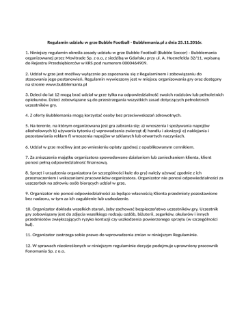 Regulamin udziału w grze Bubble Football - Bubblemania.pl z dnia 25.11.2016r. 1. Niniejszy regulamin określa zasady udziału w grze Bubble Football (Bubble Soccer) - Bubblemania organizowanej przez Movitrade Sp. z o.o, z siedzibą w Gdańsku przy ul. A. Huenefelda 32/11, wpisaną do Rejestru Przedsiębiorców w KRS pod numerem 0000464909. 2. Udział w grze jest możliwy wyłącznie po zapoznaniu się z Regulaminem i zobowiązaniu do stosowania jego postanowień. Regulamin wywieszony jest w miejscu organizowania gry oraz dostępny na stronie www.bubblemania.pl 3. Dzieci do lat 12 mogą brać udział w grze tylko na odpowiedzialność swoich rodziców lub pełnoletnich opiekunów. Dzieci zobowiązane są do przestrzegania wszystkich zasad dotyczących pełnoletnich uczestników gry. 4. Z oferty Bubblemania mogą korzystać osoby bez przeciwwskazań zdrowotnych. 5. Na terenie, na którym organizowana jest gra zabrania się; a) wnoszenia i spożywania napojów alkoholowych b) używania tytoniu c) wprowadzania zwierząt d) handlu i akwizycji e) naklejania i pozostawiania reklam f) wnoszenia napojów w szklanych lub otwartych naczyniach. 6. Udział w grze możliwy jest po wniesieniu opłaty zgodnej z opublikowanym cennikiem. 7. Za zniszczenia majątku organizatora spowodowane działaniem lub zaniechaniem klienta, klient ponosi pełną odpowiedzialność finansową. 8. Sprzęt i urządzenia organizatora (w szczególności kule do gry) należy używać zgodnie z ich przeznaczeniem i wskazaniami pracowników organizatora. Organizator nie ponosi odpowiedzialności za uszczerbek na zdrowiu osób biorących udział w grze. 9. Organizator nie ponosi odpowiedzialności za będące własnością Klienta przedmioty pozostawione bez nadzoru, w tym za ich zagubienie lub uszkodzenie. 10. Organizator dokłada wszelkich starań, żeby zachować bezpieczeństwo uczestników gry. Uczestnik gry zobowiązany jest do zdjęcia wszelkiego rodzaju ozdób, biżuterii, zegarków, okularów i innych przedmiotów zwiększających ryzyko kontuzji czy uszkodzenia powierzonego sprzętu (w szczególności kul). 11. Organizator zastrzega sobie prawo do wprowadzenia zmian w niniejszym Regulaminie. 12. W sprawach nieokreślonych w niniejszym regulaminie decyzje podejmuje uprawniony pracownik Fonomania Sp. z o.o.