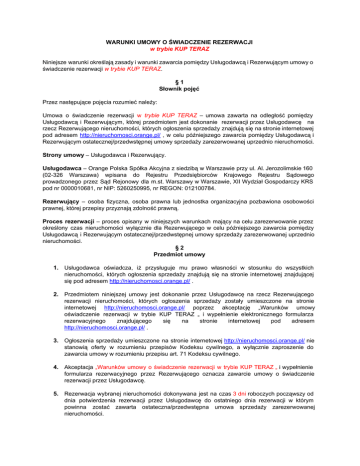 WARUNKI UMOWY O ŚWIADCZENIE REZERWACJI w trybie KUP TERAZ Niniejsze warunki określają zasady i warunki zawarcia pomiędzy Usługodawcą i Rezerwującym umowy o świadczenie rezerwacji w trybie KUP TERAZ . § 1 Słownik pojęć Przez następujące pojęcia rozumieć należy: Umowa o świadczenie rezerwacji w trybie KUP TERAZ – umowa zawarta na odległość pomiędzy Usługodawcą i Rezerwującym, której przedmiotem jest dokonanie rezerwacji przez Usługodawcę na rzecz Rezerwującego nieruchomości, których ogłoszenia sprzedaży znajdują się na stronie internetowej pod adresem http://nieruchomosci.orange.pl/ , w celu późniejszego zawarcia pomiędzy Usługodawcą i Rezerwującym ostatecznej/przedwstępnej umowy sprzedaży zarezerwowanej uprzednio nieruchomości. Strony umowy – Usługodawca i Rezerwujący. Usługodawca – Orange Polska Spółka Akcyjna z siedzibą w Warszawie przy ul. Al. Jerozolimskie 160 (02326 Warszawa) wpisana do Rejestru Przedsiębiorców Krajowego Rejestru Sądowego prowadzonego przez Sąd Rejonowy dla m.st. Warszawy w Warszawie, XII Wydział Gospodarczy KRS pod nr 0000010681, nr NIP: 5260250995, nr REGON: 012100784. Rezerwujący – osoba fizyczna, osoba prawna lub jednostka organizacyjna pozbawiona osobowości prawnej, której przepisy przyznają zdolność prawną. Proces rezerwacji – proces opisany w niniejszych warunkach mający na celu zarezerwowanie przez określony czas nieruchomości wyłącznie dla Rezerwującego w celu późniejszego zawarcia pomiędzy Usługodawcą i Rezerwującym ostatecznej/przedwstępnej umowy sprzedaży zarezerwowanej uprzednio nieruchomości. § 2 Przedmiot umowy 1. Usługodawca oświadcza, iż przysługuje mu prawo własności w stosunku do wszystkich nieruchomości, których ogłoszenia sprzedaży znajdują się na stronie internetowej znajdującej się pod adresem http://nieruchomosci.orange.pl/ . 2. Przedmiotem niniejszej umowy jest dokonanie przez Usługodawcę na rzecz Rezerwującego rezerwacji nieruchomości, których ogłoszenia sprzedaży zostały umieszczone na stronie internetowej http://nieruchomosci.orange.pl/ poprzez akceptację „Warunków umowy oświadczenie rezerwacji w trybie KUP TERAZ „ i wypełnienie elektronicznego formularza rezerwacyjnego znajdującego się na stronie internetowej pod adresem http://nieruchomosci.orange.pl/ . 3. Ogłoszenia sprzedaży umieszczone na stronie internetowej http://nieruchomosci.orange.pl/ nie stanowią oferty w rozumieniu przepisów Kodeksu cywilnego, a wyłącznie zaproszenie do zawarcia umowy w rozumieniu przepisu art. 71 Kodeksu cywilnego. 4. Akceptacja „Warunków umowy o świadczenie rezerwacji w trybie KUP TERAZ „ i wypełnienie formularza rezerwacyjnego przez Rezerwującego oznacza zawarcie umowy o świadczenie rezerwacji przez Usługodawcę. 5. Rezerwacja wybranej nieruchomości dokonywana jest na czas 3 dni roboczych począwszy od dnia potwierdzenia rezerwacji przez Usługodawcę do ostatniego dnia rezerwacji w którym powinna zostać zawarta ostateczna/przedwstępna umowa sprzedaży zarezerwowanej nieruchomości. 6. Nie zawarcie przez Strony w okresie trwania rezerwacji ostatecznej/przedwstępnej umowy sprzedaży zarezerwowanej nieruchomości uprawnia Usługodawcę do usunięcia z ogłoszenia sprzedaży zarezerwowanej nieruchomości opisu „Rezerwacja” oraz do dalszej ekspozycji ogłoszenia na stronie internetowej http://nieruchomosci.orange.pl/ celem zawarcia kolejnej umowy o świadczenie rezerwacji z innym Rezerwującym. § 3 Proces rezerwacji 1. Rezerwujący dokonuje rezerwacji poprzez wybranie w widoku wybranego ogłoszenia sprzedaży nieruchomości przycisku KUP TERAZ . 2. Po wybraniu przycisku KUP TERAZ rezerwujący zapoznaje się z „Warunkami umowy rezerwacji w trybie KUP TERAZ” i je akceptuje. Następnie wypełnia formularz rezerwacyjny, w którym podaje czy jest osobą fizyczną, prawną lub jednostką organizacyjną pozbawioną osobowości prawnej, której przepisy przyznają zdolność prawną. W przypadku, gdy Rezerwującym jest osobą fizyczną Rezerwujący podaje następujące dane: imię, nazwisko, nr telefonu, adres e –mail. W przypadkach, w których rezerwujący nie jest osobą fizyczną Rezerwujący podaje następujące dane: nazwę firmy, nr NIP, dane adresowe, nr telefonu, adres e –email. 3. Każdy Rezerwujący, który wyraża wolę otrzymywania dodatkowych materiałów i dokumentów od Usługodawcy powinien w tym celu wyrazić zgodę na powyższe poprzez zaznaczenie odpowiedniego pola wyboru w formularzu elektronicznym. 4. W celu zagwarantowania bezpieczeństwa przesyłania danych w trakcie wypełniania elektronicznego formularza rezerwacyjnego każde oświadczenie woli złożone przez Rezerwującego na elektronicznym formularzu rezerwacyjnym zabezpieczone jest techniką CAPTCHA ( Completely Automated Public Turing test to tell Computers and Humans Apart ) gwarantującą, iż przesłane do Usługodawcy dane wypełnione są wyłącznie przez człowieka. 5. Po dokonaniu przez Rezerwującego rezerwacji jej potwierdzenie wysyłane jest drogą elektroniczną na podany przez Rezerwującego adres poczty elektronicznej. Powiadomienie potwierdzające rezerwację nieruchomości wysyłane do Rezerwującego drogą elektroniczną zawiera następujące informacje o nieruchomości: nazwa, adres, data rezerwacji. 6. Po podpisaniu przez Strony ostatecznej/przedwstępnej umowy sprzedaży zarezerwowanej nieruchomości ogłoszenie sprzedaży zostaje opatrzone opisem „Sprzedana”. Nie podpisanie przez Strony ostatecznej/przedwstępnej umowy sprzedaży zarezerwowanej nieruchomości skutkuje usunięciem rezerwacji w panelu administracyjnym oraz usunięciem opisu „Rezerwacja” z ogłoszenia sprzedaży nieruchomości na stronie internetowej http://nieruchomosci.orange.pl/ .