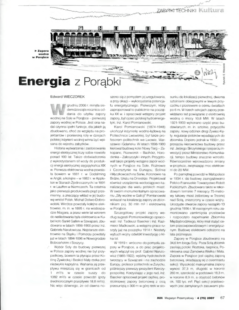 ^ a b w k t t e c h n ik i I lu 11«ra ► Z a p o ra wodna w P o rą b c e Energia z Porąbki Edw ard W IEC ZO REK szono się z pomysłem jej uregulowania, sunku do lokalizacji pierwotnej, dwiema sztolniami obiegowymi w lewym przy ¡1 grudniu 2006 r. minęta sie a przy okazji - wykorzystania potencja łu energetycznego. Pierwszym, który demdziesiąta rocznica od zaproponował to publicznie na począt po 6 m. W trzech sekcjach zapory prze dania do użytku zapory ku XX w. i opracował wstępny projekt widziano też powiązanie z elektrownią wodnej na Sole w Porąbce - pierwszej zapory, był ojciec polskiej hydroenerge- wodną o mocy 10,8 MW. W latach zapory wodnej w Polsce. Jest ona na tyki, inż. Karol Pomianowski. czółku i przelewem o ośmiu światłach 1921-1933 wykonano część prac bu dal czynna i petni funkcje, dla jakich ją Karol Pomianowski (1874-1948) zbudowano, choć ze względu na pro ukończył inżynierię wodno-lądową na zapory, nowy odcinek drogi Zywiec-Kę- jektantów i pionierską rolę w dziejach Politechnice Lwowskiej, byt także pro ty, regulacje potoków wpadających do polskiej inżynierii wodnej winna być wpi fesorem politechnik we Lwowie, War zbiornika. Dopiero jednak w 1933 r„ po sana do rejestru zabytków. szawie i Gdańsku. W latach 1898-1900 przejęciu kierownictwa budowy przez dowlanych, m. in. sztolnie, przyczółki Historia wytwarzania i zastosowania kierował budową kolei Nowy Targ - Za inż. Jerzego Skrzyńskiego i poparciu in energii elektrycznej liczy sobie niewiele kopane, Przeworsk - Bachórz, Horo- westycji przez Ministerstwo Komunika cji, tem po budowy znacznie wzrosło. ponad 100 lat. Także doświadczenia denka - Zaleszczyki i innych. Przygoto z wykorzystaniem sit wody do produk wał także projekty wstępne zapór wod Równocześnie wprowadzono zmiany cji energii elektrycznej sięgają końca XIX nych w Porąbce na Sole, Rożnowie w projekcie, zwiększając moc elektrow w. Pierwsza elektrownia wodna powsta i Czorsztynie na Dunajcu, Solinie ni do 20 MW. ła bowiem w 1881 r. w Godalming i Myczkowcach na Sanie, Koronowie na Po pamiętnej powodzi w Małopolsce w Anglii, a kolejne - w 1882 r. w Apple- Brdzie, Uniżu na Dniestrze. Projektował w 1934 r. do budowy zaangażowano ton w Stanach Zjednoczonych i w 1891 r. w Lauffen w Niemczech. Ta ostatnia również urządzenia wodociągowo-ka nalizacyjne dla wielu polskich miast. Polsko-Francuskie Towarzystwo Robót Publicznych. Zbudowano także w rekor jako pierwsza produkowała prąd prze W swoim monumentalnym opracowa dowym terminie 7 miesięcy 75-metro- mienny, a znaczący wkład w jej budo wy łukowy most żelbetowy w Tresnej wę wnióst Polak, Michał Doliwo-Dobro- niu „Sity wodne w Galicji" Pomianowski wskazał na lokalizację zapory ze zbior wolski. Wkrótce powstały kolejne elek nikiem poj. 30 min m3 i elektrownią Uroczyste otwarcie zapory nastąpiło 13 trownie, m. in. w 1895 r. na wodospa w Porąbce. nad Solą, zniszczony w czasie wojny. dzie Niagara, a przez wiele lat wzorem Szczegółowy projekt zapory we grudnia 1936 r. W następnym roku za m ontowano zamknięcia przelewów do naśladowania była elektrownia w Ku dług sugestii Pomianowskiego opraco i rozpoczęto napełnianie Zbiornika bel koto Sankt Gallen w Szwajcarii, zbu wali: inż. Tadeusz Baecker i inż. Kazi Międzybrodzkiego, który miał służyć ce dowana w latach 1898-1900 przez inż. mierz Maćkowski, a wstępne prace ru lom przeciwpowodziowym i energetycz Gabriela Narutowicza. Najstarsze elek szyły już na początku 1914 r. Niestety nym. Budowę elektrowni odłożono na trownie na Śląsku i Pomorzu powstały wybuch wojny odwlókł inwestycję o kil lata późniejsze. już w latach 1894-1896 w Nowogrodzie Bobrzańskim i Soszycy. ka lat. Zaporę w Porąbce zbudowano na W 1919 r. wrócono do pomysłu za 34,6 km biegu Soły. Poza Sołą zbiornik zasilają potoki: Roztoka, Isepnica, Po- Wybór Soły do budowy pierwszej pory w Porąbce, a do prac projekto w Polsce zapory wodnej nie byt przy wych włączył się prof. Gabriel Naruto nikiewka oraz Zarnówka Wielka i Mata. padkowy, bowiem ta płynąca przez Ko wicz (1865-1922), wybitny hydrotechnik Zapora w Porąbce jest ciężką zaporą tlinę Żywiecką i Beskid Mały rzeka jest tworzący w Szwajcarii i na zachodzie betonową, składającą się z osiemnastu niezwykle kapryśna. Wahania jej prze Europy, profesor politechniki w Zurychu, sekcji. Wysokość maksymalna zapory pływu mieszczą się w granicach od późniejszy pierwszy prezydent Rzeczy wynosi 37,3 m, długość w koronie 1 do pospolitej. Korzystając z jego rad, inż. 260 m, szerokość w podstawie 18,3 m, 1382 m3/s w czasie powodzi (przy m 3/s w czasie suszy Baecker opracował projekt ciężkiej, pro w koronie 8,9 m, a objętość betonów średniorocznym przepływie 18,8 m3/s). stoliniowej zapory betonowej z osią ok. 100 tys. m3. Pięć sekcji przelewo Nic więc dziwnego, że od dawna no przesuniętą o 300 m w górę rzeki w sto wych jest zamykanych zasuwami pła- Magazyn Przemysłowy 4 ( 75 ) 2007 67 ZABYTKI TECHNIKI skimi o wymiarach 11,2 x 4,0 m. Poza w zbiorniku utrzymywano znaczną - 1 0 - turystyki wodnej akwenu, zasila także przelewami, urządzeniami upustowymi 23 min m3 - rezerwę powodziową. Do dwie elektrownie wodne: Porąbkę i Żar. zapory są dwie sztolnie spustowe w le póki nie uzupełniono Zbiornika Między- Na początku lat 50. do zapory wym przyczółku zapory o łącznej po brodzkiego o pozostałe zbiorniki tworzą w Porąbce dobudow ano w g projektu wierzchni przekroju 21,6 m2. Całkowita ce „kaskadę Soły" (Zbiornik Żywiecki m gr inż. Leonarda Zarem by elek przepustowość urządzeń upustowych i Zbiornik Czaniecki), zbiornik w Porąb trow nię wynosi 1690 m3/s. ce nie był w stanie wychwycić fal powo 12,6 MW. Elektrownia została urucho w o dn ą o łącznej m ocy Pojemność zbiornika Porąbka, nazy dziowych na Sole, zwłaszcza tych naj wanego również Jeziorem Międzybrod