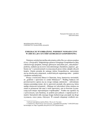 107 Pamiętnik Słowiański LXI, 2011 ISSN 0078-866X MAGDALENA PYTLAK UNIWERSYTET JAGIELOŃSKI, KRAKÓW EMIGRACJE WYOBRAŻONE. PODMIOT NOMADYCZNY W ПИСМА ДО ГАУСТИН GEORGIEGO GOSPODINOWA Niniejszy artykuł jest próbą odczytania cyklu Писма и фотографии (Listy i fotografie)1 bułgarskiego pisarza Georgiego Gospodinowa jako całościowego projektu, którego głównym zamysłem jest „odzyskanie” podróży, nadanie jej na nowo niecodziennego charakteru, poprzez „gubienie się” w przestrzeniach wyznaczanych przez różne zakątki obcych krajów. Zanim przejdę do samego tekstu Gospodinowa, zatrzymam się na chwilę przy pojęciach, wokół których organizuję tekst – podróż i podmiot nomadyczny. Pisząc o twórczości Bruce’a Chatwina, Jerzy Jarniewicz stwierdził, że „podróże i opowieści to sztuki bliźniacze”2. Według badacza ich powinowactwo opiera się na swego rodzaju zależności – odwiedzane miejsca posiadają temat, ale to opowieść posiada siłę sprawczą, która nadaje miejscom tożsamość. „Dlatego też odwiedzać różne miejsca na ziemi to poznawać lub snuć o nich opowieści, one to bowiem wyznaczają tych miejsc najważniejsze współrzędne”. Trudno nie zgodzić się z powyższym, tym bardziej, że podróż jest jednym z najstarszych tematów literackich (dla naszego kręgu kulturowego początek tej drogi wyznacza, rzecz jasna, Odyseja). W czasach ekspansji wielkich moCykl jest największą częścią zbioru Писма до Гаустин. J. Jarniewicz, Wędrówki po opowieściach, „Tygodnik Powszechny” 18.08.2010 (artykuł dostępny na: http://tygodnik.onet.pl/43,0,51287,artykul.html). 1 2 108 MAGDALENA PYTLAK carstw podróż zyskała nowy wymiar. Europejczyk z jednej strony zyskał możliwość odkrywania nowych dalekich lądów, z drugiej zyskał nowe, „dalekie” tematy. Czasy kolonialne bezsprzecznie przyniosły rozkwit literatury nazwanej podróżniczą. Jest to temat bardzo szeroki i od kilkunastu lat dogłębnie badany. Z perspektywy niniejszej analizy dyskurs kolonialny jest ważny głównie z jednego powodu – zaczął romantyzować podróż i podróżowanie. Czasy ponowoczesne ponownie zmieniły status podróży. Rozpoczęta w czasach imperialno-kolonialnych globalizacja dała początek procesowi nazywanemu przez socjologię „kurczeniem się świata”3. Przemieszczanie stało się szybkie, łatwe i dostępne. Dla mieszkańców szeroko rozumianego świata zachodniego jedynymi ograniczeniami wydają się dziś ograniczenia finansowe. Dzięki nowym technologiom komunikacyjnym niemożność faktycznego przemieszczania się nie oznacza niemożności zobaczenia wybranego miejsca na Ziemi (a coraz częściej we Wszechświecie). Telewizja, internet, fotografia cyfrowa umożliwiają „docieranie” w najbardziej odległe miejsca, zdobywanie wiedzy na ich temat, a nawet ich doświadczanie. Dlatego przewartościowaniu musiały ulec także pojęcia definiujące osobę podróżującą/ przemieszczającą się. Wędrowiec, turysta, migrant, nomada, pielgrzym i tułacz to postaci zredefiniowane. Zacznę od tych ostatnich, ponieważ wydają się być pojęciami, które uległy największej dezaktualizacji. Pielgrzyma, nazwanego przez Zygmunta Baumana przodkiem turysty4, od innych podróżników odróżnia celowość przemieszczania się. Pielgrzymuje się zawsze dokądś. Pielgrzym podejmuje trud podróży, aby dotrzeć do miejsca kultu. Podróż jest swego rodzaju ofiarą, ale sama w sobie nie stanowi wartości. Tułacz nie posiada własnego domu, schronienia, żyje w drodze. Zgodnie z legendą5, przemieszcza się z musu, za karę, Zob. P. Sztompka, Socjologia zmian społecznych, Kraków 2005, s. 93–95. Z. Bauman, O turystach i włóczęgach, czyli o bohaterach i ofiarach nowoczesności [w:] idem, Ponowoczesność jako źródło cierpień, Warszawa 2000, s. 145. 5 Mam tu na myśli popularną figurę Żyda Wiecznego Tułacza (Ahaswerusa). Wg legendy, to on popędzał Chrystusa podczas drogi krzyżowej i miał usłyszeć: „Idę, idę, ale ty poczekasz aż do mego powrotu” (zob. Legenda o Ahaswerze. Antologia tekstów, wstęp, wybór, opracowanie W. Piotrowski, Naukowe Wydawnictwo Piotrkowskie, Piotrków Trybunalski 2008). 3 4 EMIGRACJE WYOBRAŻONE. PODMIOT NOMADYCZNY... 109 żyje w ciągłym oczekiwaniu. W tym przypadku liczy się sam proces podróżowania oraz jego ciągłość. Migrant z kolei ma ustalony i cel, i miejsce przeznaczenia. Jego figura została jednak zawłaszczona przez kontekst polityczno-ekonomiczny. Wędrowiec wydaje się najszerszym z powyższych pojęć, najmniej ograniczającym. Zygmunt Bauman wykorzystał figurę wędrowca do ukazania kondycji człowieka w czasach nowoczesnych. Jest to jednak wizja bardzo pesymistyczna. Człowiek nowoczesny jest w ciągłym ruchu, a sama nowoczesność to niemożność trwania w bezruchu. Być nowoczesnym to tyle, co być bez ustanku „na chodzie”. Ruch nie jest bynajmniej sprawą wyboru, jak nie jest nią nowoczesność sama. Jest się w ruchu, bowiem bytuje się w świecie rozdartym między urodą wizji i szpetotą rzeczywistości […]. Mieszkańcy takiego świata są wędrowcami z musu – choć wyruszają w drogę po to, by osiąść. Za tym rogiem jest, powinna być, musi być urocza ulica, na której można się będzie osiedlić; lecz za każdym rogiem pojawia się nowy róg, a wraz z nim nowe rozczarowanie i nowa, nie zniweczona jeszcze nadzieja6. Jest więc w pewien sposób wędrowiec podobny do tułacza. Różnica polega na tym, że tułacz nie posiada domu, a wędrowiec go ma, choć, jeśli dom uznajemy za synonim bezpieczeństwa i stabilizacji, jest on pozorny. Podróżnikami czasów ponowoczesnych (czy też hipernowoczesnych) są turysta i nomada. Turysta, w ujęciu Baumana, to człowiek, dla którego, odwrotnie niż w przypadku wędrowca, podróżowanie jest „lekkie”7. Turysta wyrasta z ponowoczesności, nie należy do ża