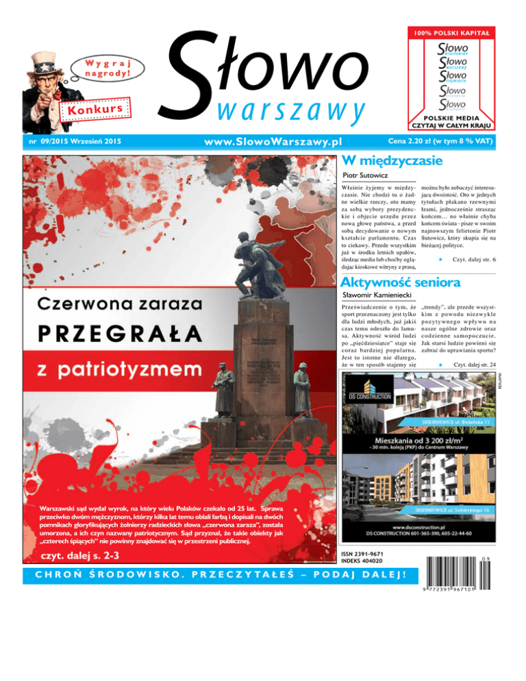 Słowo numeru str 1 100% polski kapitał Konkurs nr 09/2015 Wrzesień 2015 Polskie media Czytaj w całym Kraju www.SlowoWarszawy.pl Cena 2.20 zł (w tym 8 % VAT) W międzyczasie Piotr Sutowicz Właśnie żyjemy w międzyczasie. Nie chodzi tu o żadne wielkie rzeczy, oto mamy za sobą wybory prezydenckie i objęcie urzędu przez nową głowę państwa, a przed sobą decydowanie o nowym kształcie parlamentu. Czas to ciekawy. Przede wszystkim już w środku letnich upałów, śledząc media lub choćby oglądając kioskowe witryny z prasą, można było zobaczyć interesującą dwoistość. Oto w jednych tytułach płakano rzewnymi łzami, jednocześnie strasząc końcem… no właśnie chyba końcem świata - pisze w swoim najnowszym felietonie Piotr Sutowicz, który skupia się na bieżącej polityce. Czyt. dalej str. 6 Aktywność seniora Sławomir Kamieniecki „trendy”, ale przede wszystkim z powodu niezwykle pozytywnego wpływu na nasze ogólne zdrowie oraz codzienne samopoczucie. Jak starsi ludzie powinni się zabrać do uprawiania sportu? Czyt. dalej str. 24 REKLAMA Przeświadczenie o tym, że sport przeznaczony jest tylko dla ludzi młodych, już jakiś czas temu odeszło do lamusa. Aktywność wśród ludzi po „pięćdziesiątce” staje się coraz bardziej popularna. Jest to istotne nie dlatego, że w ten sposób stajemy się Warszawski sąd wydał wyrok, na który wielu Polaków czekało od 25 lat. Sprawa przeciwko dwóm mężczyznom, którzy kilka lat temu oblali farbą i dopisali na dwóch pomnikach gloryfikujących żołnierzy radzieckich słowa „czerwona zaraza”, została umorzona, a ich czyn nazwany patriotycznym. Sąd przyznał, że takie obiekty jak „czterech śpiących” nie powinny znajdować się w przestrzeni publicznej. czyt. dalej s. 2-3 ISSN 2391-9671 INDEKS 404020 C H R O Ń Ś R O D OW I S KO. P R Z E C Z Y TA Ł E Ś – P O DA J DA L E J ! Słowo Krakowa Gazeta lokalna czwartek, 24 marca 2011 Wstępniak Spis treści str 2 Wrzesień Antoni Sorocki Temat Numeru Antoni Sorocki – Wyrok, na który czekaliśmy od 25 lat – s. 2 - 3 Co się działo W Warszawie – s. 4 W Polsce – s. 5 W Gospodarce – s. 5 Publicystyka Piotr Sutowicz – Między pesymizmem a optymizmem – s. 6 Piotr Sutowicz - Witaj szkoło – s. 7 Prawo Maciej Broniecki - Modelowy sposób wykorzystania instytucji pozwu zbiorowego – s. 12 Styl Życia Grażyna Kozak - Gdy spotka nas wypadek – s. 5 Sara Rok - Oryginalny prezent ślubny – co wybrać? – s. 41 Mateusz Grabowski – Niezbędnik stylowego mężczyzny – s. 43 Twój Relax Marta Pietrzak - Podróż do źródła wiary – s. 13 Maria Andrychów - Bałtyk jesienią i zimą – s.14 Patrycja Jasińska - Drawski Błogostan, „Cudze chwalicie, swego nie znacie...” – s. 39 Twój Dom Sławomir Kamieniecki - Tania aranżacja jadalni – s. 15 Radosław Pater - Nowe oblicze ekologii – domy energooszczędne, s. 17 Słowo dla Seniora Grażyna Kozak - Dbaj o słuch – s. 25 Marcin Bartnicki – Klawiterapia, jako jedna z metod skutecznej walki z bólem, s. 27 Na taki wyrok czekaliśmy od lat. Sąd Rejonowy dla Warszawy Pragi Północ umorzył postępowanie w sprawie znieważania pomników Wdzięczności Armii Radzieckiej oraz Braterstwa Broni (czterech śpiących). W 2011 roku dwóch harcerzy oblało monumenty czerwoną farbą i namalowało napisy „czerwona zaraza”, za co prokuratura postawiła im zarzuty. W całej sprawie szczególne znaczenie ma uzasadnienie sądu, który uznał postępowanie młodych mężczyzn za patriotyczne i zasugerował likwidację pomników, które gloryfikują komunizm. Do zdarzenia doszło przed czteroma laty, dokładnie 17 września, w rocznicę sowieckiej agresji na Polskę, co było aktem realizacji paktu Ribbentrop-Mołotow. Dwóch młodych harcerzy rozmawiało wtedy ze znajomymi między innymi o wydarzeniu z 1939 roku i postanowiło dokonać ryzykownego czynu. Tamtej nocy mężczyźni oblali farbą dwa pomniki, które gloryfikują żołnierzy Armii Radzieckiej, a także okrasili je napisem „czerwona zaraza”. Młodzi patrioci zostali szybko zatrzymani przez policję, która otrzymała zgłoszenie od świadka zdarzenia. Wojciechowi i Danielowi postawiono zarzuty dewastacji pomników, które następnie zmieniono na znieważenie tychże. Mężczyźni od początku przyznawali się do popełnienia czynu, a swoją motywację argumentowali pobudkami ideologicznymi i patriotyczną postawą. W lipcu 2013 roku padł pierw- szy optymistyczny wyrok w tej sprawie. Sędzia Ewa Grabowska w uzasadnieniu stwierdziła wtedy, że zarówno monument Wdzięczności Armii Radzieckiej, jak i Braterstwa Broni nie mogą zostać uznane ze pomniki w rozumieniu art. 261 KK, z którego to prowadzono sprawę. „Zdaniem sądu przedmiotowe obiekty nie spełniają definicji pomnika, bowiem ochronie prawnej podlega obiekt wzniesiony dla upamiętnienia zdarzenia bądź REKLAMA Będzie się działo Wrzesień 2015 - s. 46 - 47 Polityczne ochłodzenie? Wyrok, na który czekaliśmy od 25 lat Marta Pietrzak Sierpień minął bezpowrotnie, a razem z nim, niezwykle upalne w tym roku, wakacje. Ciepło było nie tylko ze względu na pogodę, ale również polityczne przepychanki i kumoterstwo szeroko propagowane w „zacisznych” salach polskich władz. Tegoroczne lato pokazało, że przy 33 st. Celsjusza może wyparować polityka ciepłej wody w kranie, której ideę najpierw komplementował Donald Tusk, a później stał się na tym tle obiektem ataku opozycji. Polacy po raz pierwszy od kilkunastu lat przekonali się, że na dostarczanie energii do miast, przedsiębiorstw i gospodarstw indywidualnych mają wpływ nie tylko Rosja i jej polityczna gra surowcami, ale również natura, z którą umów nie sposób negocjować. Pozostaje nadzieja, że jesienna depresja nie spowoduje kolejnego załamania, nie tylko nerwowego, w szeregach władzy. Co w znacznym stopniu może się przenieść również na zaufanie wyborców. Jedn