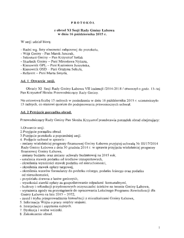 PROTOKÓŁ z obrad XI Sesji Rady Gminy Łabowa w dniu 16 października 2015 r. W sesji udział biorą: - Radni wg. listy obecności załączonej do protokołu, - Wójt Gminy - Pan Marek Janczak, - Sekretarz Gminy - Pan Krzysztof Setlak - Skarbnik Gminy - Pani Mirosława Nykaza, - Kierownik GPL - Pani Kazimiera Ju szyńska, - Kierownik OSD - Pani Grażyna Sekuła, - Referent - P ani Marta Smyda, Ad. 1 Otwarcie sesji. Obrady XI Sesji Rady Gminy Łabowa VII kadencji /2014-2018 I Pan Krzysztof Skraba Przewodnic zący Rady Gminy. otworzył o godz. 13- tej Na u stawową liczbę 15 radnych w posiedzeniu w dniu 16 października 2015 r. uczestniczyło 13 radnych, co stanowi quorum do podejmowania prawomocnych uchwał. Ad. 2 Przyjęcie porządku Przewodniczący Rady Gminy Pan Skraba Krzysztof przedstawia obrad. porządek obrad obejmujący : I .Otwarcie sesj i. 2.Przyjęcie porządku obrad. z poprzedniej sesji. 4. Podjęcie uchwał w sprawie : - zmiany wieloletniej prognozy finansowej Gminy Łabowa przyjętej uchwałą Nr III/17/2014 Rady Gminy Łabowa z dnia 30 grudnia 2014 r. w sprawie przyjęcia wieloletniej prognozy finansowej Gminy Łabowa, - zmiany budżetu oraz zmiany uchwały budżetowej na 2015 rok, - ustalenia stawek podatku od środków transportowych, - określenia wysokości stawek podatku od nieruchomości, - określenia stawek opłaty targowej , - określenia wzorów formularzy do podatku rolnego, podatku leśnego oraz podatku od nieruchomości, - przydzi ału drewna z lasów gminnych, - wysokości stawki opłaty za gospodarowanie odpadami komunalnymi, - budowy i refundacji przydomowych oczyszczalni ścieków na terenie Gminy Łabowa, - wyrażeni a zgody na przystąpienie do opracowania Lokalnego Programu Rewitalizacji dla Gminy Łabowa na lata 2015 - 2022, - zasad i trybu przeprowadzania konsultacji z mieszkańcami Gminy Łabowa, 5. Informacja Wójta o pracy między sesjami. 6. Interpelacje i zapytania radnych. 7. Dyskusja i wolne wnioski. 8. Zakończenie obrad. 3 . Przyjęcie protokołu I do głosowania porządku obrad zabiera głos Pan Wójt i prosi o z porządku obrad uchwał podatkowych z uwagi na brak podstawy prawnej, oraz uchwały dotyczącej wysokości stawki opłaty za gospodarowanie odpadami komunalnymi do czasu rozstrzygnięcia przetargu. Przed przystąpieniem wykreślenie Przewodniczący porządku pyta czy Radni zgłaszają uwagi lub inne propozycje do przedstawionego obrad. Uwag nie zgłoszono, więc następnie poddaje go pod przedstawia porządek obrad po wykreśleniu tych uchwał, a w wyniku, którego zostaje przyjęty 13 głosami za. głosowanie Ad. 3 Przyjęcie protokołu Przed przyjęciem protokołu z poprzedniej sesji Rady Gminy. z X Nadzwyczaj nej sesji Rady Gminy z dnia 13 sierpnia 2015 r. Pan Krzysztof Skraba pyta czy Państwo Radni zgłaszają uwagi do protokołu, do wglądu w Biurze Rady. Przewodniczący który był Uwag nie zgłoszono, więc poddaje protokół pod głosowanie w wyniku, którego zostaje przyjęty 12 głosami za, przy 1 wstrzymującym się od głosu. Ad.4 Podjecie uchwał w sprawie: - zmiany wieloletniej prognozy finansowej Gminy Łabowa przyjętej uchwałą Nr ITI/17/2014 Rady Gminy Łabowa z dnia 30 grudnia 2014 r. w sprawie przyjęcia wieloletniej prognozy finansowej Gminy Łabowa, Wyjaśnienia Następnie - zmiany w zakresie - udziela Skarbnik Gminy Pani Rada Gminy w głosowaniu 13 głosów za podjęła budżetu Wyjaśnienia w Następnie powyższej uchwały oraz zmiany uchwały budżetowej zakresie powyższej uchwały Rada Gminy w głosowaniu 13 przydziału Wyjaśnienia uchwałę za, Nykaza. Nr XI/7 1/2015. na 2015 rok, udziela Skarbnik Gminy Pani głosów Mirosława podjęła uchwałę Mirosława Nykaza. Nr XI/72/2015. drewna z lasów gminnych, udziela Wójt Gminy informując, że Pani Barbara Gajewska - Łoboda zwróciła się z prośbą o przydział drewna na odbudowę zniszczonego w wyniku pożaru zakładu stolarskiego znajdującego się w Roztoce Wielkiej . w zakresie powyższej uchwały Po dyskusji zaproponowano i jednogłośnie ustalono przydzielić Następni e podjęła uchwałę Rada Gminy w głosowaniu 13 głosów za na ten cel 20 m3 drewna. Nr XI/73/2015. 2 - budowy i refundacji przydomowych oczyszczalni ścieków na terenie Gminy Łabowa, Wyjaśnienia w zakresie powyższej uchwały udziela Pani Sekuła Grażyna Kierownik OSD jest to dla tych gdzie ekonomicznie uzasadnione jest prowadzenie kanalizacji. Rada Gminy w głosowaniu 13 głosów za podjęła uchwałę Nr XI/74/2015. informując, że Następnie - wyrażenia zgody na przystąpienie do opracowania Lokalnego Programu Rewitalizacji dla Gminy Łabowa na lata 2015- 2022, Przewodniczący Rady Gminy Pan Krzysztof Skraba pyta czy są pytania lub uwagi do powyższej uchwały. Pani Maria Stopka pyta kto opracuje, jak będą wyglądały konsultacje, czy zadania nie ujęte w programie będą mogły być finansowane z Unii Europejskiej, jak będzie wyglądał cały ten proces. Odpowiedzi na pytania udziela Sekretarz Gminy Pan Krzysztof Setlak informując, że opracowaniem Lokalnego Programu Rewitalizacji zajmie się firma zewnętrzna, objęte zostanie 20 % gminy, gdzie zamieszkuje nie więcej jak 30 % mieszkańców, do przeprowadzenia konsultacji zostanie powołany zespół. Następnie Rada Gminy w głosowaniu 13 głosów - zasad i trybu przeprowadzania konsultacji z Pani Maria Stopka do powyższej zostały naniesione w uchwale. Następnie Rada Gminy w za podjęła uchwałę Nr Xl/75/2015. mieszkańcami uchwały wniosła głosowaniu 13 głosów Gminy Łabowa, kilka istotnych wniosków i uwag, które za podjęła uchwałę Nr XI/76/20 15. Ad. 5 Informacja Wójta o pracy między sesjami. Pan Wójt informuje, że: - po 10 miesiącach i 16 dniach po zakończeniu kanalizacji otrzymaliśmy zwrot środków, - obecnie zajmujemy się projektowaniem kanalizacji w Nowej Wsi i Maciejowej, - w trakcie realizacji jest przebudowa oświetlenia we wsi Krzyżówka, - przygotowujemy się do konstrukcji 