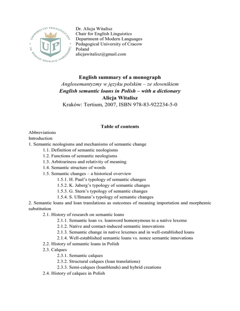 Dr. Alicja Witalisz Chair for English Linguistics Department of Modern Languages Pedagogical University of Cracow Poland [email protected] English summary of a monograph Anglosemantyzmy w języku polskim – ze słownikiem English semantic loans in Polish – with a dictionary Alicja Witalisz Kraków: Tertium, 2007, ISBN 978-83-922234-5-0 Table of contents Abbreviations Introduction 1. Semantic neologisms and mechanisms of semantic change 1.1. Definition of semantic neologisms 1.2. Functions of semantic neologisms 1.3. Arbitrariness and relativity of meaning 1.4. Semantic structure of words 1.5. Semantic changes – a historical overview 1.5.1. H. Paul’s typology of semantic changes 1.5.2. K. Jaberg’s typology of semantic changes 1.5.3. G. Stern’s typology of semantic changes 1.5.4. S. Ullmann’s typology of semantic changes 2. Semantic loans and loan translations as outcomes of meaning importation and morphemic substitution 2.1. History of research on semantic loans 2.1.1. Semantic loan vs. loanword homonymous to a native lexeme 2.1.2. Native and contact-induced semantic innovations 2.1.3. Semantic change in native lexemes and in well-established loans 2.1.4. Well-established semantic loans vs. nonce semantic innovations 2.2. History of semantic loans in Polish 2.3. Calques 2.3.1. Semantic calques 2.3.2. Structural calques (loan translations) 2.3.3. Semi-calques (loanblends) and hybrid creations 2.4. History of calques in Polish 2.5. Internationalisms 3. English semantic loans in Polish 3.1. Semantic loans identification criteria 3.1.1. Historical criterium 3.1.2. Dictionary and chronological criterium 3.1.3. Semantic loans in a cultural and thematic context 3.1.4. Change in the collocational pattern of a lexeme used in a new sense 3.1.5. Derivatives from semantic loans and from their English etymons 3.1.6. Extra- and intralinguistic criteria 3.1.7. Semantic and lexical differences between BrE and AmE 3.2. Definition of semantic loan from English (P. anglosemantyzm) 3.3. Types of semantic change in semantic loans 3.4. Sample analysis of the origins of a semantic loan and of semantic change 3.5. Secondary semantic loans or anglicized Latin loanwords in Polish? 3.6. Loan translations from English 3.6.1. Pseudo-loan translations from English 3.7. Lexical internationalisms of English descent 3.8. Institutionalization of semantic loans 3.8.1. Reasons for the introduction of English semantic loans in Polish 3.8.2. Institutionalization of English semantic loans in Polish 3.8.2.1. Introduction of semantic loans in written texts 3.8.2.2. English semantic loans in Polish dictionaries 3.8.3. Outcomes of the process of borrowing foreign senses 3.9. English semantic loans in semantic fields 4. Normative evaluation of semantic borrowing 4.1. Language correctness criteria 4.2. Notion of language error 4.3. Essential and inessential semantic loans 4.4. Polish linguists on semantic loans Conclusions Dictionary of English semantic loans in Polish Index of English loan translations in Polish References Abbreviations (used in this summary): advert. – advertising aut. – automotive industry busin. – business colloq. – colloquialism cosm. – cosmetology E. – English edu. – education eco. – ecology econ. – economics G. – German Gr. – Greek inf. tech.– information technology journal. – journalism Lat. – Latin leg. – law polit. – politics pop cult. – popular culture P. – Polish psych. – psychology Rus. – Russian Sp. – Spanish sport. – sports techn. – technology Introduction English linguistic influence on Polish has been observed since the 17th century, yet it was only after the Second World War that the number of loanwords from English began to grow steadily, cf. 180 anglicisms in 1861, 250 in 1927, 2000 in 2010 (Mańczak-Wohlfeld 2010). English loanwords in Polish have been amply discussed and exemplified in a number of works (e.g. Fisiak (see bibliography); Mańczak-Wohlfeld (see bibliography)). These studies and many other were mainly devoted to just one type of loans from English, i.e. loanwords, which are lexemes imported from English with their form and meaning, e.g. P. leasing < E. leasing, P. biznes < E. business, P. komputer < E. computer. This was dictated by the linguistic results of the influence. Since 1989, which marks the end of the Communist era in Central and Eastern Europe, Poland has been opening to the West and experiencing political, social and cultural chanages that found a reflection not only in the growing number of loanwords from English, but also in the growing variety of loans. An observant user of contemporary Polish notices the use of native lexemes and well-established loans in new senses as well as the appearance of new phraseological units. Many of such semantic and word-formation innovations are in fact contact-induced. On closer analysis, they turn out to be semantic loans and loan translations from English, scarcely evidenced in the older studies on English-Polish language contact. The monograph Anglosemantyzmy w języku polskim - ze słownikiem [English semantic loans in Polish - with a dictionary] is devoted to one area of the increasing English linguistic influence on Polish. The work addresses various issues concerning contact-induced semantic changes in a language as well as the typology of loans in general and of semantic loans in particular. An integral part of the study is a dictionary of English semantic loans in Polish (to be found at the end of this summary) that is a collection of nearly 300 lexemes (native words and well-established loans) whose meanings have been extended under the influence of English. The dictionary was compiled in 2006. On writing this summary in early 2015, we are aware that this original 2006 list needs supplementing. Chapetr 1. Semantic neologisms and mechanisms of semantic change Chapter 1 provides a theoretical background for the discussion of semantic innovations that occur under foreig