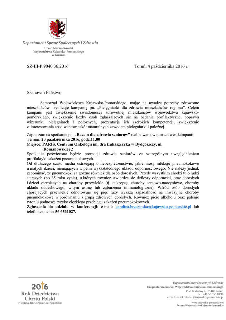 SZ-III-P.9040.36.2016 Toruń, 4 października 2016 r. Szanowni Państwo, Samorząd Województwa Kujawsko-Pomorskiego, mając na uwadze potrzeby zdrowotne mieszkańców realizuje kampanię pn. „Pielęgniarki dla zdrowia mieszkańców regionu”. Celem kampanii jest zwiększenie świadomości zdrowotnej mieszkańców województwa kujawskopomorskiego, zwiększenie liczby osób zgłaszających się na badania profilaktyczne, poprawa wizerunku pielęgniarek i położnych, prezentacja ich szerokich kompetencji, zwiększenie zainteresowania absolwentów szkół maturalnych zawodem pielęgniarki i położnej. Zapraszam na spotkanie pn. „Razem dla zdrowia seniorów” realizowane w ramach ww. kampanii. Termin: 20 października 2016, godz.11.00 Miejsce: PARIS, Centrum Onkologii im. dra Łukaszczyka w Bydgoszczy, ul. Romanowskiej 2 Spotkanie poświęcone będzie promocji zdrowia seniorów ze szczególnym uwzględnieniem profilaktyki zakażeń pneumokokowych. Od dłuższego czasu media ostrzegają o niebezpieczeństwie, jakie niosą infekcje pneumokokowe u małych dzieci, niemających w pełni wykształconego układu odpornościowego. Nie należy jednak zapominać, że pneumokoki są groźne również dla osób dorosłych. Przede wszystkim chodzi tu o ludzi starszych (po 65 roku życia), u których również stwierdza się deficyty odporności, oraz dorosłych i dzieci cierpiących na choroby przewlekłe (tj. cukrzycę, choroby sercowo-naczyniowe, choroby układu oddechowego, w tym astmę lub zaburzenia immunologiczne). Wśród osób dorosłych chorujących przewlekle odnotowuje się pięć razy wyższą zapadalność na inwazyjne choroby pneumokokowe w porównaniu z grupą zdrowych dorosłych. Również picie alkoholu oraz palenie tytoniu podnoszą ryzyko ciężkiego przebiegu zakażeń pneumokokowych. Zgłoszenia do udziału w konferencji: e-mail: [email protected] lub telefonicznie nr: 56 6561027. Pielęgniarki i Położne dla zdrowia mieszkańców regionu Czas Razem dla zdrowia seniorów Bydgoszcz – 20 października 2016 Otwarcie konferencji 10 min Stowarzyszenie Parasol dla Życia ‐ gdybym wiedziała – film Sabina Szafraniec, Prezes Stowarzyszenia Parasol dla Życia 10 min Dlaczego szczepienia przeciw grypie i pneumokokom są ważne? Prof. dr hab. med. Adam Antczak, Prorektor Uniwersytetu Medycznego w Łodzi; Kierownik Kliniki Pulmonologii Ogólnej i Onkologicznej 25 min „Problematyka ruchów anty szczepionkowych” Sabina Szafraniec, Prezes Stowarzyszenia Parasol dla Życia 10 min „Modelowe Programy Polityki Zdrowotnej – dobre praktyki” 15 min Tomasz Jan Prycel - Stowarzyszenie CEESTAHC Program Profilaktyki Zakażeń Pneumokokowych dla osób Dorosłych w Oparciu o Szczepienia Przeciwko Pneumokokom w Województwie Kujawsko – Pomorskim w roku 2016 – dr n. med. Małgorzata Leźnicka, Departament Spraw Społecznych i Zdrowia, Urząd Marszałkowski Województwa Kujawsko-Pomorskiego 15 min Promocja zdrowia seniorów 20 min dr n.med. Anna Andruszkiewicz – Katedra i Zakład Promocji Zdrowia, Collegium Medicum im. dra L. Rydygiera w Bydgoszczy, UMK w Toruniu Zabezpieczenie mieszkańców województwa kujawsko-pomorskiego w świadczenia 20 min. pielęgniarek i położnych dr n.med. Anna Andruszkiewicz – Katedra i Zakład Promocji Zdrowia, Collegium Medicum im. dra L. Rydygiera w Bydgoszczy, UMK w Toruniu Jak poprawić dostępność do szczepień dla dzieci? 20 min DEBATA dyskusja z udziałem decydentów na temat możliwych rozwiązań i działań w regionie Muzyka jest dobra na wszystko – część artystyczna Anna Kamińska 30 min. Kontakt w sprawie spotkania: tel. 56 656 10 27 FORMULARZ ZGŁOSZENIOWY Pielęgniarki dla zdrowia mieszkańców regionu PARIS, Centrum Onkologii im. prof. F. Łukaszczyka - Bydgoszcz, ul. Romanowskiej 2 20 października 2016 Zgłoszenia można dokonać na kilka sposobów: • przesłać faksem zamieszczony poniżej formularz na nr faks: 56 6561085 • przesyłać dane potrzebne do zgłoszenia na e-mail: [email protected] • przekazać dane potrzebne do zgłoszenia na nr tel.: 56 6561027 Ostateczny termin nadsyłania formularza zgłoszeń: 17.10.2016 (decyduje data wysłania wiadomości e-mail, faksu lub data stempla pocztowego). PROSIMY O CZYTELNE WYPEŁNIENIE PONIŻSZEGO FORMULARZA DANE OSOBOWE Imię i nazwisko Stanowisko / Funkcja Reprezentowana instytucja Adres instytucji Telefon kontaktowy Adres e-mail