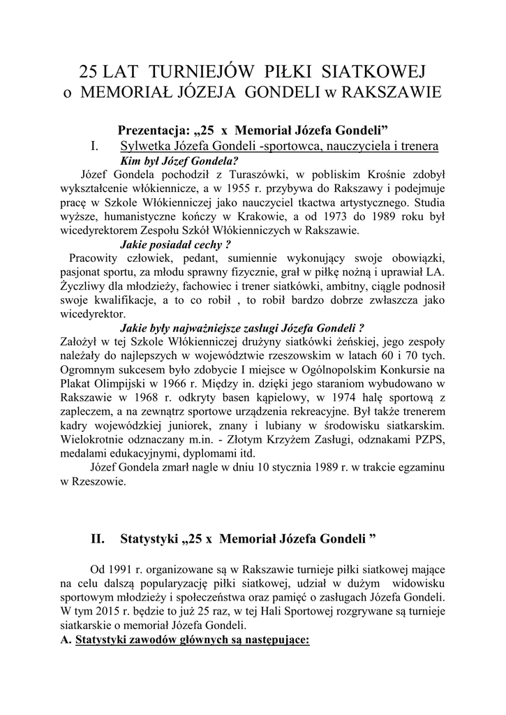 25 LAT TURNIEJÓW PIŁKI SIATKOWEJ o MEMORIAŁ JÓZEJA GONDELI w RAKSZAWIE I. Prezentacja: „25 x Memoriał Józefa Gondeli” Sylwetka Józefa Gondeli -sportowca, nauczyciela i trenera Kim był Józef Gondela? Józef Gondela pochodził z Turaszówki, w pobliskim Krośnie zdobył wykształcenie włókiennicze, a w 1955 r. przybywa do Rakszawy i podejmuje pracę w Szkole Włókienniczej jako nauczyciel tkactwa artystycznego. Studia wyższe, humanistyczne kończy w Krakowie, a od 1973 do 1989 roku był wicedyrektorem Zespołu Szkół Włókienniczych w Rakszawie. Jakie posiadał cechy ? Pracowity człowiek, pedant, sumiennie wykonujący swoje obowiązki, pasjonat sportu, za młodu sprawny fizycznie, grał w piłkę nożną i uprawiał LA. Życzliwy dla młodzieży, fachowiec i trener siatkówki, ambitny, ciągle podnosił swoje kwalifikacje, a to co robił , to robił bardzo dobrze zwłaszcza jako wicedyrektor. Jakie były najważniejsze zasługi Józefa Gondeli ? Założył w tej Szkole Włókienniczej drużyny siatkówki żeńskiej, jego zespoły należały do najlepszych w województwie rzeszowskim w latach 60 i 70 tych. Ogromnym sukcesem było zdobycie I miejsce w Ogólnopolskim Konkursie na Plakat Olimpijski w 1966 r. Między in. dzięki jego staraniom wybudowano w Rakszawie w 1968 r. odkryty basen kąpielowy, w 1974 halę sportową z zapleczem, a na zewnątrz sportowe urządzenia rekreacyjne. Był także trenerem kadry wojewódzkiej juniorek, znany i lubiany w środowisku siatkarskim. Wielokrotnie odznaczany m.in. - Złotym Krzyżem Zasługi, odznakami PZPS, medalami edukacyjnymi, dyplomami itd. Józef Gondela zmarł nagle w dniu 10 stycznia 1989 r. w trakcie egzaminu w Rzeszowie. II. Statystyki „25 x Memoriał Józefa Gondeli ” Od 1991 r. organizowane są w Rakszawie turnieje piłki siatkowej mające na celu dalszą popularyzację piłki siatkowej, udział w dużym widowisku sportowym młodzieży i społeczeństwa oraz pamięć o zasługach Józefa Gondeli. W tym 2015 r. będzie to już 25 raz, w tej Hali Sportowej rozgrywane są turnieje siatkarskie o memoriał Józefa Gondeli. A. Statystyki zawodów głównych są następujące: 1. Podczas 25 lat w „Memoriałach Głównych” grało 95 drużyn kobiecych i 103 drużyny męskie, tj. prawie 200 drużyn czyli ok. 2400 zawodniczek i zawodników. 2. W ciągu 50 dni zawodów rozegranych zostało przez drużyny kobiet: 150 meczy, a przez drużyny męskie: 180 meczy czyli razem 330 meczy. 3. Do udziału w turniejach memoriałowych w kategorii kobiet zaproszono reprezentacje 20 zaprzyjaźnionych szkół średnich , klubów czy drużyn środowiskowych m.in.: 1. ZSW -Anilana -ITS Rakszawa ( udział 25 razy) -4 x I miejsce 2. LO Żołynia ( udział 17 razy) -2 x I miejsce 3. Zespół Szkół Ekonomicznych Mielec (16 razy) -6 x I miejsce 4. MKS I LO Łańcut (9) -6 x I miejsce 5. Zespół Szkół Spożywczych Jarosław (6) 6. V LO Rzeszów (3) -2 x I miejsce 7. ZSO Nr 1 Mielec (2) -1 x I miejsce 8. ZKS Zelmer Rzeszów (2) 9. ZS Leżajsk (2) 10. MOS Rzeszów (2) 11. KS Viktoria Sonina (2) 12. KS Champion Bratkówka (2) 13. RZPW Rakszawa (byłe zawodniczki) ( 1 ) -1 x I miejsce 14. ZS Nr 1 Łańcut ( II LO ) (1) -1 x I miejsce 15. SKS „Beskid” Iwonicz Zdrój (1) -1 x I miejsce 16. Zespół Szkół Ekonomicznych Łańcut ( 1 ) 17. Kadra SP 8 / SP 9 z Mielca (1) 18. Zespół Szkół Nr 11 z Warszawy (1) 19. Zespół Szkół Nr 3 Łańcut (1) 20. Zdravotna Skola z Michalovic na Słowacji ( 1 ) -zagraniczna Wg analizy statystycznej wynika, że w memoriałach -kategoria kobieca udział brały w zdecydowanej większości amatorskie drużyny szkolne i środowiskowe zaprzyjaźnionych szkół o wyrównanym poziomie umiejętności, choć zdarzały się mocne drużyny klubowe np. juniorki Stali Mielec czy V LO Rzeszów. 4. Do udziału w turniejach memoriałowych w kategorii męskiej zaproszonych zostało 26 zaprzyjaźnionych zespołów szkolnych, strażackich, studenckich, nauczycielskich, środowiskowych oraz klubowych wg decyzji organizatorów w danym roku. Były to m.in. następujące drużyny męskie: 1. ZSW - Anilana -TKF Rakszawa (udział 25 razy) 8 x I miejsce 2. Reprezentacja KW PSP Rzeszów (udział 16 razy) 1 x I miejsce 3. S.A. PSP Kraków ( 12 razy) 2 x I miejsce 4. C.S. PSP Częstochowa ( 11 razy) 4 x I miejsce 5. AKS Resovia V LO Rzeszów (7) 2 x I miejsce 6. AZS Uniwersytet Rzeszowski (6) 3 x I miejsce 7. ZS Mechanizacji Rolnictwa Łańcut (5) 1 x I miejsce 8. „Dom-Bud” Żołynia (5) 9. ZNP Mielec (2) 10. Włókniarz Rakszawa (2) 11. Rejonowa Straż Pożarna Łańcut (1) 1 x I miejsce 12. Reprezentacja PSP Katowice (1) 13. SMS PZPS Rzeszów (1) 1 x I miejsce 14. Tech. Mechaniczne ŁFŚ Łańcut (1) 1 x I miejsce 15. ZNP Rakszawa (1) 16. ZNP Żołynia (1) 17. ZS Leżajsk (1) 18. PWSZ Karpaty Krosno (1) 19. KS „Błękitni” Ropczyce (1) 20. Politechnika Rzeszów (1) 21. ZS Rolniczych Ropczyce (1) 22. ZS Wodno-Melioracyjnych Trzciana ( 1 ) 23. LO Żołynia (1) 24. IV LO Rzeszów (1) 25. Drużyna „Foto-Hurt” Rzeszów (1) 26. Drużyna „SNINA” Słowacja (1) -zagraniczna Wg analizy chronologicznej startów wynika, że w pierwszych kilku memoriałach uczestniczyły głównie drużyny szkolne szkół średnich województwa rzeszowskiego, kolejna dekada memoriałowa to dominacja zespołów strażackich i nauczycielskich, a w ostatnich kilku turniejach rywalizowały drużyny klubowe z poziomu III ligi państwowej i reprezentacje drużyn strażaków z Częstochowy i Podkarpacia. Należy stwierdzić, że poziom sportowy i organizacyjny kolejnych Memoriałów wzrastał. Od 2000 r. Turnieje memoriałowe są organizowane też dla szkół gimnazjalnych w jednym dniu dla 6 szkół czyli 3 zespołów dziewcząt i 3 zespołów chłopców. Od 2009 roku również szkoły podstawowe głównie z terenu Gminy Rakszawa ( 10 drużyn) biorą udział w tych siatkarskich zmaganiach. 5. Oprawa artystyczna zawodów: W większości Memoriałów orga
