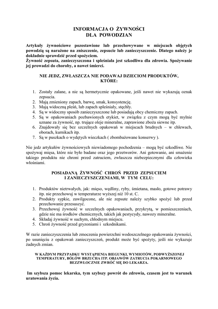 INFORMACJA O ŻYWNOŚCI DLA POWODZIAN Artykuły żywnościowe pozostawione lub przechowywane w miejscach objętych powodzią są narażone na zniszczenie, zepsucie lub zanieczyszczenie. Dlatego należy je dokładnie sprawdzić przed spożyciem. Żywność zepsuta, zanieczyszczona i spleśniała jest szkodliwa dla zdrowia. Spożywanie jej prowadzi do choroby, a nawet śmierci. NIE JEDZ, ZWŁASZCZA NIE PODAWAJ DZIECIOM PRODUKTÓW, KTÓRE: 1. Zostały zalane, a nie są hermetycznie opakowane, jeśli nawet nie wykazują oznak zepsucia. 2. Mają zmieniony zapach, barwę, smak, konsystencję. 3. Mają widoczną pleśń, lub zapach spleśniały, stęchły. 4. Są w widoczny sposób zanieczyszczone lub posiadają obcy chemiczny zapach. 5. Są w opakowaniach pozbawionych etykiet, w związku z czym mogą być mylnie uznane za żywność, np. trujące oleje mineralne, zaprawione zboża siewne itp. 6. Znajdowały się bez szczelnych opakowań w miejscach brudnych – w chlewach, oborach, kurnikach itp. 7. Są w puszkach o wydętych wieczkach ( zbombażowane konserwy ). Nie jedz artykułów żywnościowych niewiadomego pochodzenia – mogą być szkodliwe. Nie spożywaj mięsa, które nie było badane oraz jego przetworów. Ani gotowanie, ani smażenie takiego produktu nie chroni przed zatruciem, zwłaszcza niebezpiecznymi dla człowieka włośniami. POSIADANĄ ŻYWNOŚĆ CHROŃ PRZED ZEPSUCIEM I ZANIECZYSZCZENIAMI, W TYM CELU: 1. Produktów nietrwałych, jak: mięso, wędliny, ryby, śmietana, masło, gotowe potrawy itp. nie przechowuj w temperaturze wyższej niż 10 st. C. 2. Produkty sypkie, zawilgocone, ale nie zepsute należy szybko spożyć lub przed przechowanie przesuszyć. 3. Przechowuj żywność w szczelnych opakowaniach, przykrytą, w pomieszczeniach, gdzie nie ma środków chemicznych, takich jak pestycydy, nawozy mineralne. 4. Składaj żywność w suchym, chłodnym miejscu. 5. Chroń żywność przed gryzoniami i szkodnikami. W razie zanieczyszczenia lub zmoczenia powierzchni wodoszczelnego opakowania żywności, po usunięciu z opakowań zanieczyszczeń, produkt może być spożyty, jeśli nie wykazuje żadnych zmian. W KAŻDYM PRZYPADKU WYSTĄPIENIA BIEGUNKI, WYMIOTÓW, PODWYŻSZONEJ TEMPERATURY, BÓLÓW BRZUCHA ITP. OBJAWÓW ZATRUCIA POKARMOWEGO BEZZWŁOCZNIE ZWRÓĆ SIĘ DO LEKARZA. Im szybsza pomoc lekarska, tym szybszy powrót do zdrowia, czasem jest to warunek uratowania życia. INFORMACJA O WODZIE DO PICIA DLA POWODZIAN Fala powodziowa niesie ze sobą zanieczyszczenia bakteryjne i chemiczne groźne dla zdrowia i życia człowieka. Po ustąpieniu powodzi woda w studniach i zbiornikach wodnych nie nadaje się do picia. W celu uzyskania wody bezpiecznej dla zdrowia należy bezwzględnie wszystkie studnie doprowadzić do odpowiedniego stanu technicznego oraz oczyścić je i wydezynfekować. OCZYSZCZANIE I ODKAŻANIE STUDNI KOPANEJ: Po wybraniu wody ze studni trzeba oczyścić dno ze szlamu i wszelkich nieczystości, wybrać kilkudziesięciocentymetrową warstwę piasku i wypełnić je warstwą przemytego żwiru lub gruboziarnistego piasku grubości ok. 10 cm, oczyścić cembrowinę oraz zabetonować ubytki i szpary. Przed przystąpieniem do dezynfekcji należy zmierzyć za pomocą tyczki lub ciężarka na sznurku głębokość wody w studni. Na każdy metr głębokości wody odmierzamy ilość wapna chlorowanego wg zasad podanych w tabelce. Średnica studni w cm 80 90 100 120 Potrzebna ilość wapna chlorowanego na każdy metr głębokości wody 150 g – 1 szklanka 200 g – 1 szklanka i ćwierć 250 g – półtorej szklanki 350 g – 2 szklanki i ćwierć Ilość monochloraminy na każdy metr głębokości 165 g 220 g 270 g 380 g W przypadku stosowania roztworu podchlorynu sodu należy odmierzyć szklankę takiej samej objętości jak dla wapna chlorowanego lub dawki wymienione w tabelce w gramach dwukrotnie zwiększyć. Aby prawidłowo przeprowadzić dezynfekcję należy: - do wiadra z wodą dodać dwie płaskie łyżeczki od herbaty któregoś z wymienionych środków dezynfekcyjnych i wyszorować tym cembrowinę, - po ponownym napełnieniu studni wodą, rozmieszać w wiadrze z niewielką ilością wody odmierzoną wg tabeli ilość środka dezynfekcyjnego, dopełnić wiadro wodą, zmieszać, po czym całą zawartość wlać do studni, - wodę w studni zamieszać tyczką lub poprzez nabieranie wiadrem czerpalnym i wylewanie z powrotem, - po 24 godzinach wybierać wodę aż do zaniku zapachu chloru. UWAGA: Środki dezynfekcyjne należy przechowywać w suchym i ciemnym pomieszczeniu w naczyniu drewnianym lub szklanym ODKAŻANIE STUDZIEN WIERCONYCH I ABISYŃSKICH W przypadku studni wierconej wymieszanie roztworu odkażającego nastręcza duże trudności. Dlatego w wyjątkowych wypadkach odkaża się je wprowadzając roztwór dezynfekcyjny za pomocą specjalnej pompy. Zazwyczaj w przypadku zanieczyszczenia studni dokładnie się ją przepłukuje przez długotrwałe pompowanie. ODKAŻANIE WEWNĘTRZNEJ CZĘŚCI POMPY ABISYŃSKIEJ Przeprowadza się w następujący sposób: 4 gramy wapna chlorowanego ( 1 czubata łyżeczka od herbaty ) albo 7 ml roztworu podchlorynu sodu ( 1,5 łyżeczki ) rozpuścić w dwóch kubkach wody. Zdjąć kolumienkę studni, nalać do rury przygotowany roztwór, nałożyć kolumienkę i pompować aż do ukazania się wody w wylocie pompy; pozostawić 24 na godziny, następnie pompować aż do zaniku zapach chloru w wodzie. Po wykonaniu czyszczenia i odkażania studni, woda z niej powinna być zbadana przez najbliższą stację sanitarno-epidemiologiczną, która wyda orzeczenie, czy woda może być używana do picia i potrzeb gospodarczych. ODKAŻANIE WODY Każdą niepewną wodę przeznaczoną do picia należy odkazić. Dzięki zniszczeniu bakterii, a w szczególności zarazków chorób zakaźnych przewodu pokarmowego, staje się ona bezpieczna dla zdrowia. Odkażanie wody można przeprowadzić rożnymi środkami i sposobami: - najprostszym i dobrym sposobe
