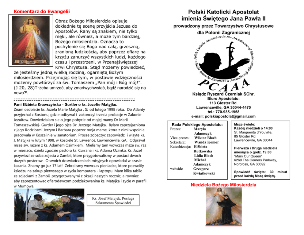 Komentarz do Ewangelii Obraz Bożego Miłosierdzia opisuje dokładnie tę scenę przyjścia Jezusa do Apostołów. Rany są znakiem, nie tylko męki, ale również, a może tym bardziej, Bożego miłosierdzia. Oznacza to pochylenie się Boga nad całą, grzeszną, zranioną ludzkością, aby poprzez ofiarę na krzyżu zanurzyć wszystkich ludzi, każdego czasu i przestrzeni, w Przenajświętszej Krwi Chrystusa. Stąd możemy powiedzieć, że jesteśmy jedną wielką rodziną, ogarniętą Bożym miłosierdziem. Przejmując się tym, w postawie wdzięczności możemy powtórzyć za św. Tomaszem „Pan mój i Bóg mój!”. (J 20, 28)Trzeba umrzeć, aby zmartwychwstać, bądź narodzić się na nowo?\ -----------------------------------------------------------------------Pani Elżbieta Krawczyńska - Gurtler o ks. Jozefie Matyjku. Znam osobiscie ks. Jozefa Marie Matyjka , SJ od lutego 1998 roku. Do Atlanty przyjechal z Bostonu, gdzie odbywal i zakonczyl trzecia probacje w Zakonie Jezuitow. Dowiedzialam sie o jego pobycie od mojej mamy Dr Marii Tomaszewskiej- Gurtler i jego ojca Dr. Jerzego Matyjka. Bylam zaprzyjazniona z jego Rodzicami Jerzym i Barbara poprzez moja mame, ktora z nimi wspolnie pracowala w Koszalinie w sanatorium. Prosze zobaczyc zapowiedz i wizyte ks. J. Matyjka w lutym 1998, w kosciele St. Lawrence, Lawrenceville, GA. Odprawil msze sw. razem z ks. Adamem Ozimkiem. Mielismy tam wowczas msze sw. raz w miesiacu, dzieki zgodzie pastora ks. Currana i ks. Adama Ozimka. Ks. Jozef przywiozl ze soba zdjecia z Zambii, ktore przygotowalismy w postaci dwoch duzych posterow. O swoich doswiadczeniach misyjnych opowiadal w czasie kazania. Znamy go juz 17 lat! Zebralismy wowczas pieniadze, ktore pozwolily ksiedzu na zakup pierwszego w zyciu komputera - laptopu. Mam kilka tablic ze zdjeciami z Zambii, przygotowanymi z okazji naszych rocznic, a rowniez aby zaprezentowac ofiarodawcom podziekowanina ks. Matyjka i zycie w parafii w Mumbwa. Ks. Józef Matyjek. Posługa Sakramentu Spowiedzi Świętej. Polski Katolicki Apostolat imienia Świętego Jana Pawła II prowadzony przez Towarzystwo Chrystusowe dla Polonii Zagranicznej Ksiądz Ryszard Czerniak SChr. Biuro Apostolatu: 113 Gloster Rd. Lawrenceville, GA 30044-4470 tel.: 770-935-1958 e-mail: [email protected] Rada Polskiego Apostolatu: Prezes: Maryla Adamczyk Vice-prezes: Wiktor Błach Sekretarz: Wanda Komor Katechizacja: Elżbieta Rutkowska Lidia Błach Michał Adamczyk webside Grzegorz Kwiatkowski Msze święte: Każdej niedzieli o 14:00 St. Marguerita d'Youville, 85 Gloster Rd. Lawrenceville, GA 30044 Pierwsza i Druga niedziela miesiąca o godz. 19:00 "Mary Our Queen" 6260 The Corners Parkway, Norcross, GA 30092 Spowiedź święta: 30 minut przed każdą Mszą świętą. Niedziela Bożego Miłosierdzia Biuletyn: 12 kwietnia 2015 Miłosierdzie Boże Dla Jego Bolesnej Męki miej miłosierdzie dla nas i świata całego. Uwierzyłeś, Tomaszu, bo Mnie ujrzałeś; błogosławieni, którzy nie widzieli, a uwierzyli. ****************************************************************************************************************** Intencje Mszalne Niedziela, 12 kwietnia 2015 Md'Y - 2:00pm MoQ- 7:00pm + Edward Kurzępa w rocznicę śmierci. Niedziela, 19 kwietnia 2015 + Janina Borek w 10-ta rocznica śmierci. ++ Anna, Michał, Maria Czosnowski, +Janina Szablowska. Md'Y - 2:00pm Niedziela, 26 kwietnia 2015 Md'Y - 2:00pm + Katarzyna, Ludwik, Marian Pawelec; Niedziela, 3 maja 2015 - Dziękczynna za wielość łask z prośbą o zdrowie, Boże błogosławieństwo, opiekę Matki Bożej Częstochowskiej z okazji rocznicy urodzin Ewy Różak. OGŁOSZENIA 1. W Niedzielę Miłosierdzia - druga taca przeznaczona na misjie. Wspomożemy ks. Józefa Matyjka SJ, pracującego w Afryce i prowadzone przez niego dzieło misyjne. 2. Trawamy w Roku Jubileuszowym celebrując 25-tą rocznicę powstania naszej wspólnoty i z czasem utworzenia Polskiego Apostolatu. Zachęcam wszystkich do znalezienia czasu na prywatną adorację Najświętszego Sakramentu w kaplicy wieczysej adoracji. W kaplicy znajdują się relikwie św. Jana Pawła II, patrona naszego Apostolatu. Przed obliczem Chrystusa ukrytego w Najświętszym Sakramencie za wstawiennictwem św. Jana Pawła II proszę o modlitwę w intencji naszej wspólnoty, naszego Apostolatu. 3. Zebranie Rady Apostolatu: Na zebraniu Rady w dniu 10 kwietnia 2015 zostało postanowione, że Ksiądz będzie umieszczał krótkie sprawozdanie z zebrania w Biuletynie. 1- Kupno dwóch odkurzaczy (potrzebujemy dwa dobre odkurzacze, bo kościelne są dwa popsute i dwa bardzo kiepskie). Nadal poszukujemy aby znalezć dobrej jakości w dobrej cenie. 2- Problem kawy (kościelne "coffee makers" sa nadal zepsute). Mamy zamiar kupić dla PCAAA , trzeba rozeznać sie w cenach i typach dostępnych w sprzedaży. 3- Odbyła się kontrola naszych spraw finansowych przez przedstawicielkę Archidiecezji, czekamy na wyniki. 4- 10-go maja I Komunia.św 5- Sprawa organizacji Majówki 23-go maja. Miejsce jest zarezerwowane, uzgodniono podział zadań. 6- Boże Ciało 7-go czerwca. Jak zwykle zostaną przygotowane cztery ołtarze do procesjii, czym zajmie się Lidka. 7- Planujemy zorganizowanie wspólnie z Polskim Klubem ogniska świętojańskiego 20-go czerwca. 8- Wstępne ustalenia do Festiwalu Pierogów, który ma się odbyć w tym roku 29-go sierpnia. 9- Potrzebne jest skompletowanie listy E-mailowej Apostolatu - po mszy.św będziemy się starali uzupełnić brakujące E-maile na liście członków Apostolatu. 10- Dwa razy do roku na spotkaniu przy kawie zorganizowane będzie zebranie ogólne Apostolatu, co będzie wcześniej ogłoszone. Pytania i propozycje prosimy kierować do przewodniczącej Rady Maryli Adamczyk na E-mail [email protected] 4. Depozyty i kolekty. Marzec 2015 StMdY 3/01/2015 ------ $640 MOQ 3/01/2015 ------ $179 StMdY 3/08/2015 ------ $996 StMdY 3/08/2015 ------ $455 (druga kolekta dla St.Vincent de Paul) MOQ 3/08/2015 ------ $87 StMd