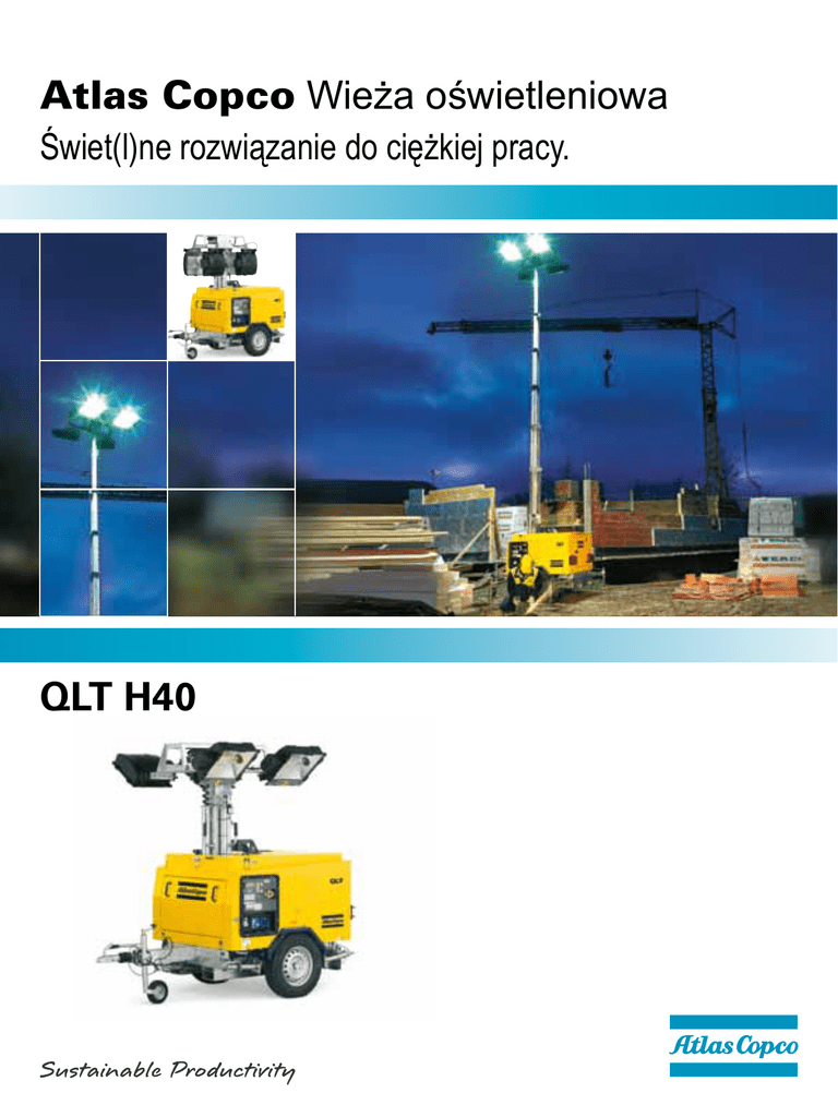 Atlas Copco Wieża oświetleniowa Świet(l)ne rozwiązanie do ciężkiej pracy. QLT H40 Cechy i opcje • Hydrauliczny automatyczny podnośnik - pełna wysokość w 15 sekund • Maszt hydrauliczny sprzęgnięty z hamulcem bezpieczeństwa • Zbiornik paliwa gwarantujący pracę przez 80 h • Rama bezwyciekowa zabezpieczająca środowisko naturalne • Cztery wysuwane podpory dla stabilizacji pracy masztu • Dedykowane włączniki lamp regulujące natężenie oświetlenia w zależności od potrzeb użytkownika • Układ podnoszący”heavy duty” wykonany ze stali nierdzewnej dla bezpieczeństwa i długiego życia maszyny. • Gniazda wyjściowe 1ph: 2 x 16A lub 1 x 16A i 1 x 32A (230 V - 1ph) 2.3 kW (LTP) dostępne przy pracującym maszcie. • Wejście zasilania zewnetrznego: 1 x 32A Metalohalogenowe lampy Technologia metalohalogenowa jest jedną z najbardziej efektywnych sposobów zamiany energii elektrycznej na światło. Wymaga mniejszej mocy do produkcji światła co prowadzi do idealnego oświetlenia miejsca pracy, boisk sportowych i imprez plenerowych. Długa żywotność lampy pozwala na zmniejszenie kosztów eksploatacyjnych urządzenia. Sprawdzone rozwiązanie Nowy QLT bazuje na rozwiązaniach sprawdzonych przez naszych klientów. Zgodnie z wymaganiami zamontowany układ kontrolny i zabezpieczający. Maszt wysuwa się do wysokosci 9.2m z możliwością obrotu 350°. Całość konstrukcji zabezpieczona jest podporami wysuwanymi z podwozia oraz hamulcem postojowym i bezpieczeństwa. Maszt oświetleniowy QLT jest łatwy w obsłudze, manewrowaniu, pozwala także w prosty sposób zająć optymalną pozycję w miejscu pracy. Dane Techniczne QLT H40 Silnik Model Moc znamionowa Pojemność zbiornika Autonomia pracy Norma emisji spalin Maksymalny poziom mocy akustycznej zgodnie z 2000/14/EC OND (LWA) Maksymalny poziom ciśnienia akustycznego w odległości 7 m Perkins 403D -11G 3 Cylindrowy silnik Diesel 8.4 kW 145 litrów 80 h EU Stage II 90 dBA 65 dBA Alternator Model Sincro SK 160 SA 1 Klasa izolacji H Moc znamionowa 9 kVA Oświetlenie Lampy Lighting capacity (max.) 4 metal halide 1000W lamps 85.000 lumenów/źródło Maszt Maksymalna wysokość 9,2 m Sterowanie automatyczne Obrót Maksymalna prędkość wiatru 350° 80 km/h Wymiary i waga (podwodzie z dyszlem holowniczym bez możliwości regulacji) L x W x H (m) Masa (bez płynów / gotowy do pracy) 2.46 x 1.32 x 2.27 1120 kg / 1240 kg Wymiary i waga (podwodzie z dyszlem holowniczym z możliwością regulacji) L x W x H (m) Masa (bez płynów / gotowy do pracy) Nacisk na dyszla na zaczep (gotowy do pracy) 2.91 x 1.32 x 2.27 1160 kg / 1270 kg 70 kg (rozciągnięty) 74 kg (złożony) Zasięg technologiczny masztu QLT 10m / 200 Lx 25m / 100 Lx Należy stosować wyłącznie części zamienne posiadające akceptację producenta. Uszkodzenia lub usterki, które są wynikiem użycia części nie posiadających akceptacji producenta nie są objęte zobowiązaniami wynikającymi z gwarancji lub rękojmi. 35m / 50 Lx www.atlascopco.pl 2935 9784 32 - Dane techniczne mogą ulec zmianie bez uprzedniego powiadomienia. Copyright 2011, Atlas Copco Airpower n.v., Wilrijk, Belgia. QLT Maszt oświetleniowy