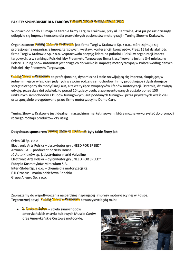 PAKIETY SPONSORSKIE DLA TARGÓW TTUUNNIINNGG SSHHO OW WW W KKRRAAKKO OW WIIEE 22001122 W dniach od 12 do 13 maja na terenie firmy Targi w Krakowie, przy ul. Centralnej 41A już po raz dziesiąty odbędzie się impreza tworzona dla prawdziwych pasjonatów motoryzacji - Tuning Show w Krakowie. Organizatorem TTuunniinngg SShhoow ww w KKrraakkoow wiiee jest firma Targi w Krakowie Sp. z o.o., która zajmuje się profesjonalną organizacją imprez targowych, wystaw, konferencji i kongresów. Przez 15 lat działalności firma Targi w Krakowie Sp. z o.o. wypracowała pozycję lidera na południu Polski w organizacji imprez targowych, a w rankingu Polskiej Izby Przemysłu Targowego firma klasyfikowana jest na 3-4 miejscu w Polsce. Tuning Show natomiast jest drugą co do wielkości imprezą motoryzacyjną w Polsce według danych Polskiej Izby Przemysłu Targowego. TTuunniinngg SShhoow ww w KKrraakkoow wiiee to profesjonalna, dynamiczna i stale rozwijającą się impreza, skupiającą w jednym miejscu właścicieli jedynych w swoim rodzaju samochodów, firmy produkujące i dystrybuujące sprzęt niezbędny do modyfikacji aut, a także tysiące sympatyków i fanów motoryzacji. Ostatnią, dziewiątą edycję, przez dwa dni odwiedziło ponad 10 tysięcy osób, a zaprezentowanych zostało ponad 150 unikalnych samochodów z klubów tuningowych, aut poddanych tuningowi przez prywatnych właścicieli oraz specjalnie przygotowane przez firmy motoryzacyjne Demo Cary. Tuning Show w Krakowie jest idealnym narzędziem marketingowym, które można wykorzystad do promocji różnego rodzaju produktów czy usług. Dotychczas sponsorem TTuunniinngg SShhoow ww w KKrraakkoow wiiee były takie firmy jak: Orlen Oil Sp. z o.o Electronic Arts Polska – dystrybutor gry „NEED FOR SPEED” Artman S.A. – producent odzieży House JC Auto Kraków sp. j. dystrybutor marki Valvoline Electronic Arts Polska – dystrybutor gry „NEED FOR SPEED” Fabryka Kosmetyków Miraculum S.A. Inter-Global Sp. z o.o. – chemia dla motoryzacji K2 F.H Ornatus - marka odzieżowa Repablo Grupa Allegro Sp. z o.o. Zapraszamy do współtworzenia najbardziej inspirującej imprezy motoryzacyjnej w Polsce. Tegorocznej edycji TTuunniinngg SShhoow ww w KKrraakkoow wiiee towarzyszyd będą m.in: 22.. CCuussttoom m SSaalloonn – strefa samochodów amerykaoskich w stylu kultowych Muscle Carów oraz Amerykaoskie Custowe motocykle. PPookkaazzyy DDrriiffttuu w wykonaniu teamu D1 KrK. SSttuunntt M Moottooccyykklloow wyy Eliminacje W Woojjnnyy PPóółłnnoocc--PPoołłuuddnniiee Profesjonalne zawody CCaarr AAuuddiioo –– DDBB TTuunniinngg CCuupp TTuunniinngg GGaarraaggee Poniżej prezentujemy pakiety sponsorskie, które dają możliwośd zaprezentowania oferty firmy tysiącom odwiedzających. Zapraszamy do zapoznania się z ramowymi wariantami pakietów sponsorskich TTuunniinngg SShhoow ww w KKrraakkoow wiiee.. Targi w Krakowie zobowiązują się do udostępnienia usług w ramach następujących pakietów: Zapraszamy do współpracy Zespół organizacyjny Targów Tuning Show w Krakowie. Sponsor Targów Tuning Show w Krakowie 2012 Rodzaj Pakietu: „Mini” „Opti” „Maxi” logo sponsora na stronie internetowej www.tuningshow.krakow.pl i stronie www.targi.krakow.pl zakładka Tuning Show w Krakowie logo na plakatach reklamowych format B1 Tuning Show w 1 % wielkości layoutu ilości 2000 szt. w rozmiarze nie mniejszej niż: plakatu tj. 7,07 cm x 10 cm logo na plakatach reklamowych format B1 Tuning Show w 2 % wielkości layoutu ilości 2000 szt. w rozmiarze nie mniejszej niż: plakatu tj. 14,14 cm x 20 cm logo na plakatach reklamowych format B1 Tuning Show w 3 % wielkości layoutu ilości 2000 szt. w rozmiarze nie mniejszej niż: plakatu tj. 21,21 cm x 30 cm logo na ulotkach reklamowych Tuning Show format B5 w 1% wielkości layoutu ilości 20 000 szt. w rozmiarze nie mniejszym niż: ulotki. logo na ulotkach reklamowych Tuning Show format B5 w 2% wielkości layoutu ilości 20 000 szt. w rozmiarze nie mniejszym niż: ulotki. logo na ulotkach reklamowych Tuning Show format B5 w 3% wielkości layoutu ilości 20 000 szt. w rozmiarze nie mniejszym niż: ulotki. banner reklamowy na stronie internetowej www.tuningshow.krakow.pl logo na 1) wizualizacja sponsora przed rozpoczęciem imprezy: reklamach w prasie branżowej i codziennej (z 1% layoutu reklamy wyjątkiem małych reklam modułowych) nie mniejsze niż: logo na reklamach w prasie branżowej i codziennej (z 2% layoutu reklamy wyjątkiem małych reklam modułowych) nie mniejsze niż: logo na reklamach w prasie branżowej i codziennej (z 3% layoutu reklamy wyjątkiem małych reklam modułowych) nie mniejsze niż: logo na flashowych bannerach reklamowych Tuning Show zamieszczanych na stronach partnerów w tym Onet.pl, moto.Allegro.pl. logo dźwiękowe sponsora w spotach reklamowych w Radiu Eska oraz RMF Maxxx 2) wizualizacja sponsora w trakcie imprezy powierzchnia niezabudowana 25 m2 lub stoisko 10 m2 zabudowane powierzchnia niezabudowana 40 m2 lub stoisko 15 m2 zabudowane powierzchnia niezabudowana 80 m2 lub stoisko 20 m2 zabudowane miejsce pod banner własny w hali wystawienniczej szt. 2 miejsce pod banner własny w hali wystawienniczej szt. 4 miejsce pod banner własny w hali wystawienniczej szt. 6 miejsce pod banner własny na zewnątrz hali w strefie pokazów i szt. 2 prezentacji miejsce pod banner własny na zewnątrz hali w strefie pokazów i szt. 4 prezentacji miejsce pod banner własny na zewnątrz hali w strefie pokazów i szt. 6 prezentacji miejsce pod flagi reklamowe sponsora wyłożenie materiałów reklamowych dla zwiedzających na recepcji Targowej dystrybucja materiałów reklamowych wśród zwiedzających i wystawców logo sponsora na biletach wstępu w ilości 20 000 szt. profesjonalnie przygotowany konkurs o puchar sponsora na najlepiej stuningowany samochód Tuning Show 2012 i/lub wirtualne zawody samochodowe. profesjonalnie przygotowany konkurs o puchar sponsora na stuningowany samoch