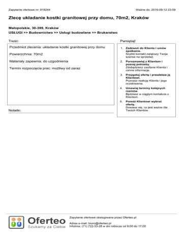 Zapytanie ofertowe nr: 918244 Ważne do: 2016-09-12 23:59 Zlecę układanie kostki granitowej przy domu, 70m2, Kraków Małopolskie, 30-399, Kraków USŁUGI >> Budownictwo >> Usługi budowlane >> Brukarstwo Treść: Pamiętaj! Przedmiot zlecenia: układanie kostki granitowej przy domu 1. Zadzwoń do Klienta i umów spotkanie. Szybki kontakt zwiększy Twoje szanse na sprzedaż. Powierzchnia: 70m2 Materiały zapewnia: do uzgodnienia Termin rozpoczęcia prac: możliwy od zaraz 2. Porozmawiaj z Klientem i poznaj potrzeby. Zdobędziesz zaufanie Klienta i cenne informacje. 3. Przygotuj ofertę i przedstaw ją Klientowi. Poznasz reakcję Klienta i jego oczekiwania. Notatki: 4. Umawiaj terminy kolejnych rozmów. Będziesz w ciągłym kontakcie z Klientem. 5. Pomóż Klientowi wybrać ofertę. Dowiesz się, co jest ważne dla Twoich Klientów. Zapytanie ofertowe obsługiwane przez Oferteo.pl Adres e-mail: [email protected] Infolinia: (71) 722-33-28 w dni robocze od 9:00 do 17:00