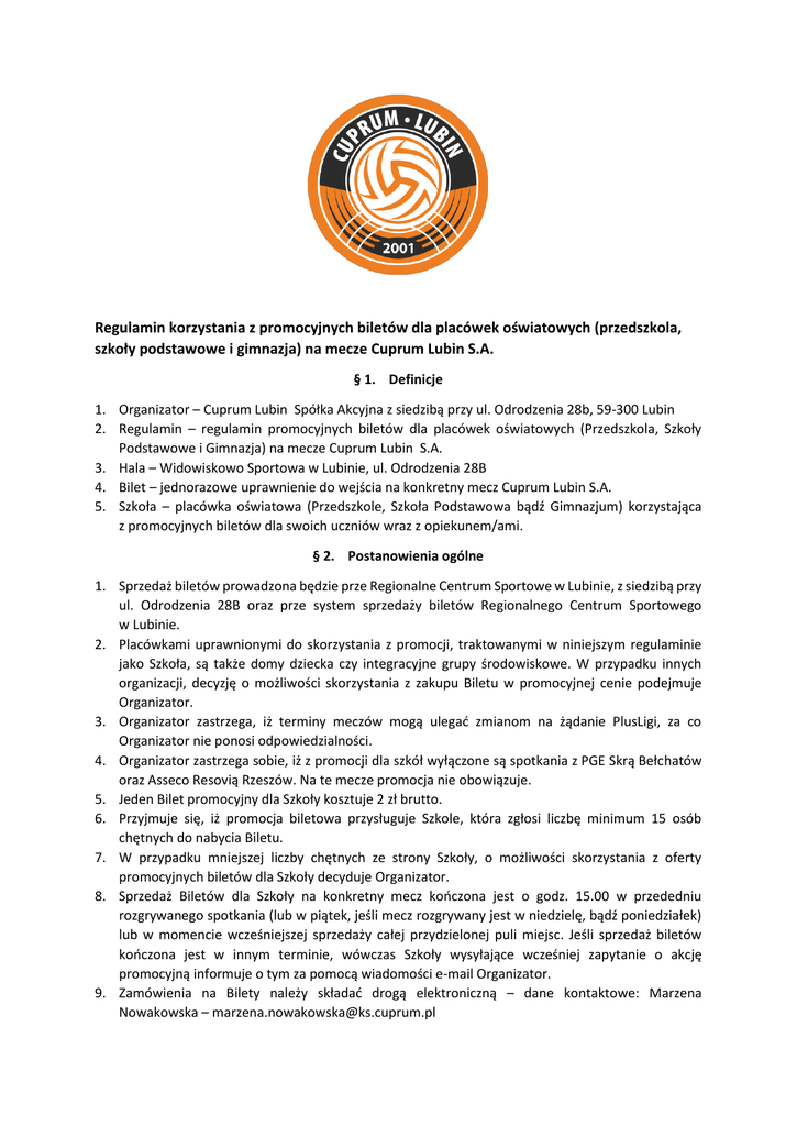 Regulamin korzystania z promocyjnych biletów dla placówek oświatowych (przedszkola, szkoły podstawowe i gimnazja) na mecze Cuprum Lubin S.A. § 1. Definicje 1. Organizator – Cuprum Lubin Spółka Akcyjna z siedzibą przy ul. Odrodzenia 28b, 59-300 Lubin 2. Regulamin – regulamin promocyjnych biletów dla placówek oświatowych (Przedszkola, Szkoły Podstawowe i Gimnazja) na mecze Cuprum Lubin S.A. 3. Hala – Widowiskowo Sportowa w Lubinie, ul. Odrodzenia 28B 4. Bilet – jednorazowe uprawnienie do wejścia na konkretny mecz Cuprum Lubin S.A. 5. Szkoła – placówka oświatowa (Przedszkole, Szkoła Podstawowa bądź Gimnazjum) korzystająca z promocyjnych biletów dla swoich uczniów wraz z opiekunem/ami. § 2. Postanowienia ogólne 1. Sprzedaż biletów prowadzona będzie prze Regionalne Centrum Sportowe w Lubinie, z siedzibą przy ul. Odrodzenia 28B oraz prze system sprzedaży biletów Regionalnego Centrum Sportowego w Lubinie. 2. Placówkami uprawnionymi do skorzystania z promocji, traktowanymi w niniejszym regulaminie jako Szkoła, są także domy dziecka czy integracyjne grupy środowiskowe. W przypadku innych organizacji, decyzję o możliwości skorzystania z zakupu Biletu w promocyjnej cenie podejmuje Organizator. 3. Organizator zastrzega, iż terminy meczów mogą ulegać zmianom na żądanie PlusLigi, za co Organizator nie ponosi odpowiedzialności. 4. Organizator zastrzega sobie, iż z promocji dla szkół wyłączone są spotkania z PGE Skrą Bełchatów oraz Asseco Resovią Rzeszów. Na te mecze promocja nie obowiązuje. 5. Jeden Bilet promocyjny dla Szkoły kosztuje 2 zł brutto. 6. Przyjmuje się, iż promocja biletowa przysługuje Szkole, która zgłosi liczbę minimum 15 osób chętnych do nabycia Biletu. 7. W przypadku mniejszej liczby chętnych ze strony Szkoły, o możliwości skorzystania z oferty promocyjnych biletów dla Szkoły decyduje Organizator. 8. Sprzedaż Biletów dla Szkoły na konkretny mecz kończona jest o godz. 15.00 w przededniu rozgrywanego spotkania (lub w piątek, jeśli mecz rozgrywany jest w niedzielę, bądź poniedziałek) lub w momencie wcześniejszej sprzedaży całej przydzielonej puli miejsc. Jeśli sprzedaż biletów kończona jest w innym terminie, wówczas Szkoły wysyłające wcześniej zapytanie o akcję promocyjną informuje o tym za pomocą wiadomości e-mail Organizator. 9. Zamówienia na Bilety należy składać drogą elektroniczną – dane kontaktowe: Marzena Nowakowska – [email protected] 10. Pytania odnośnie promocji dla Szkół należy kierować do Marzeny Nowakowskiej – tel. 76 756 11 17 11. Po zamówieniu Biletów u Organizatora otrzymuje się e-mail na wskazany wcześniej adres, w którym znajduje się informacja w jaki sposób, a także gdzie należy odebrać Bilety. 12. Nie ma ograniczeń dla Szkół odnośnie zamawiania Biletów. Przyjmuje się jednak, że na każdą 15sto osobową grupę Szkoła musi zapewnić jednego dorosłego opiekuna. 13. Bilety promocyjne przygotowane dla Szkół należy odebrać nie później niż 20 minut przed rozpoczęciem danego spotkania. § 3. Proces zakupu 1. Proces zakupu składa się z kolejnych etapów: a) zamówienie biletów u Organizatora, b) wysłanie listy zgłoszeniowej osób z imieniem i nazwiskiem, a także numerem PESEL, dla których przygotowane zostaną Bilety (zaznaczenie na liście opiekuna grupy, bądź opiekunów) c) odbiór biletów przez opiekuna w kasie biletowej numer 2 po okazaniu dowodu osobistego z podaniem informacji o akcji promocyjnej dla Szkół (Organizator zastrzega sobie możliwość zmiany sposobu odbioru Biletów o czym informuje w wiadomości e-mail Szkołę) d) dokonanie płatności 2. Po dokonaniu przez Organizatora rezerwacji miejsc w systemie elektronicznym dla danej Szkoły, nie ma możliwości zmniejszenia lub zwiększenia liczby zakupionych Biletów 3. Organizator zastrzega sobie możliwość zmniejszenia lub zwiększenia liczby Biletów dla danej Szkoły w zależności od dostępności wolnych miejsc jednak nie później niż do godz. 15.00 w przededniu rozpoczęcia meczu (lub w piątek, jeśli mecz rozgrywany jest w niedzielę bądź poniedziałek) § 5. Ochrona danych osobowych 1. Szkoła wyraża zgodę na przetwarzanie przez Organizatora danych osobowych podanych na liście zgłoszeniowej. § 6. Postanowienia końcowe 1. Korespondencja ze Szkołą będzie prowadzona drogą elektroniczną bądź telefoniczną. 2. Prawem właściwym dla zawartej umowy jest prawo polskie. 3. W sprawach nieuregulowanych w przedmiotowej umowie mają zastosowanie przepisy Kodeksu Cywilnego.