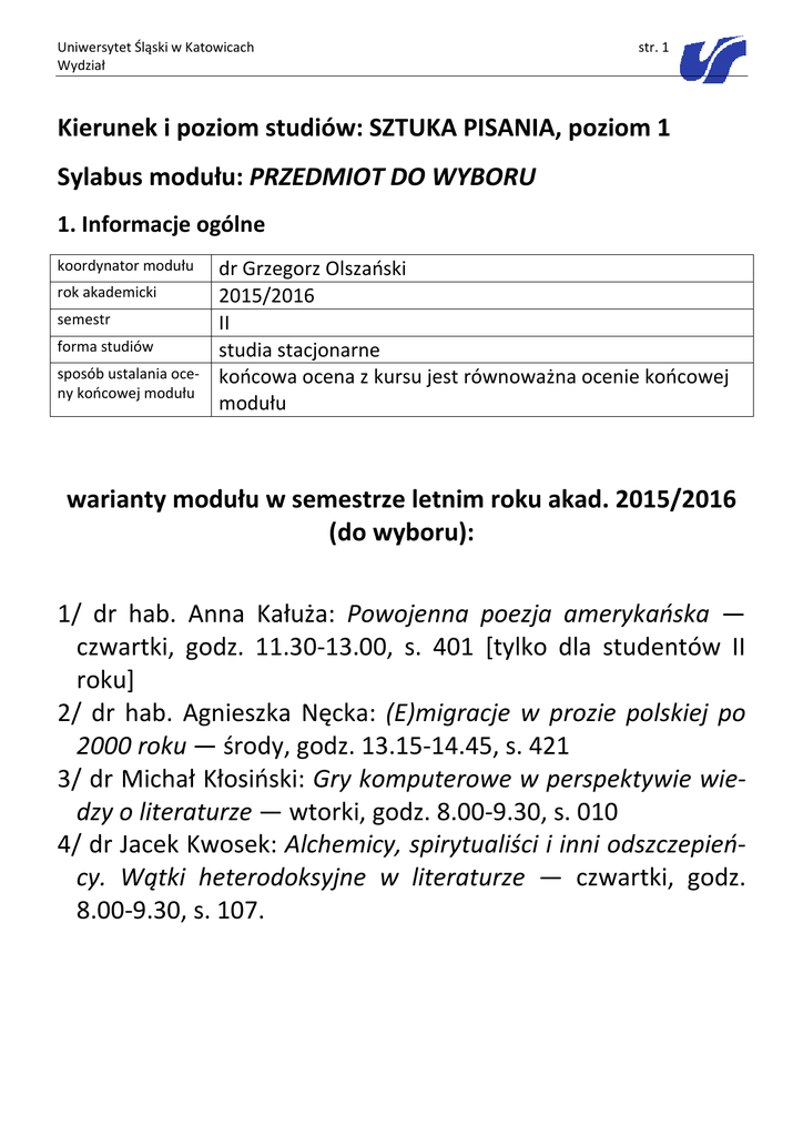 Uniwersytet Śląski w Katowicach Wydział str. 1 Kierunek i poziom studiów: SZTUKA PISANIA, poziom 1 Sylabus modułu: PRZEDMIOT DO WYBORU 1. Informacje ogólne koordynator modułu rok akademicki semestr forma studiów sposób ustalania oceny końcowej modułu dr Grzegorz Olszański 2015/2016 II studia stacjonarne końcowa ocena z kursu jest równoważna ocenie końcowej modułu warianty modułu w semestrze letnim roku akad. 2015/2016 (do wyboru): 1/ dr hab. Anna Kałuża: Powojenna poezja amerykańska — czwartki, godz. 11.30-13.00, s. 401 [tylko dla studentów II roku] 2/ dr hab. Agnieszka Nęcka: (E)migracje w prozie polskiej po 2000 roku — środy, godz. 13.15-14.45, s. 421 3/ dr Michał Kłosiński: Gry komputerowe w perspektywie wiedzy o literaturze — wtorki, godz. 8.00-9.30, s. 010 4/ dr Jacek Kwosek: Alchemicy, spirytualiści i inni odszczepieńcy. Wątki heterodoksyjne w literaturze — czwartki, godz. 8.00-9.30, s. 107. Uniwersytet Śląski w Katowicach Wydział str. 2 Nazwa wariantu modułu: POWOJENNA POEZJA AMERYKAŃSKA 2. Opis zajęć dydaktycznych i pracy studenta nazwa POWOJENNA POEZJA AMERYKAŃSKA prowadzący grupa(-y) treści zajęć metody prowadzenia zajęć liczba godzin dydaktycznych (kontaktowych) liczba godzin pracy własnej studenta opis pracy własnej studenta organizacja zajęć literatura obowiązkowa literatura uzupełniająca informacje dodatkowe kod -------------- dr hab. Anna Kałuża logowanie w systemie USOS (limit 15 osób) Zapoznanie studentów z najbardziej rozpowszechnionymi ideologiami estetycznymi powojennej poezji amerykańskiej: szkołą nowojorską, modernizmem drugiej fali, konfesyjnymi poetykami, obiektywistami, poezją obywatelską (civic poetry), language poetry. Rozpoznanie zadomowionych w poezji polskiej sposobów pisania i myślenia o wierszu o proweniencji amerykańskiej. Stylistyczne próby polegające na imitacji wybranych estetyk. Zajęcia o charakterze warsztatowym; informacje o historii poezji amerykańskiej oraz jej kontekstach zostana przekazane w trybie wykładowym 30 60 Student jest zobowiązany do lektury zalecanych tekstów poetyckich i krytycznoliterackich; powinien wykazywac samodzielność interpretacyjną Polskie przekłady wybranych wierszy takich autorów, jak: Charles Reznikoff, Wiliams Carlos Wiliams, John Berryman, Sylwia Plath, Adrienne Rich, Frak O’Hara, John Ashbery, James Schuyler, Elizabeth Bishop, Ron Padgett, Charles Bernstein. Historia literatury amerykańskiej, t. 2 red. A. Salska, Kraków 2003. Piotr K. Gwiazda, US Poetry in the Age of Empire 1972-2012, NY 2014. J. Jarniewicz, Od pieśni do skowytu. Szkice o poetach amerykańskich, Wrocław 2008. J. Fiedorczuk, „Złożoność nie jest zbrodnią”. Szkice o poezji amerykańskiej, Warszawa 2015. P. Sommer, Artykuły pochodzenia zagranicznego, Gdańsk 1996. Wybrane numery „Literatury na Świecie” poświęcone poezji amerykańskiej [email protected] Uniwersytet Śląski w Katowicach Wydział str. 3 3. Opis sposobów weryfikacji efektów kształcenia modułu Nazwa POWOJENNA POEZJA AMERYKAŃSKA kod zajęć osoba przeprowadzająca weryfikację grupa wymagania merytoryczne kryteria oceny przebieg procesu weryfikacji informacje dodatkowe kod ------------------------- --------------------dr hab. Anna Kałuża logowanie w systemie USOS (limit 15 osób) Student posiada wiedzę z zakresu poetyki opisowej i historycznej; jest zaznajomiony z najważniejszymi strategiami poetyckimi w Polsce. Oceniany będzie stopień przygotowania studenta do zajęć, aktywność (udział w dyskusji), przygotowane teksty poetyckie. aktywność na zajęciach, samodzielne próby poetyckie [email protected] Nazwa wariantu modułu: (E)MIGRACJE W PROZIE POLSKIEJ PO 2000 ROKU 2. Opis zajęć dydaktycznych i pracy studenta nazwa (E)migracje w prozie polskiej po 2000 roku prowadzący grupa(-y) treści zajęć kod -------------- dr hab. Agnieszka Nęcka logowanie w systemie USOS (limit 16 osób) Tematem kursu są różne rodzaje (e)migracji: realne, intymne, literackie i biograficzne, a więc (e)migracje wynikające ze zmiany miejsca zamieszkania) i metaforyczne (wewnętrzne, mające na celu dotarcie do skrywanych pokładów własnego „ja” i zmierzenie się z demonami tkwiącymi w podświadomości). Doświadczenia te pokazane zostały na przykładzie twórczości pisarzy, mających za sobą różne doznania biograficzne. Wśród omawianych pisarzy znajdą się między innymi: Zbigniew Kruszyński, Manuela Gretkowska, Brygida Helbig, Grażyna Plebanek, Adam Miklasz, Joanna Pawluśkiewcz, Piotr Czerwiński, Mikołaj Łoziński, Tomasz Piątek, Magdalena Tulli, Michał Witkowski. (E)migracja jako możliwość poznania siebie oraz autoterapeutyczne oswojenie traumatycznych przeżyć, takich jak m.in.: borykania się z poczuciem dojmującej obcości, zmagań z własną kobiecością, postmodernistycznego zagubienia w bibliotece, bezskutecznych prób ucieczki od nałogu, rekompensacji comming out’owego „wyjścia z szafy”, trudnego uwolnienia się od balastu przeszłości czy zaakceptowanie przeszłości, dzięki któremu będzie można żyć „normalnie”. Wśród poruszanych zagadnień znajdą się także strategie pisarskie, dzięki którym współcześni prozaicy, podrzucając i równocześnie myląc tropy biograficzne, podejmują wysiłek autopromocyjny. Uniwersytet Śląski w Katowicach Wydział metody prowadzenia zajęć liczba godzin dydaktycznych (kontaktowych) liczba godzin pracy własnej studenta opis pracy własnej studenta organizacja zajęć literatura obowiązkowa literatura uzupełniająca str. 4 Ćwiczenia (30 godz.) 30 60 Przygotowanie do zajęć, obejmujące zalecone lektury literackie i krytycznoliterackie Kurs obejmuje zajęcia o charakterze konwersatorium. M. Błędowska: Uchodźcy, półemigranci, kosmopolici. Doświadczenie emigracyjne w prozie lat dziewięćdziesiątych (M. Gretkowska, J, Rudnicki). W: Literatura utracona, poszukiwana czy odzyskana. Wokół