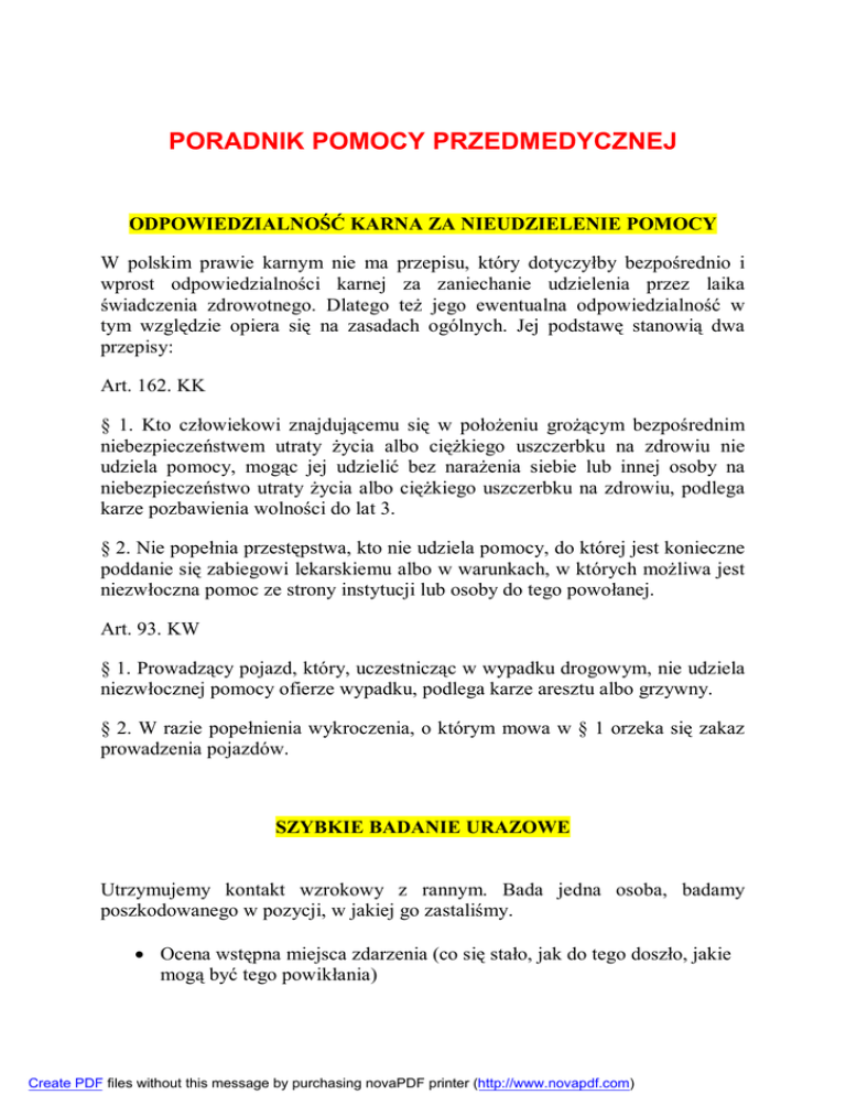 PORADNIK POMOCY PRZEDMEDYCZNEJ ODPOWIEDZIALNOŚĆ KARNA ZA NIEUDZIELENIE POMOCY W polskim prawie karnym nie ma przepisu, który dotyczyłby bezpośrednio i wprost odpowiedzialności karnej za zaniechanie udzielenia przez laika świadczenia zdrowotnego. Dlatego też jego ewentualna odpowiedzialność w tym względzie opiera się na zasadach ogólnych. Jej podstawę stanowią dwa przepisy: Art. 162. KK § 1. Kto człowiekowi znajdującemu się w położeniu grożącym bezpośrednim niebezpieczeństwem utraty życia albo ciężkiego uszczerbku na zdrowiu nie udziela pomocy, mogąc jej udzielić bez narażenia siebie lub innej osoby na niebezpieczeństwo utraty życia albo ciężkiego uszczerbku na zdrowiu, podlega karze pozbawienia wolności do lat 3. § 2. Nie popełnia przestępstwa, kto nie udziela pomocy, do której jest konieczne poddanie się zabiegowi lekarskiemu albo w warunkach, w których możliwa jest niezwłoczna pomoc ze strony instytucji lub osoby do tego powołanej. Art. 93. KW § 1. Prowadzący pojazd, który, uczestnicząc w wypadku drogowym, nie udziela niezwłocznej pomocy ofierze wypadku, podlega karze aresztu albo grzywny. § 2. W razie popełnienia wykroczenia, o którym mowa w § 1 orzeka się zakaz prowadzenia pojazdów. SZYBKIE BADANIE URAZOWE Utrzymujemy kontakt wzrokowy z rannym. Bada jedna osoba, badamy poszkodowanego w pozycji, w jakiej go zastaliśmy. · Ocena wstępna miejsca zdarzenia (co się stało, jak do tego doszło, jakie mogą być tego powikłania) Create PDF files without this message by purchasing novaPDF printer (http://www.novapdf.com) · Wrażenia ogólne (czy poszkodowany ma widoczne krwotoki, jak wygląda, · bezpieczne podejście do poszkodowanego · stan świadomości poszkodowanego („otwórz oczy”, „co się stało” itp.) · udrożnienie górnych dróg oddechowych (jedna ręka na czoło poszkodowanego, druga ręka – dwa, trzy palce na dolny kąt żuchwy, uniesienie brody) ocena oddechu (jaki: płytki, szybki, normalny…) · ocena oznak krążenia (skóra zaczerwieniona, ciepłota ciała, ruchy itp.) · Głowa (oglądamy czy nie ma wycieków z uszu, nosa, ust, sprawdzanie czy nie ma krwi na rękawiczkach po wykonaniu badania głowy) · Odcinek szyjny kręgosłupa (sprawdzamy czy nie ma nierówności, symetryczność tchawicy) · Klatka piersiowa (wizualna ocena stanu, 4 pkt klatki piersiowej) · Brzuch (4 pkt brzucha) · Miednica (sprawdzenie stabilności miednicy – ściśniecie i rozszerzenie) · Kończyny dolne (wizualna ocena stanu, stabilność k. udowej, k. podudzia, czucie w stopach) · Kończyny górne (wizualna ocena stanu, stabilność k. ramiennej, k. przedramienia, czucie w ręce) · Jeżeli poszkodowany przytomny przeprowadzamy wywiad SAMPLE (równocześnie z badaniem poszkodowanego, jeżeli ratowników jest dwóch robi to osoba przy głowie) gdzie: · S – Symptoms - OBJAWY · A – Allergies - ALERGIE · M –Medications - LEKI · P – Past medical history - POPRZEDNIE ZACHOROWANIA · L – Last meal - OSTATNI POSIŁEK · E – Events prior to injury - ZDARZENIA PRZED WYPADKIEM · Ponowna ocena ABC OPATRUNKI · Pęknięcie podstawy czaszki – opatrunek chłonący (wyciek płynu rdzeniowo-mózgowego) · Opatrunek oczu – opatrujemy osłaniający dwoje oczu · Opatrunek żuchwy – wysunięcie żuchwy na górę, opaska na uszy · Opatrunek nosa – „Spongostan” – wkładamy do nosa przy krwotoku, nic innego nie wkładamy Create PDF files without this message by purchasing novaPDF printer (http://www.novapdf.com) · Opatrunek szyi – ucisk dłonią, bandażujmy bandażem elastycznym (opatrunek małpi – szyja, przez głowę, pod pachą, ręka na górze), poszkodowany może sobie trzymać ręką (uciskać) · Opatrunek kręgosłupa szyjnego – zakładamy kołnierz Hanza · Opatrunek kręgosłupa – wpychamy pod lędźwie ubrania, wypełniamy naturalne krzywizny ciała, - zapobiegamy opadaniu ciała (grawitacja) · Złamanie obojczyka – wiążemy węzeł na przyprostokątnym wierzchołku chusty i robimy temblak (węzeł na szyi tylko z boku), drugą chustę obwiązujemy poziomo dla stabilizacji, sprawdzamy palce wystające z temblaka czy nie są sine, cieplejsze lub chłodniejsze, · Zwichnięcie stawu barkowego – j.w. · Płuca – opatrunek elastyczny, zakładany z dołu do góry, · Złamanie miednicy – wkładamy między ubranie miedzy naturalne krzywizny ciała, (kolana, uda, lędźwie), nie robimy ósemki na kostkach · Złamanie nogi – między kolana i kostki wkładamy coś miękkiego, obwiązujemy chustami obie nogi, dokładamy zdrową nogę, · Skręcenie kostki – bandażujemy · OPATRUNEK UCISKOWY: krwotok z tętnic, gaza, medium uciskowe, bandaż, (nie dajemy medium uciskowego na szyję. · OPASKA UCISKOWA – 6-8 cm, zakładamy 5-8 cm nad raną, np. chustą. Zakładamy przy masówkach, złamanie otwarte. (ostateczność) STANY ZAGROŻENIA ŻYCIA Układ oddechowy – płuca Układ krwionośny – serce Układ nerwowy – mózg, rdzeń kręgowy Statystycznie mamy 4.5 min na przywrócenie funkcji życiowych. Po tym czasie w mózgu następują nieodwracalne zmiany, zaczyna umierać. Więcej czasu mamy na uratowanie organizmu silniejszego (dorosły, sportowiec) niż słabszego (osoby starsze, dzieci, chorzy, otyli, prowadzący niezdrowy tryb życia). Czas ratowania człowieka zależy również od temperatury. Gdy jest zimno, spowalniają się nasze procesy, mamy więcej czasu (czasami nawet do 10 min). W upalny dzień często mamy zdecydowanie mniej. OMDLENIE Create PDF files without this message by purchasing novaPDF printer (http://www.novapdf.com) Krótkotrwała utrata przytomności (statystycznie kilka sekund) wtedy, kiedy poszkodowany omdlewa przy nas (wiemy jak długo). Omdlenie po upływie 30 sekund przechodzi w utratę przytomności. Omdlenie podczas prawidłowego funkcjonowania organizmu ustaje. · Przyczyny: · Niedotlenienie mózgu, · Szok, · Ból, · Zmęczenie, · Nadmiar tlenu,