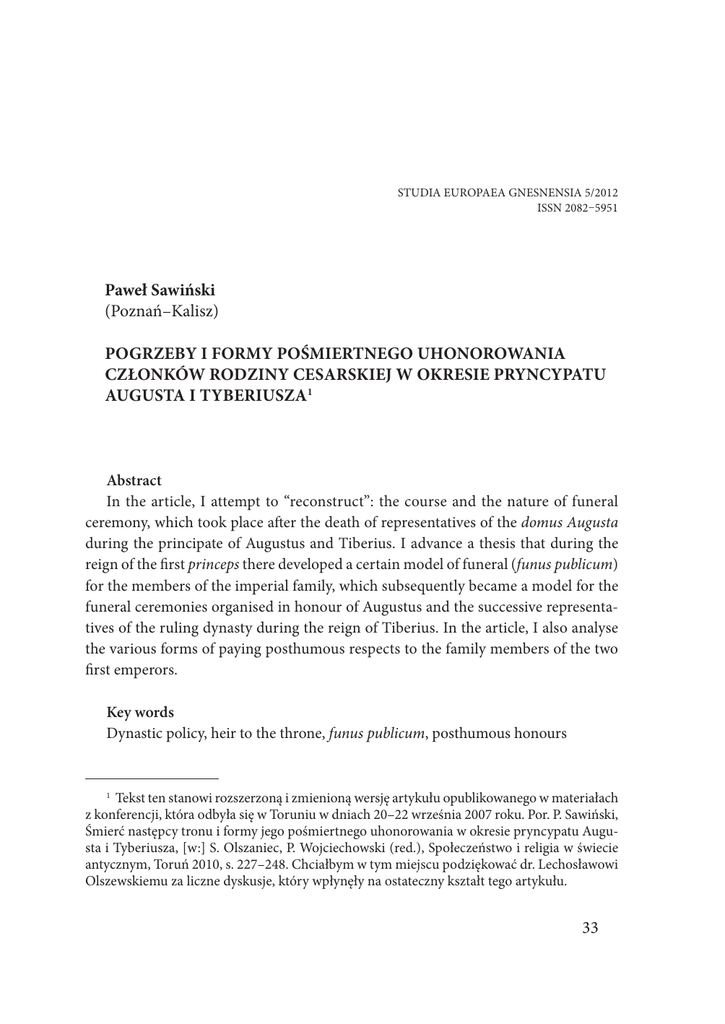 PAWEŁ SAWIŃSKI, POGRZEBY I FORMY POŚMIERTNEGO UHONOROWANIA STUDIA EUROPAEA GNESNENSIA 5/2012 ISSN 2082–5951 Paweł Sawiński (Poznań–Kalisz) POGRZEBY I FORMY POŚMIERTNEGO UHONOROWANIA CZŁONKÓW RODZINY CESARSKIEJ W OKRESIE PRYNCYPATU AUGUSTA I TYBERIUSZA1 Abstract In the article, I attempt to “reconstruct”: the course and the nature of funeral ceremony, which took place after the death of representatives of the domus Augusta during the principate of Augustus and Tiberius. I advance a thesis that during the reign of the first princeps there developed a certain model of funeral (funus publicum) for the members of the imperial family, which subsequently became a model for the funeral ceremonies organised in honour of Augustus and the successive representatives of the ruling dynasty during the reign of Tiberius. In the article, I also analyse the various forms of paying posthumous respects to the family members of the two first emperors. Key words Dynastic policy, heir to the throne, funus publicum, posthumous honours 1 Tekst ten stanowi rozszerzoną i zmienioną wersję artykułu opublikowanego w materiałach z konferencji, która odbyła się w Toruniu w dniach 20–22 września 2007 roku. Por. P. Sawiński, Śmierć następcy tronu i formy jego pośmiertnego uhonorowania w okresie pryncypatu Augusta i Tyberiusza, [w:] S. Olszaniec, P. Wojciechowski (red.), Społeczeństwo i religia w świecie antycznym, Toruń 2010, s. 227–248. Chciałbym w tym miejscu podziękować dr. Lechosławowi Olszewskiemu za liczne dyskusje, który wpłynęły na ostateczny kształt tego artykułu. 33 STUDIA EUROPAEA GNESNENSIA 5/2012 · IDEE Pryncypat Augusta i Tyberiusza obfitował w liczne przypadki śmierci członków dynastii panującej, w tym m.in. przewidywanych następców tronu2. Niejednokrotnie burzyło to koncepcje dynastyczne tych władców, zmuszając ich do poszukiwania kolejnych kandydatów do sukcesji. Śmierć tych osób otwierała przed cesarzem, senatem, mieszkańcami Rzymu oraz ludnością prowincji liczne możliwości ich pośmiertnego uhonorowania. W niniejszym artykule przedmiotem mojej analizy będą ceremonie pogrzebowe oraz różnorodne formy pośmiertnego uczczenia najbardziej prominentnych przedstawicieli domus Augusta — w tym przede wszystkim planowanych następców — w okresie rządów dwóch pierwszych princepsów. Natomiast poza sferą moich rozważań pozostają pogrzeby i zaszczyty, jakie organizowano i uchwalano ku czci zmarłych kobiet z rodziny cesarskiej w tym okresie. Pierwszą osobą z rodziny Augusta, która miała odegrać istotną rolę w planach politycznych i rodzinnych princepsa, był jego siostrzeniec M. Klaudiusz Marcellus. Ważnym momentem w życiu Marcellusa był niewątpliwie rok 25 p.n.e., kiedy to cesarz doprowadził do małżeństwa młodzieńca ze swoją jedyną córką Julią3. Cesarz mógł spodziewać się, że ze związku tego urodzi się potomstwo, które stanowić będzie ważny filar budowanej przez niego rodziny (domus Augusta). Niewykluczone, że August upatrywał w Marcellusie także potencjalnego pomocnika w zarządzaniu Imperium (collega imperii), czemu służyć miało nadanie mu w 24 roku wielu przywilejów. Został on m.in. zaliczony w poczet członków senatu, uzyskał prawo do kandydowania na urząd konsula 10 lat wcześniej, niż przewidywały to obowiązujące normy oraz 2 W tekście wielokrotnie będę posługiwał się terminem „następca tronu”, które nie ma rodowodu antycznego. Uważam jednak za użyteczne jego stosowanie w odniesieniu do tych członków domus Augusta, których August oraz Tyberiusz kreowali na swoich politycznych następców. Pojęcie to jest ponadto stosowane we współczesnej literaturze przedmiotu. Por m.in. W. Kuhoff, Felicior Augusto melior Traiano. Aspekte der Selbstdarstellung der römischen Kaiser während der Prinzipatszeit, Frankfurt am Main 1993, s. 58, 60; P. Zanker, August i potęga obrazów, tłum. L. Olszewski, Poznań 1999, s. 220, 227. 3 Plut. Marc. 30, 6; Suet. Aug. 63; Cass. Dio 53, 27, 5; por. także M. Corbier, Male Power and Legitimacy through Women: the domus Augusta under the Julio-Claudians, [w:] R. Hawley, B. Levick (red.), Women in Antiquity. New Assessments, London–New York 1995, s. 179, 182; D. Kienast, Römische Kaisertabelle. Grundzüge einer römischen Kaiserchronologie, Darmstadt 1996, s. 70; B. Severy, Augustus and the Family at the Birth of the Roman Empire, London–New York 2003, s. 68; R. Baumann, Women and Politics in Ancient Rome, London–New York 2003, s. 101. 34 PAWEŁ SAWIŃSKI, POGRZEBY I FORMY POŚMIERTNEGO UHONOROWANIA desygnowano go na urząd edyla, który miał objąć następnego roku4. Śmierć Marcellusa w 23 roku nie tylko zniweczyła te plany, ale była również dużym ciosem osobistym dla cesarza5. Z relacji Kasjusza Diona dowiadujemy się, że princeps uhonorował młodzieńca pogrzebem publicznym, w którego trakcie osobiście wygłosił mowę pogrzebową w ychwalającą cnoty i zalety zmarłego (laudatio funebris). Miejscem tej części ceremonii pogrzebowej Marcellusa było Forum Romanum, skąd następnie ciało zmarłego zostało przeniesione na Pole Marsowe. Tam poddano je kremacji, a prochy złożono w Mauzoleum6. Warto podkreślić, że Marcellus był pierwszym członkiem domus Augusta, którego pochowano w rodzinnym grobowcu princepsa. Z powodu śmierci młodzieńca została ponadto wprowadzona żałoba publiczna7. Wśród honorów pośmiertnych przyznanych Marcellusowi z inicjatywy Augusta Kasjusz Dion wymienia wykonane ze złota wyobrażenie zmarłego (imago), złoty wieniec oraz krzesło kurulne (sella curulis), które miały być wystawione na widok publiczny w teatrze w czasie ludi Romani. Krzesło kurulne przyozdobione wieńcem, na którym najprawdopodobniej „zasiadało” wspomniane wyżej wyobrażenie miało być umieszczone pomiędzy krzesłami urzędników organizujących te igrzyska8. Wyeksponowanie sella curulis w c