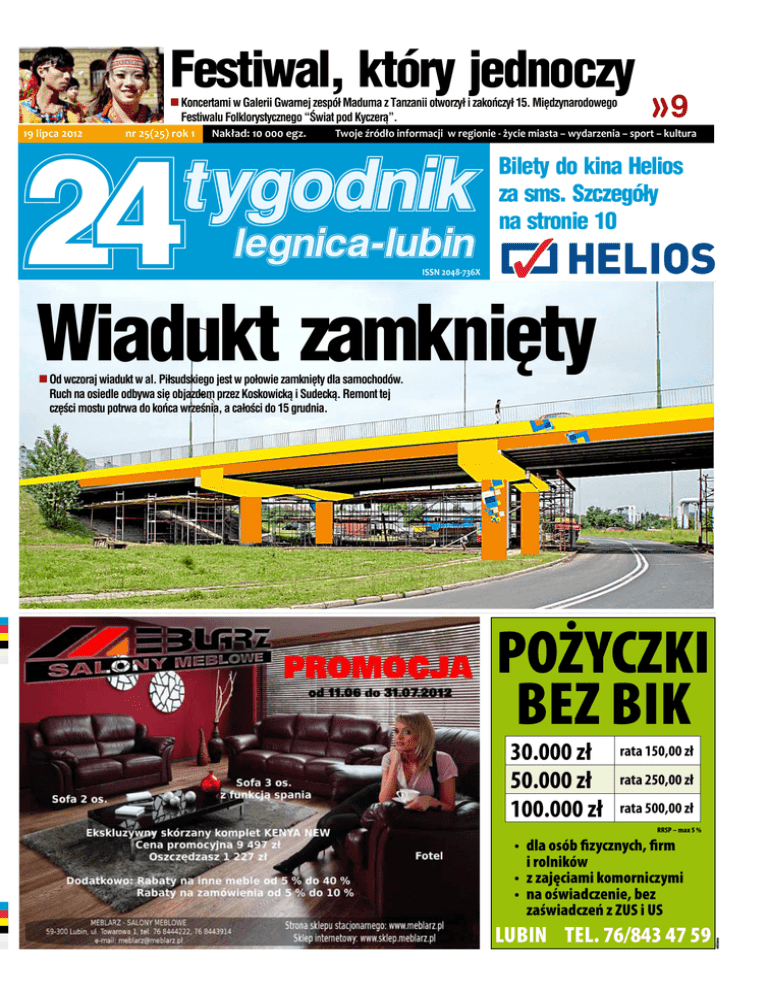 Festiwal, który jednoczy Koncertami w Galerii Gwarnej zespół Maduma z Tanzanii otworzył i zakończył 15. Międzynarodowego Festiwalu Folklorystycznego “Świat pod Kyczerą”. 19 lipca 2012 nr 25(25) rok 1 Nakład: 10 000 egz. 9 Twoje źródło informacji w regionie - życie miasta – wydarzenia – sport – kultura Bilety do kina Helios za sms. Szczegóły na stronie 10 ISSN 2048-736X Wiadukt zamknięty Od wczoraj wiadukt w al. Piłsudskiego jest w połowie zamknięty dla samochodów. Ruch na osiedle odbywa się objazdem przez Koskowicką i Sudecką. Remont tej części mostu potrwa do końca września, a całości do 15 grudnia. POŻYCZKI BEZ BIK 30.000 zł 50.000 zł 100.000 zł rata 150,00 zł rata 250,00 zł rata 500,00 zł RRSP – max 5 % LUBIN TEL. 76/843 47 59 reklama • dla osób fizycznych, firm i rolników • z zajęciami komorniczymi • na oświadczenie, bez zaświadczeń z ZUS i US 2 WIADOMOŚCI 19 lipca 2012 [email protected] Wyłączą światła 19 i 26 lipca nie będzie czynna sygnalizacja świetlna na skrzyżowaniu Chojnowskiej i Obwodnicy Zachodniej. Jak informuje TAURON Dystrybucja SA Oddział w Legnicy, w związku z pracami konserwacyjnymi 19 lipca w godzinach 8.0013.00 oraz 26 lipca od 8.00 do 12.00 nastąpi całkowita przerwa w dostawie prądu na skrzyżowaniu ulicy Chojnowskiej i Obwodnicy Zachodniej. Tym samym nie będzie czynna sygnalizacja świetlna Z trawką w majtkach Ponad 350 porcji marihuany miał schowane w slipach 17-letni legniczanin. Ustalono też dwie osoby, którym nastolatek sprzedał narkotyki. 17-latka zatrzymano w sobotę. Jak się okazało w slipach miał schowaną marihuanę, narkotyk popularnie nazywany “trawką”. Grozi mu od 3 do 10 lat więzienia. W weekend policjanci zatrzymali też 36-letniego mieszkańca centrum Legnicy. W jego mieszkaniu znaleziono 200 porcji amfetaminy i wagę elektroniczną do dzielenia narkotyku na porcje. Włamywacze wpadli Policjanci zatrzymali dwóch włamywaczy do samochodów osobowych. Jeden z nich okradł auto Holenderki na ponad 5 tys. zł. W niedzielny ranek policjanci zatrzymali 42-letniego włamywacza do fiata. Z samochodu ukradł radio i kosmetyki wartości 550 zł.Jak się okazało sprawca ma też na koncie włamanie do volkswagena, z którego ukradł radio warte 800 zł.Natomiast w sobotni wieczór w ręce policji wpadł 16-letni, pijany włamywacz. Po wybiciu szyby w zaparkowanym przy ul. Parkowej volkswagenie zabrał z niego nawigację satelitarną i odtwarzacz mp3. Straty oszacowano na 5 tys. zł. Nastolatek trafił najpierw do izby wytrzeźwień. Dealer wpadł przez kłótnię W mieszkaniu 33-letniego chojnowianina odkryto dwa kilogramy marihuany i woreczki strunowe do porcjowania narkotyku. Grozi mu do 10 lat. W sobotni wieczór chojnowscy policjanci otrzymali zgłoszenie kłótni w jednym z mieszkań. W trakcie interwencji zainteresował ich plastikowy pojemnik w jednym z pomieszczeń. W środku było 2 kg marihuany. Nowa odsłona portalu Miłość na billboardzie Na ścianie kamienicy przy ul. Chojnowskiej pojawiła się tydzień temu prośba o powrót ukochanej. Mieszkańcy okolicy przyznają, że nie znają żadnej Ani i Daniela, których drogi nagle się rozeszły. Niektórzy podejrzewają nawet, że adresatką jest chojnowianka, która dojeżdża do pracy w Legnicy. Daniel na billboardzie obiecuje jej, że się zmieni. Fot. Aurelia Irzymska Wymieniali żarówki o 3.45 nad ranem Nad ranem obudzili lokatorów Lokatorzy bloku przy ul. Księżycowej na os. Kopernika są oburzeni poranną wymianą żarówek w latarniach przy placu zabaw. Dźwig podjechał pod ich budynek o godz. 3.45. - Ryk silnika, światła i hałas pracujących ludzi obudzili mnie - przyznaje jeden z lokatorów. - Czy to naprawdę od- powiednia pora na wymianę żarówek? Pracownicy Zarządu Dróg Miejskich w trakcie najgłęb- DS MEDIA24 jako wydawca prasy bezpłatnej na terenie zagłębia miedziowego, wydawca m.inn. TYGODNIKA 24Legnica-24Lubin oraz portali 24legnica.pl, 24lubin.pl poszukuje do pracy osób na stanowisko: DZIENNIKARZ/REDAKTOR PORTALU miejsce pracy: Legnica, Lubin, Polkowice, Głogów Nasi stali Czytelnicy mogą od niedawna oglądać nową wersję naszej strony informacyjnej www.24legnica.pl. Mamy nadzieję, że jest bardziej przejrzysta i czytelniejsza, a jednocześnie ułatwi Wam dowiedzenie się, co dzieje się w naszym mieście. Do zadań należy: • pisanie i redagowanie tekstów, reportaży i wywiadów do tygodnika oraz do serwisów internetowych; • wykonywanie zdjęć do publikacji; • bieżące wspomaganie pracy redakcji. Wymagania: • wykształcenie wyższe ( lub w trakcie studiów); • znajomość pakietu MS Office; • umiejętność pisania i redagowania tekstów; • umiejętność wyszukiwania informacji; • ogólna wiedza o bieżących wydarzeniach politycznych, społecznych i sportowych z regionu; • znajomość zasady stylistyki, interpunkcji, gramatyki oraz ortografii; • wysoka kultura osobista. Zainteresowane osoby prosimy o wysłanie swojego CV oraz listu motywacyjnego na adres: [email protected] lub listownie TYGODNIK 24legnica-24lubin Ul. Najświętszej Marii Panny 5b/4, 59-220 Legnica W aplikacjach prosimy o dopisanie klauzuli: Wyrażam zgodę na przetwarzanie danych osobowych zawartych w ofercie pracy niezbędnych do procesu rekrutacji (zgodnie z ustawą z dnia 29.08.1997 o ochronie danych osobowych Dz.U. nr 133, poz. 883) Skontaktujemy się tylko z wybranymi Kandydatami. Wydawca: DS Media24 Adres redakcji: 59-220 Legnica, ul. Najświętszej Marii Panny 5b/4, tel. 76 850 79 21, [email protected], [email protected] Redaktor naczelny: p.o. Tomasz Woźniak, [email protected] Redaguje zespół, Druk: LUBPRES DRUK, Zielona Góra Skład i łamanie: Złota-Sowa szego snu lokatorów wymieniali uszkodzone żarówki latarń przy placu zabaw. Samochód, by dźwig mógł dosięgnąć do kloszy z lampami podjechał pod sam budynek. Przez kilkanaście minut pracował przy włąc