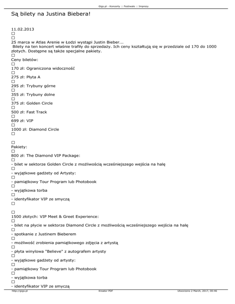 Gigs.pl - Koncerty :: Festiwale :: Imprezy Są bilety na Justina Biebera! 11.02.2013 25 marca w Atlas Arenie w Łodzi wystąpi Justin Bieber... Bilety na ten koncert właśnie trafiły do sprzedaży. Ich ceny kształtują się w przedziale od 170 do 1000 złotych. Dostępne są także specjalne pakiety. Ceny biletów: 170 zł: Ograniczona widoczność 275 zł: Płyta A 295 zł: Trybuny górne 355 zł: Trybuny dolne 375 zł: Golden Circle 500 zł: Fast Track 699 zł: VIP 1000 zł: Diamond Circle Pakiety: 800 zł: The Diamond VIP Package: - bilet w sektorze Golden Circle z możliwością wcześniejszego wejścia na halę - wyjątkowe gadżety od Artysty: - pamiątkowy Tour Program lub Photobook - wyjątkowa torba - identyfikator VIP ze smyczą 1500 złotych: VIP Meet & Greet Experience: - bilet na płycie w sektorze Diamond Circle z możliwością wcześniejszego wejścia na halę - spotkanie z Justinem Bieberem - możliwość zrobienia pamiątkowego zdjęcia z artystą - płyta winylowa "Believe" z autografem artysty - wyjątkowe gadżety od artysty: - pamiątkowy Tour Program lub Photobook - wyjątkowa torba - identyfikator VIP ze smyczą http://gigs.pl Kreator PDF Utworzono 2 March, 2017, 00:46 Gigs.pl - Koncerty :: Festiwale :: Imprezy Z mapką obiektu można zapoznać się tutaj: http://www.ticketpro.pl/public/96/fd/a7/1020214_629187_bieber_mapka_ceny.jpg?rand=186640295 (wp.pl) http://gigs.pl Kreator PDF Utworzono 2 March, 2017, 00:46 Gigs.pl - Koncerty :: Festiwale :: Imprezy http://gigs.pl Kreator PDF Utworzono 2 March, 2017, 00:46