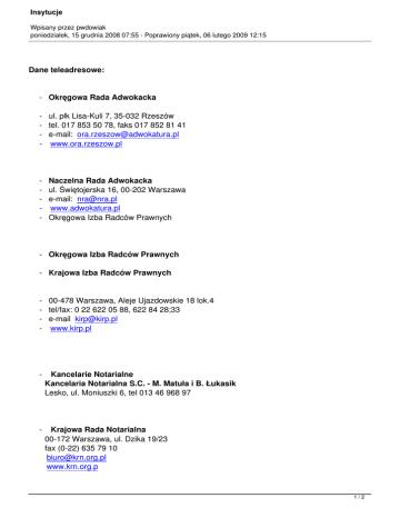Insytucje Wpisany przez pwdowiak poniedziałek, 15 grudnia 2008 07:55 - Poprawiony piątek, 06 lutego 2009 12:15 Dane teleadresowe: - Okręgowa Rada Adwokacka - ul. płk Lisa-Kuli 7, 35-032 Rzeszów - tel. 017 853 50 78, faks 017 852 81 41 - e-mail: [email protected] - www.ora.rzeszow.pl - Naczelna Rada Adwokacka ul. Świętojerska 16, 00-202 Warszawa e-mail: [email protected] www.adwokatura.pl Okręgowa Izba Radców Prawnych - Okręgowa Izba Radców Prawnych - Krajowa Izba Radców Prawnych - 00-478 Warszawa, Aleje Ujazdowskie 18 lok.4 - tel/fax: 0 22 622 05 88, 622 84 28;33 - e-mail [email protected] - www.kirp.pl - Kancelarie Notarialne Kancelaria Notarialna S.C. - M. Matuła i B. Łukasik Lesko, ul. Moniuszki 6, tel 013 46 968 97 - Krajowa Rada Notarialna 00-172 Warszawa, ul. Dzika 19/23 fax (0-22) 635 79 10 [email protected] www.krn.org.p 1/2 Insytucje Wpisany przez pwdowiak poniedziałek, 15 grudnia 2008 07:55 - Poprawiony piątek, 06 lutego 2009 12:15 - Kancelarie Komornicze Komornik przy Sądzie Rejonowym w Lesku Mariusz Najda Plac Konstytucji 3-go Maja 14, 38-600 Lesko tel.: 013 46 968 97 - Izba Notarialna Rzeszów,Rynek 18 +48 17 852-03-16 +48 17 853-49-40 www.rzeszow.notariat.pl - Prokuratury - Apelacyjna Rzeszów, al. Piłsudskiego 28 tel. 017 858 03 04 - Okręgowa Krosno, ul. Czajkowskiego 51 tel. 013 437 18 00 - Rejonowa Jasło, ul. Armii Krajowej 3 tel. 013 446 26 83 2/2