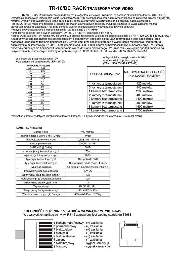 TR-16/DC RACK TRANSFORMATOR VIDEO TR-16/DC RACK przeznaczony jest do przesyłu sygnałów wizyjnych i zasilania za pomocą skrętki komputerowej (UTP, FTP). Urządzenie dopasowuje impedancję kabla koncentrycznego 75Ω do impedancji przewodu symetrycznego co zapewnia przesył wizji do 400 metrów. Sygnał video wykorzystuje jedną parę skrętki, pozostałe trzy pary wykorzystane są do przesyłu napięcia zasilania. TR-16/DC RACK może być zasilane z jednego lub dwóch zewnętrznych zasilaczy (A lub B). Każde z 16 wyjść zasilania można przyporządkować do zasilacza A lub B za pomocą zworek znajdujących się wewnątrz obudowy co pozwala: ● wszystkie wyjścia zasilane z jednego zasilacza 12V (aplikacja z TR-1M/70) ● urządzenie zasilane jest z dwóch zasilaczy 12V (np. 2 x 12V/4A) (aplikacja z TR-1M/70) ● część wyjść zasilana 12V, reszta 40V co umożliwia przesył zasilania na większe odległości (aplikacja z TRN-1/400, ZK-40 i 29V/2.5A/AC) Każde z wyjść zabezpieczone jest bezpiecznikiem polimerowym i posiada diodę LED informującą o jego zadziałaniu (brak świecenia oznacza zadziałanie bezpiecznika). Gdy nastąpi przeciążenie któregoś z wyjść rośnie rezystancja i temperatura bezpiecznika polimerowego (>1000C), oraz gaśnie dioda LED. Przez nagrzany bezpiecznik płynie niewielki prąd. Po ustaniu przyczyny przeciążenia bezpiecznik samoczynnie wraca do stanu pierwotnego. W urządzeniu występuje spadek napięcia na bezpiecznikach polimerowych zależny od poboru prądu: 160mV dla I=0,5A; 300mV dla I=0,7A; 340mV dla I=1A. odległości dla przesyłu zasilania 40V w zależności od poboru prądu (TRN-1/400, ZK-40 i TTS-80): odległości dla przesyłu zasilania 12V w zależności od poboru prądu (TR-1M/70): RODZAJ OBCIĄŻENIA MAKSYMALNA ODLEGŁOŚĆ DLA KAŻDEJ KAMERY 4 kamery z termostatem 3 kamery z termostatem 1 kamera bez termostatu 2 kamery z termostatem 2 kamery bez termostatu 1 kamera z termostatem 3 kamery bez termostatu 4 kamery bez termostatu 420 metrów 440 metrów 1200 metrów 480 metrów 1400 metrów 480 metrów 1500 metrów 1700 metrów Wszystkie parametry dotyczą skrętki komputerowej kategorii 5 z żyłami miedzianymi o średnicy 0,5mm (24 AWG). DANE TECHNICZNE: Zasięg video 400 metrów Zakres napięcia w e/w y 75Ω (CVBS) 1Vpp Tłumienie przelotow e video -0,5dB (dla f=5Mhz) Zakres pasma video 0-50Mhz (-3dB) CMRR (dB @ 5MHz) 50dB Impedancja w y koncentrycznych 75Ω Impedancja linii symetrycznych 100Ω Typ złącz koncentrycznych 16 x gniazdo BNC Typ złącz linii symetrycznych 16 x gniazdo RJ-45 (8-pin, 4 pary) Typ złącz zasilania Gniazdo 2.1/5.5mm / zaciski kablow e Maksymalne napięcie zasilania 40V DC Maksymalny prąd zasilania złącz A 10A Maksymalny prąd zasilania złącza B 10A Maksymalny prąd w yjcia (1-16) 1A Typ obudow y RACK 19'', 1RU Temp. pracy / w ilgotność w zgl. -40..+550C / <95% Wymiary (szer.xw ys.xgł.) / w aga 483x44x245mm / 1250g KOLEJNOŚĆ UŁOŻENIA PRZEWODÓW WEWNĄTRZ WTYKU RJ-45: We wszystkich aplikacjach wtyk RJ-45 zaprawiony jest według standardu T568B. biało/pomarańczowy - (+) zasilania pomarańczowy - (-) zasilania biało/zielony - (+) zasilania niebieski - (-) zasilania biało/niebieski - (+) zasilania zielony - (-) zasilania biało/brązowy - sygnał kamery (+) brązowy - sygnał kamery (-) 1 8 schemat elektryczny: bezpiecznik polimerowy ustawienie zworki danego wyjścia na zasilacz A dioda LED z rezystorem ustawienie zworki danego wyjścia na zasilacz B przykładowy schemat połączeniowy (12 kamer zasilanych 12V, 4kamery zasilane 40V): kamera TR-1M/70 sygnał z kamery zasilanie kamery +12V biało/pomarańczowy biało/zielony biało/niebieski brązowy pomarańczowy zielony niebieski biało/brązowy zasilacz 12V 16 x skrętka komputerowa kamery TR-1M/70 monitory A TR-1M/70 TR-1M/70 TR-1M/70 TR-1M/70 TR-1M/70 12V TR-1M/70 TR-16/DC RACK TR-1M/70 TR-1M/70 TR-1M/70 TR-1M/70 TR-1M/70 TRN-1/400 TRN-1/400 40V TRN-1/400 TRN-1/400 B ~230V 40V TRN-1/400 ZK-40 29V/2.5A/AC zasilanie kamery +12V skrętka 4-parowa sygnał z kamery kamera
