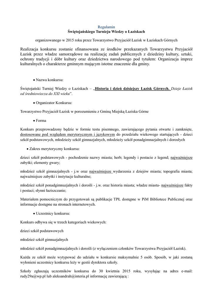 Regulamin Świętojańskiego Turnieju Wiedzy o Łaziskach organizowanego w 2015 roku przez Towarzystwo Przyjaciół Łazisk w Łaziskach Górnych Realizacja konkursu zostanie sfinansowana ze środków przekazanych Towarzystwu Przyjaciół Łazisk przez władze samorządowe na realizację zadań publicznych z dziedziny kultury, sztuki, ochrony tradycji i dóbr kultury oraz dziedzictwa narodowego pod tytułem: Organizacja imprez kulturalnych o charakterze gminnym mającym istotne znaczenie dla gminy. Nazwa konkursu: Świętojański Turniej Wiedzy o Łaziskach – „Historia i dzień dzisiejszy Łazisk Górnych. Dzieje Łazisk od średniowiecza do XXI wieku”. Organizator Konkursu: Towarzystwo Przyjaciół Łazisk w porozumieniu z Gminą Miejską Łaziska Górne Forma Konkurs przeprowadzony będzie w formie testu pisemnego, zawierającego pytania otwarte i zamknięte, dostosowane pod względem merytorycznym i językowym do przedziału wiekowego startujących - dzieci szkół podstawowych, młodzieży szkół gimnazjalnych, młodzieży szkół ponadgimnazjalnych i dorosłych Zakres merytoryczny konkursu: dzieci szkół podstawowych - pochodzenie nazwy miasta; herb; legendy i postacie z legend; najważniejsze zabytki; elementy gwary; młodzież szkół gimnazjalnych - j.w oraz najważniejsze wydarzenia z dziejów miasta; topografia miasta; najważniejsze zabytki i instytucje kulturalne; młodzież szkół ponadgimnazjalnych i dorośli - j.w. oraz historia miasta; władze miasta- najważniejsze fakty i postaci; słynni łaziszczanie; Materiałem pomocniczym do przygotowań są publikacje TPŁ dostępne w PiM Bibliotece Publicznej oraz informacje dostępne na stronach internetowych. Uczestnicy konkursu: Konkurs odbywa się w trzech kategoriach wiekowych: dzieci szkół podstawowych młodzież szkół gimnazjalnych młodzież szkół ponadgimnazjalnych i dorośli (z wyłączeniem członków Towarzystwa Przyjaciół Łazisk). Każda ze szkół może wytypować do udziału w konkursie maksymalnie 5 osób. Sposób, w jaki zostaną wyłonieni uczestnicy konkursu leży w gestii dyrektora szkoły. Szkoły zgłaszają uczestników konkursu do 30 kwietnia 2015 roku, wysyłając na adres e-mail: [email protected] lub [email protected] informację zawierającą : nazwę i adres szkoły imiona i nazwiska uczniów imiona i nazwiska nauczycieli – opiekunów uczniów Zgłoszenie ucznia do udziału w konkursie równoznaczne jest z wyrażeniem zgody przez jego rodziców / prawnych opiekunów na przetwarzanie danych osobowych ucznia przez Towarzystwo Przyjaciół Łazisk wyłącznie na potrzeby konkursu. Osoby pełnoletnie zgłaszają swój udział do 30 kwietnia 2015 roku, wysyłając na adres e-mail: [email protected] lub [email protected] informację zawierającą : imię i nazwisko uczestnika adres uczestnika Zgłoszenie się do udziału w konkursie równoznaczne jest z wyrażeniem zgody na przetwarzanie danych osobowych przez Towarzystwo Przyjaciół Łazisk wyłącznie na potrzeby konkursu. W przypadku zbyt małej ilości osób zgłoszonych do udziału w konkursie organizator zastrzega sobie prawo do odwołania konkursu w całości lub w jednej kategorii wiekowej. Komisja Konkursowa: Komisję Konkursową powołuje Zarząd Towarzystwa Przyjaciół Łazisk, podejmując stosowną uchwałę. Komisja składa się maksymalnie z 5 osób. Członkiem komisji może być osoba pełnoletnia, posiadająca wiedzę i doświadczenie zawodowe dające gwarancję prawidłowej i obiektywnej oceny prac konkursowych. Członkowie Komisji mogą być wybierani spośród: przedstawicieli Towarzystwa Przyjaciół Łazisk grona nauczycieli historii i / lub wiedzy o społeczeństwie przedstawicieli władz samorządowych Członkowie Komisji wybierają ze swojego grona przewodniczącego Komisji, który organizuje i kieruje jej działaniami. Zarząd Towarzystwa Przyjaciół Łazisk zapewnia obsługę formalną posiedzeń Komisji (zwoływanie posiedzeń, protokołowanie, itp.). Protokoły z posiedzeń Komisji podpisuje protokolant, członkowie oraz przewodniczący Komisji. Zadania Komisji: czuwanie nad prawidłowym przebiegiem turnieju ocena prac konkursowych pod względem formalnym i merytorycznym ogłoszenie wyników Uczestnicy konkursu mają prawo wglądu do swojej pracy. Końcowy protokół z prac Komisji jej przewodniczący przekazuje niezwłocznie Zarządowi Towarzystwa Przyjaciół Łazisk, który ogłasza wyniki Konkursu w lokalnej prasie oraz na stronie internetowej: www.laziska.pl. Terminarz konkursu: Zgłaszanie uczestników do 30 kwietnia 2015 Test konkursowy i ogłoszenie wyników – 7 maja 2015 Nagrody zapewnia organizator Wręczenie nagród i oficjalne ogłoszenie wyników nastąpi podczas Świętojańskich Dni Łazisk. .