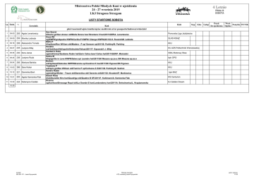 Mistrzostwa Polski Młodych Koni w ujeżdżeniu 24 - 27 września 2015 LKJ Stragona Strzegom 4 Letnie FINAŁ B SOBOTA LISTY STARTOWE SOBOTA Lp. Godz. No. Zawodnik 1 09:00 205 Agata Lenartowicz 2 09:09 259 Monika Lebioda 3 09:18 208 Alekasndra Tomala 4 09:27 235 Justyna Milej 5 09:36 230 Ilona Janas 6 09:45 236 Justyna Ruda 7 09:54 256 Martyna Bańska 8 10:03 266 Sara Kokar 9 10:12 221 Dominika Bień 10 10:21 203 Agata Kamionka-Flak 11 10:30 244 Katarzyna Cieślak Klub Koń płeć/rasa/maść\ojciec\matka/ojciec matki\rok ur\nr paszportu\hodowca\właściciel San Secret kl\han\c.gn\San Amour old\Bella Donna han/ Brentano II han\2011\GER\A. Lenartowicz Guus RZ og\KWPN\gn\Apache KWPN\Carilla-P KWPN/ Citango KWPN\2011\D.H. Rvesink\M. Lebioda Mafia P kl\sp\kara\Ron William old\Madera - P sp/ Saracen sp\2011\B. Parkitny\B. Parkitny Hendrix wal\trak\kara\Heliopolis\Helmainte/Velsas\2011\T. Gąsowski\ J. Milej Quidam's Duke og\mekl\siwy\\Quidams Rubin hol\Zarin Calica baw/ Calico hol\2011\GER\P. Michalski Salma M kl\sp\gn\So in Love KWPN\Salwa sp/ Leandro hol\2011\SK Moszna sp.zo.o.\SK Moszna sp.zo.o Burbon wal\sp\kaszt\Sokrates KWPN\Bramina sp/Caretino K hes\2011\SK Pępowo\SK Pępowo Trystiano P wal\sp\c.gn\Ron William old\Tamira P sp/Corleone Z Z\2011\B. Parkitny\R. Szafarz Sandro Rubin og\mekl\gn\Reiter - Traum old\Sorentina old/ Sorento old\2011\D. Nicodem\P. Markiewicz Desert Rose kl\old\kara\De Niro han\Quadriga old/Quattro B SF\2011\F. Kuhlmann\A. Kamionka-Flak Diverso og\han\kara\Dressage Royal old\La Grande E han/Londonderry han\2011\A. Świechowicz\L. Krzyżanowska Stęp Kłus Galop Przyd. Do ujeżdżenia Wraż. Pomyłka WYNIK Ogólne Pomorska Liga Jeździecka SLKS KSIĄŻ KKJ KU AZS Politechniki Warszawskiej SSKJ Bobrowy Staw bpk OPO KKJ KKJ bpk MAZ KS Centurion KJ Golden Dream 10:39 kontakt 692 991 471 - Jacek Ryczywolski Obsługa zawodów HTE marketing Jacek Ryczywolski godz. wydruku 17:59 6 Letnie Mistrzostwa Polski Młodych Koni w ujeżdżeniu 24 - 27 września 2015 LKJ Stragona Strzegom II próba SOBOTA LISTY STARTOWE SOBOTA Lp. Godz. No. Zawodnik 1 11:00 261 Natalia Kozaczka 2 11:09 228 Hanna Suchan 3 11:18 262 Olga Michalik 4 11:27 245 Katarzyna Łukasik 5 11:36 216 Anna Maria Gawłowska 6 11:45 219 Daria Kobiernik Klub Koń płeć/rasa/maść\ojciec\matka/ojciec matki\rok ur\nr paszportu\hodowca\właściciel Kalimero og\sp\siwy\Cantanis hol\Kolonia wlkp/ Le Bon KWPN\2009\R. Stasiuk\M. Zaręba Sternik wal\sp\c.gn\Contendor old\Stella sp/ El Bundy han\2009\SK Racot sp.zo.o.\K. Suchan Arriba Z og\Z\gn\Alex KWPN\Vivianne van Vlaswinkel KWPN/ Roman Nature reń\2009\BEL\K. Piwowarski E.Smaragd kl\KWPN\kaszt\Johnson KWPN\Smaragd.R KWPN/Wolfgang KWPN\2009\NED\A. Nowak Cardamon og\sp\gn\Pegasus HB KWPN\Chanel han/Copliment han\2009\A. Gawłowska\A.Gawłowska Gin Bean wal\sp\gn\Sancisco old \Grappa sp/ Alcatraz hol\2009\616009640045909\I. Chodorowska\I. Chodorowska Stęp Kłus Galop Przyd. Do ujeżdżenia Wraż. Pomyłka WYNIK Ogólne KJ Equus JKS Cwał KS Centurion LKJ Lublin SKJ Sopot ZKJ Przylep Lotnisko 11:54 kontakt 692 991 471 - Jacek Ryczywolski Obsługa zawodów HTE marketing Jacek Ryczywolski godz. wydruku 17:59 5 Letnie Mistrzostwa Polski Młodych Koni w ujeżdżeniu 24 - 27 września 2015 LKJ Stragona Strzegom II próba SOBOTA LISTY STARTOWE SOBOTA Lp. Godz. No. Zawodnik 1 12:15 247 Katarzyna Popiołek 2 12:24 250 Luiza Rutkowska 3 12:33 257 Martyna Bańska 4 12:42 264 Paula Mańczak 5 12:51 254 Marcin Kural 6 13:00 251 Magda Kowaluk 7 13:09 232 Inga Bretes 8 13:18 229 Ilona Janas 9 13:27 269 Sylwia Heinrich 10 13:36 246 Katarzyna Popiołek 11 13:45 249 Luiza Rutkowska Klub Koń płeć/rasa/maść\ojciec\matka/ojciec matki\rok ur\nr paszportu\hodowca\właściciel Galapagos wal\wlkp\gn\Quaterback DSP\Gracja wlkp/Agar wlkp (poch trak)\2010\SK Dębno sj\SK Dębno sj Prince Girl kl\sp\sk.gn\Turbud Alino hol\Princess Lady han/ Prince Thatch xx\2010\R. Borensztadt\M. Adamuszewski Tequila-P kl\sp\kara\Ron Willam old\Tajka-P sp/Corleone Z \2010\B. Parkitny\M. Bańska Fazz-Tetti og\KWPN\kara\Jazz KWPN\Verrno-Tetti KWPN/Ferro KWPN\2010\NED\P. Mańczak\ Sindia kl\sp\gn\Hetman sp\Sinez sp/Lansjer L old\2010\PPHU Algas sj SK Udorz\PPHU Algas sj SK Udorz All You Need wal\sp\kaszt\Love Affair han\Ascona thur/Weltgeist han\2010\P. Marczak\R. Kowaluk First Row og\han\kaszt\Furst Nymphenburg han\Hitchi han/ Hitchcock han\2010\BEL\Ł. Wilczewski Lord Django og\han\gn\Stalypso han\Lona han/ Londonderry han\2010\H. Heeren\I. Janas Senior Rafael-P wal\sp\kara\Ron William old\Seniorita-P sp/ Corleone Z Z\2010\B. Parkitny\B. Parkitny Butterfly kl\DSP\gn\Bellissimo Mreń\Rainbow han/Romancero H han\2010\Z. Szumlakowski\A. Sałacki Markiz wal\sp\sk.gn\Love Affair han\Mejsi V sp / Welt Gang han\2010\M. Adamuszewski\M. Adamuszewski Stęp Kłus Galop Przyd. Do ujeżdżenia Wraż. Pomyłka WYNIK Ogólne LKJ Lewada KJ Aromer KKJ CSJ Coval Biały Bór JLKJ w Udorzu bpk MAZ KJ Aromer SSKJ Bobrowy Staw LKJ Lewada LKJ Lewada KJ Aromer 13:54 kontakt 692 991 471 - Jacek Ryczywolski Obsługa zawodów HTE marketing Jacek Ryczywolski godz. wydruku 17:59 7 -9 Letnie Mistrzostwa Polski Młodych Koni w ujeżdżeniu 24 - 27 września 2015 LKJ Stragona Strzegom II półfinał SOBOTA LISTY STARTOWE SOBOTA Lp. Godz. No. Zawodnik 1 14:15 255 Martyna Bańska 2 14:24 215 Anna Kierznowska 3 14:33 231 Inga Bretes 4 14:42 267 Sylwia Heinrich 5 14:51 237 Kamil Puliński Klub Koń płeć/rasa/maść\ojciec\matka/ojciec matki\rok ur\nr paszportu\hodowca\właściciel Garacziko Plus-S wal\sp\Atylla \Giornata / Garantie\2006 Donnadoorn kl\KWPN\kara\Painted Black KWPN\Sesdoorn KWPN/ Jazz KWPN\2008\NED\A. Kierznowska Cabernet og\sp\siwy\Chardonnay L\Carrie 003 / Calando I\2006 Dingi kl\wlkp\kara\Barbur\Dirke / Biskwit\2006 Korra G kl\sp\c.gn\Empire han\Korsyka sp/ Nidar sp\2007\P. Gąsiński\P. Gąsiński WYNIK Karkonoski KJ SKJ KIETLÓW Aromer LKJ Lewada Lubelski Klub Jeździecki 15:00 kontakt 692 991 471 - Jacek Ryczywolski Obsługa 
