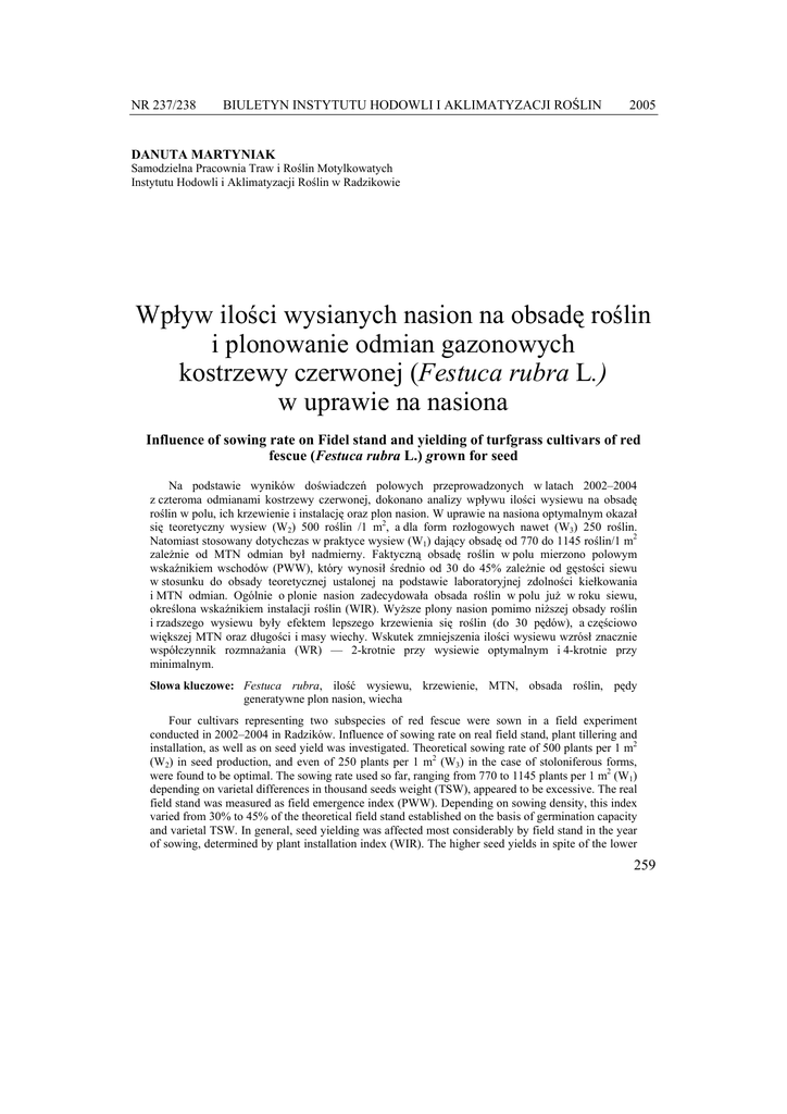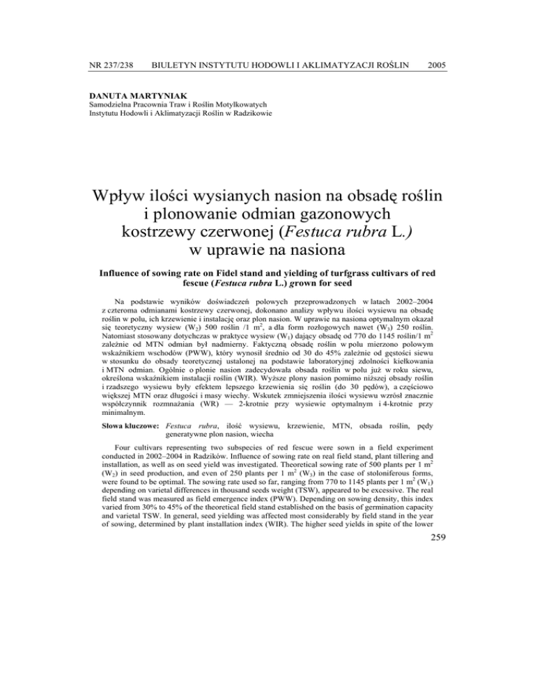 NR 237/238 BIULETYN INSTYTUTU HODOWLI I AKLIMATYZACJI ROŚLIN 2005 DANUTA MARTYNIAK Samodzielna Pracownia Traw i Roślin Motylkowatych Instytutu Hodowli i Aklimatyzacji Roślin w Radzikowie Wpływ ilości wysianych nasion na obsadę roślin i plonowanie odmian gazonowych kostrzewy czerwonej (Festuca rubra L.) w uprawie na nasiona Influence of sowing rate on Fidel stand and yielding of turfgrass cultivars of red fescue (Festuca rubra L.) grown for seed Na podstawie wyników doświadczeń polowych przeprowadzonych w latach 2002–2004 z czteroma odmianami kostrzewy czerwonej, dokonano analizy wpływu ilości wysiewu na obsadę roślin w polu, ich krzewienie i instalację oraz plon nasion. W uprawie na nasiona optymalnym okazał się teoretyczny wysiew (W2) 500 roślin /1 m2, a dla form rozłogowych nawet (W3) 250 roślin. Natomiast stosowany dotychczas w praktyce wysiew (W1) dający obsadę od 770 do 1145 roślin/1 m2 zależnie od MTN odmian był nadmierny. Faktyczną obsadę roślin w polu mierzono polowym wskaźnikiem wschodów (PWW), który wynosił średnio od 30 do 45% zależnie od gęstości siewu w stosunku do obsady teoretycznej ustalonej na podstawie laboratoryjnej zdolności kiełkowania i MTN odmian. Ogólnie o plonie nasion zadecydowała obsada roślin w polu już w roku siewu, określona wskaźnikiem instalacji roślin (WIR). Wyższe plony nasion pomimo niższej obsady roślin i rzadszego wysiewu były efektem lepszego krzewienia się roślin (do 30 pędów), a częściowo większej MTN oraz długości i masy wiechy. Wskutek zmniejszenia ilości wysiewu wzrósł znacznie współczynnik rozmnażania (WR) — 2-krotnie przy wysiewie optymalnym i 4-krotnie przy minimalnym. Słowa kluczowe: Festuca rubra, ilość wysiewu, krzewienie, MTN, obsada roślin, pędy generatywne plon nasion, wiecha Four cultivars representing two subspecies of red fescue were sown in a field experiment conducted in 2002–2004 in Radzików. Influence of sowing rate on real field stand, plant tillering and installation, as well as on seed yield was investigated. Theoretical sowing rate of 500 plants per 1 m2 (W2) in seed production, and even of 250 plants per 1 m2 (W3) in the case of stoloniferous forms, were found to be optimal. The sowing rate used so far, ranging from 770 to 1145 plants per 1 m2 (W1) depending on varietal differences in thousand seeds weight (TSW), appeared to be excessive. The real field stand was measured as field emergence index (PWW). Depending on sowing density, this index varied from 30% to 45% of the theoretical field stand established on the basis of germination capacity and varietal TSW. In general, seed yielding was affected most considerably by field stand in the year of sowing, determined by plant installation index (WIR). The higher seed yields in spite of the lower 259 Danuta Martyniak sowing rate and lower plant density were the effects of more intensive tillering (up to 30 shoots per plant) as well as of the increased TSW, ear length and ear weight. Key words: Festuca rubra, field stand, generative shoots number, panicle, seed yield, sowing rate, tillering, thousand seeds weight WSTĘP Produkcja nasienna kostrzewy czerwonej staje się perspektywicznym kierunkiem dla poszczególnych gospodarstw nasiennych i w skali kraju, bowiem istnieje duże zapotrzebowanie na nasiona tego gatunku. Jego reprodukcja nasienna już obecnie jest największa spośród traw. Natomiast poziom plonowania jest ciągle niezadawalający, prawie 2-krotnie niższy (ok. 6,8 dt z ha) w stosunku do czołowych krajów zachodnich, a także do średniej dla Unii Europejskiej (9,6 dt z ha). Stąd poznanie czynników plonotwórczych jest celowe i pilne. Wzrost plonu wiąże się przede wszystkim z poziomem technologii uprawy. Istotnym elementem tej technologii dla większości roślin uprawnych jest obsada roślin, ściśle związana z ilością wysiewu, uwzględniająca masę tysiąca nasion. Jak wykazały wstępne badania nad Lolium perenne L. obsada roślin może być także jednym z czynników decydującym o plonie nasion traw, a stosowane w praktyce ilości wysiewu są przeważnie za duże ((Martyniak i Martyniak, 2002, Hampton i Fairey, 1997). Według Meijera (1984) badania dotyczące ilości wysiewanych nasion przy zakładaniu plantacji kostrzewy czerwonej dowodzą, że zwiększone normy wysiewu powodują spadek plonu nasion. W Kanadzie zalecenia zmierzają już w kierunku obniżania norm wysiewu nasion traw (Smith, 1996; Brown, Lilli, 1990; Hare, 1990). Dotychczas w badaniach koncentrowano się głównie na współzależności plonu z liczbą pędów generatywnych (Falkowski i in., 1996; Kitczak i Czyż, 2001). Jest to uzasadnione, lecz pod względem poznawczym stanowi wtórny czynnik plonotwórczy, bowiem pierwotną jest obsada i krzewienie roślin w polu, które decydują o liczbie pędów generatywnych. Celem pracy była próba rozpoznania granicznej i optymalnej obsady roślin oraz ilości wysiewu nasion opartej na MTN w uprawie Festuca rubra L. na nasiona. MATERIAŁ I METODY Materiał do badań stanowiły cztery odmiany gazonowe kostrzewy czerwonej (dwie krajowe: Nimba, Areta i dwie zagraniczne: Barcrown, Salsa) o różnej masie tysiąca nasion (tab. 1). Prace eksperymentalne oparto na doświadczeniu polowym w Radzikowie, założonym w 2002 roku i prowadzonym przez trzy lata według metodyki badań COBORU i własnej IHAR (Domański i in., 1979; Prończuk, 1993). Nasiona wysiewano ręcznie, w rozstawie 20 cm, na poletkach 2 m2, rozmieszczonych w układzie losowanych podbloków, w 3 powtórzeniach. Zastosowano trzy normy wysiewu odpowiadające, następującej teoretycznej obsadzie roślin na 1 m2 (TLR) przy: W1 — zbliżonej do stosowanej w praktyce od 771 do 1145, zależnie od MTN odmiany, W2 — przyjętej jako optymalna 500 roślin i W3 minimalna 250 roślin (tab. 1). Przy wysiewie w polu ilość nasion została skorygowana o laboratoryjną zdolność kiełkowania. 260 Danuta Martyniak W 20 