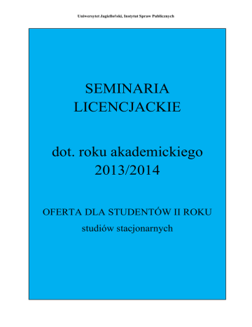 Uniwersytet Jagielloński, Instytut Spraw Publicznych SEMINARIA LICENCJACKIE dot. roku akademickiego 2013/2014 OFERTA DLA STUDENTÓW II ROKU studiów stacjonarnych Uniwersytet Jagielloński, Instytut Spraw Publicznych SPIS TREŚCI: 1. Krótki opis zasad wyboru seminarium licencjackiego ........................................... 3 2. Rejestracja bezpośrednia do grup seminaryjnych .............................................. 4 3. Termin rejestracji ............................................................................................... 5 4. Propozycje seminariów licencjackich ............................................................ 6 Uniwersytet Jagielloński, Instytut Spraw Publicznych 1. Krótki opis zasad wyboru seminarium licencjackiego Studenci studiów stacjonarnych wybierają seminarium tylko i wyłącznie z oferty seminariów dla studentów stacjonarnych. Studenci studiów stacjonarnych nie mogą wybrać seminarium wskazanego dla studentów niestacjonarnych. Studenci studiów niestacjonarnych wybierają seminarium tylko i wyłącznie z oferty seminariów dla studentów niestacjonarnych. Studenci studiów niestacjonarnych nie mogą wybrać seminarium wskazanego dla studentów stacjonarnych. Po dokonaniu rejestracji w USOS i uzyskaniu potwierdzenia zapisu na dane seminarium NIE MA MOŻLIWOŚCI ZMIANY DECYZJI O WYBORZE SEMINARIUM LICENCJACKIEGO. Seminarium licencjackie jest uruchomiane, jeżeli zgłosi swój udział w nim co najmniej 10 osób. Na dane seminarium może zapisać się maksymalnie 15 osób. Dana osoba może wpisać się tylko na JEDNO SEMINARIUM. Osoby, które nie dokonają wyboru seminarium w wyznaczonym przez ISP UJ terminie – zostaną wpisane decyzją Dyrekcji ISP UJ na wolne miejsca, bez możliwości zmiany. W oferowanych seminariach mogą uczestniczyć zarówno studenci kierunku: zarządzanie, specjalność: zarządzanie w sektorze publicznym i pozarządowym, jak i kierunku: polityka społeczna, specjalność: zarządzanie organizacjami publicznymi i obywatelskimi. Uniwersytet Jagielloński, Instytut Spraw Publicznych 2. Rejestracja bezpośrednia do grup seminaryjnych Należy : a. zalogować się do systemu USOSweb b. kliknąć na ikonę z napisem „POMOC”, następnie kliknąć na „REJESTRACJE NA ZAJĘCIA” c. UWAŻNIE PRZECZYTAĆ INSTRUKCJĘ zwracając szczególną uwagę na następujące punkty: gdzie szukać rejestracji gdzie szukać przedmiotów, na które można się zarejestrować jak sprawdzić, czy mogę zarejestrować się na przedmiot PRZYPOMINAMY, ŻE REJESTRACJA NA SEMINARIA ODBYWAĆ SIĘ BĘDZIE POPRZEZ REJESTRACJĘ BEZPOŚREDNIĄ Uniwersytet Jagielloński, Instytut Spraw Publicznych 3. Termin rejestracji Początek zapisów: 15 maja 2013 r. (środa) od godziny 21:00 Koniec zapisów: 17 maja 2013 r. (piątek) do godziny 23:00 Uniwersytet Jagielloński, Instytut Spraw Publicznych 4. Propozycje seminariów licencjackich imię i nazwisko prowadzącego seminarium dr Kazimierz Bujak temat seminarium Polityka rynku pracy i przezwyciężania bezrobocia liczba studentów przyjmowanych na seminarium Minimalna liczba 10, maksymalna liczba: 15 Seminarium poświęcone będzie problematyce przezwyciężania bezrobocia. Preferowane będą polityki rynku pracy i prace poświęcone różnym wymiarom działania władz samorządowych na rzecz przezwyciężania bezrobocia, funkcjonowania publicznych służb zatrudnienia (urzędów pracy), różnych form zakres tematyczny seminarium pomocy osobom bezrobotnym (także przez jednostki pomocy społecznej), sytuacji osób bezrobotnych i ich rodzin, ich aktywności na rzecz poszukiwania pracy itp. a także zagadnieniom polityki zatrudnienia pracodawców, szans różnych grup zawodowych i społecznych na rynku pracy (np. kobiet, osób niepełnosprawnych, młodzieży), sytuacji absolwentów itp. • Programy aktywizacji zawodowej absolwentów a ich sytuacja na małopolskim rynku pracy. • Jobrotation – rotacja na rynku pracy jako nowy instrument walki z bezrobociem. przykładowe tytuły prac, w tym zrealizowane w latach ubiegłych • Sytuacja osób niepełnosprawnych na rynku pracy. • Szkolenia jako instrument przeciwdziałania bezrobociu, na przykładzie działań urzędu pracy w X. • Formy aktywności w poszukiwaniu pracy bezrobotnych powyżej 50 roku życia. • Wpływ bezrobocia na sytuację materialną rodziny. • Pozycja zawodowa kobiet na rynku pracy. • Sytuacja na rynku pracy a emigracja zarobkowa. • Staż zawodowy i jego skuteczność jako narzędzia pomocy bezrobotnym absolwentom. uwagi dot. terminu seminarium studia stacjonarne Uniwersytet Jagielloński, Instytut Spraw Publicznych imię i nazwisko prowadzącego seminarium dr Jakub Kołodziejczyk temat seminarium Zarządzanie zespołami w instytucjach publicznych i obywatelskich liczba studentów przyjmowanych na seminarium Minimalna liczba: 10, maksymalna: 15 Osiąganie stawianych przed instytucją celów w dużej mierze zależy od wykorzystania potencjału znajdującego się w ludziach, którzy ją tworzą. Jednym ze współcześnie podkreślanych sposobów osiągania tego celu jest praca zespołowa. Zarządzanie zespołami jest procesem złożonym wymagającym od kierowników wielu umiejętności i zespołowych zakres tematyczny seminarium wiedzy o decyzji, procesach grupowych, motywacji, rolach podejmowaniu w zespole itd. Celem seminarium jest lepsze zrozumienie prawidłowości zachodzących w zespołach funkcjonujących w instytucjach publicznych i obywatelskich. Prace realizowane w ramach seminarium będą miały charakter empiryczny. Seminarzyści będą mieli możliwość rozwijania własnych zainteresowań oraz wyboru i formułowania tematu własnej pracy w ramach realizowanego zespołowego (zespół seminarzystów) projektu badawczego. przykładowe tytuły prac, w tym zrealizowane w latach ubiegłych uwagi dot. terminu seminarium • Rodzaje zespołów pracowniczych w zarządzaniu administracją publiczną • Metody rozwiązy