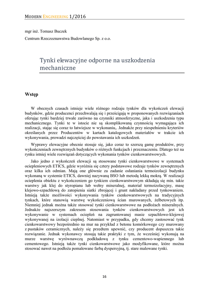 MODERN ENGINEERING 1/2016 mgr inż. Tomasz Buczek Centrum Rzeczoznawstwa Budowlanego Sp. z o.o. Tynki elewacyjne odporne na uszkodzenia mechaniczne Wstęp W obecnych czasach istnieje wiele różnego rodzaju tynków dla wykończeń elewacji budynków, gdzie producenci przechwalają się i prześcigają w proponowanych rozwiązaniach oferując tynki bardziej trwałe zarówno na czynniki atmosferyczne, jaka i uszkodzenia typu mechanicznego. Tynki te w istocie nie są skomplikowaną czynnością wymagająca ich realizacji, stając się coraz to łatwiejsze w wykonaniu,. Jednakże przy niespełnieniu kryteriów określanych przez Producentów w kartach katalogowych materiałów w trakcie ich wykonywania, prowadzi najczęściej do powstawania ich uszkodzeń. Wyprawy elewacyjne obecnie stosuje się, jako coraz to szerszą gamę produktów, przy wykończeniach zewnętrznych budynków o różnych funkcjach i przeznaczeniu. Dlatego też na rynku istniej wiele rozwiązań dotyczących wykonania tynków cienkowarstwowych. Jako jedno z wykończeń elewacji są stosowane tynki cienkowarstwowe w systemach ociepleniowych ETICS, gdzie wyróżnia się cztery podstawowe rodzaje tynków zewnętrznych oraz kilka ich odmian. Mają one głównie za zadanie osłaniania termoizolacji budynku wykonaną w systemie ETICS, dawniej nazywaną BSO lub metodą lekką mokrą. W realizacji ocieplenia obiektu z wykończeniem go tynkiem cienkowarstwowym składają się min. takie warstwy jak klej do styropianu lub wełny mineralnej, materiał termoizolacyjny, masę klejowo-szpachlową do zatopienia siatki zbrojącej i grunt nakładany przed tynkowaniem. Istnieją także możliwości wykonywania tynków cienkowarstwowych na tradycyjnych tynkach, które stanowią warstwę wykończeniową ścian murowanych, żelbetowych itp. Niemniej jednak można także stosować tynki cienkowarstwowe na podłożach mineralnych. Jednakże najszerszym zakresem stosowania tynków cienkowarstwowych jest ich wykonywanie w systemach ociepleń na zagruntowanej masie szpachlowo-klejowej wykonywanej na izolacji cieplnej. Natomiast w przypadku, gdy chcemy zastosować tynk cienkowarstwowy bezpośrednio na mur na przykład z betonu komórkowego czy murowany z pustaków ceramicznych, należy się przedtem upewnić, czy producent dopuszcza takie rozwiązanie. Jednak wykonawcy stosują takie praktyki z tym, że wcześniej wykonują na murze warstwę wyrównawczą podkładową z tynku cementowo-wapiennego lub cementowego. Istnieją także tynki cienkowarstwowe jako modyfikowane, które można stosować nawet na podłoża pomalowane farbą dyspersyjną, tj. stare malowane tynki. 16 MODERN ENGINEERING 1/2016 Opis ogólny tynków cienkowarstwowych Jak już opisywano na wstępnie istnieje wiele rodzajów tynków elewacyjnych, stosowanych w obecnych czasach dla wykończenia elewacji budynków. Stosowane, jako zewnętrzne i wewnętrzne tynki cienkowarstwowe wykonywane są zazwyczaj o grubości od 1÷5mm. Rozróżniamy takie tynki jak: a) mineralne b) akrylowe c) silikatowe d) silikonowe e) silikatowo-silikonowe f) krzemianowo-silikonowy g) oraz mozaikowe Poniżej scharakteryzowano poszczególne tynki cienkowarstwowe, które jak wyszczególniono powyżej zaliczane są do czterech głównych grup tj. mineralnych, akrylowych, silikonowych i silikatowych. A. Tynki mineralne Jest to pierwszy tynk jaki zaczęto produkować oraz jedyny, którego elementem wiążącym jest cement (szary lub biały). Wykorzystywane spoiwo do ich produkcji ma wpływ zarówno na cechy zaprawy takie jak początek i koniec czasu wiązania, konsystencja i urabialność, jak również dla tynku już wykonanego posiada parametry takie jak nasiąkliwość, skurcz i paroprzepuszczalność. Głównym składnikiem stanowiącym spoiwo tynków cienkowarstwowych dla wypraw mineralnych jest: gips, wapno hydratyzowane (suchogaszone), wapno hydrauliczne, szkło wodne potasowe, cementy portlandzkie wysokich marek bez dodatków. Zależnie od proporcji przyjętych składników może dochodzić do powstawania niejednorodności kolorystycznej tynku. Podstawowe składniki spoiwa tynków mineralnych takie jak gips i wapno po połączeniu z wodą twardnieją i wiążą jedynie na powietrzu. Dodatkowo występują tynki mineralne, gdzie podstawowym elementem wiążącym jest cement, wzbogacane dodatkami np. polimerami lub włóknami. Tynk mineralny charakteryzuje się dosyć wysoką paroprzepuszczalnością (najwyższą wśród wszystkich rodzajów tynków) oraz silnie zasadowym odczynem pH, który chroni przed rozwojem pleśni i grzybów. Kolorystycznie występuje w kolorze szarym lub białym w zależności od użytego cementu, przez co wykonana wyprawa tynkarska wymaga pokrycia odpowiednią farbą. Obecnie na rynku występują produkty barwione w masie, jednak wybór kolorów jest ograniczony. Dodatkowo uzyskiwane odcienie, jako gotowe tynki do użycia mogą się różnić w poszczególnych partiach materiałów i po ich naniesieniu na elewację całość wymaga malowania celem wyrównania i ujednolicenia kolorystyki. Dodatkowo tynki te są także malowane ze względu na posiane prze nie pory, co dzięki malowaniu pomaga ich zamknięciu. Powłoki wykonane z tego materiału wykazują też dużą trwałość, która wzrasta wraz z upływem czasu. Dla malowania tego typu tynków najczęściej używa się farb silikatowych i silikonowych, Producenci zgodni poświadczają, że farba silikatowa (tańsza od silikonowej) dodatkowo wzmocni strukturę 17 MODERN ENGINEERING 1/2016 tynku, bo chemiczny proces jej wiązania (krzemianowanie) sprawia, że z biegiem czasu nabiera ona coraz większej trwałości. Tynki mineralne, ponieważ powstają na bazie cementu i dodatków zwiększających przyczepność, są odporne na znaczne wahania temperatur i działanie promieni UV. Mineralne tynki cienkowarstwowe są mało odporne na uszkodzenia mechaniczne. B. Tynki akrylowe Obecnie najczęściej stosowanym na rynku tynkiem cienkowars