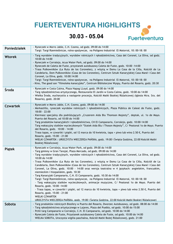 FUERTEVENTURA HIGHLIGHTS 30.03 - 05.04 Poniedziałek - Ryneczek w Morro Jable, C.H. Cosmo, od godz. 09:00 do 14:00 Targi: Targi Rzemieślnicze, rolno-spożywcze, na Polígono Industrial El Matorral, 10: 00-18: 00 Wtorek - Targ wyrobów tradycyjnych, wyrobów rolniczych i rękodzielnictwa, Casa del Coronel, La Oliva, od godz. 10:00 do 14:00 - Ryneczek w Corralejo, Acua Water Park, od godz. 09:00 do 14:00 - Ryneczek de Caleta de Fuste, przystanek autobusowy Caleta de Fuste, godz. 10:00 -14:00 - Trasa Pułkowników (La Ruta de los Coroneles), z wizytą w Domu La Casa de la Cilla, Kościół de La Candelaria, Dom Pułkowników (Casa de los Coroneles), Centrum Sztuki Kanaryjskiej Casa Mané i Casa del Coronel, La Oliva, godz. 10:00:14:00 Targi: Targi Rzemieślnicze, rolno-spożywcze, na Polígono Industrial El Matorral, 10: 00-18: 00 - Kino, The good son “filmoteka kanaryjska”, Centrum Biblioteczne Wyspy, Puerto del Rosario, godz. 20:30 Środa - Ryneczek w Costa Calma, Plaza Hapag LLoyd, godz. 09:00 do 14:00 - Targ rękodzielnictwa artystycznego, Restaurante El Jardín w Costa Calma, godz. 10:00 do 14:00 - Wielka Środa, eucharystia a następnie procesja, Kościół Matki Boskiej Różańcowej (Iglesia Ntra. Sra. del Rosario), godz. 20:00 Czwartek - Ryneczek w Morro Jable, C.H. Cosmo, godz. 09:00 do 14:00 - Merkastillo, ryneczek wyrobów rolniczych i rękodzielniczych, Plaza Pública de Caleat de Fuste, godz. 18:00 - 22:00 - Kiermasz specjalny dla podróżujących „Cruzerem Aida Blu Thomson Majesty”, deptak, ul. 1o de Mayo. Puerto del Rosario, od 10:00 do 14:00 Targ produktów kanaryjskich i rękodzielnictwa, CH El Campanario, Corralejo, godz. 10:00-14:00 Targ wakacyjny statków wycieczkowych “Statek Aida Blu i Thoson Majesty”, C/ Peatonal 1o de Mayo. Puerto del Rosario, godz. 10:00 - 14:00 Trasa tapas, w czwartki i piątki, od 12 marca do 10 kwietnia, tapa + piwo lub wino 2.50 €, Puerto del Rosario, godz. 15:00 - 21:00 WIELKI CZWARTEK : UROCZYSTA WIECZERZA PAŃSKA, godz. 19:00 i Święta Godzina, 22:00 Kościół Matki Boskiej Różańcowej Piątek - Ryneczek w Corralejo, Acua Water Park, od godz. 09:00 do 14:00 -- Targ gminny w Gran Tarajal, Plaza Mercado, od godz. 09:00 do 14:00 - Targ wyrobów tradycyjnych, wyrobów rolniczych i rękodzielnictwa, Casa del Coronel, La Oliva, od godz. 10:00 do 14:00 - Trasa Pułkowników (La Ruta de los Coroneles), z wizytą w Domu La Casa de la Cilla, Kościół de La Candelaria, Dom Pułkowników (Casa de los Coroneles), Centrum Sztuki Kanaryjskiej Casa Mané i Casa del Coronel, La Oliva, godz. 10:00 - 14:00 oraz wersja teatralna w 4 językach: angielskim, francuskim, niemieckim i hiszpańskim, godz. 10:30 - Targ Kanaryjski Campanario, C.H. El Campanario, godz. 10:30 do 14:00 Targi: Targi Rzemieślnicze, rolno-spożywcze, na Polígono Industrial El Matorral, 10: 00-18: 00 - Targ wakacyjny statków wycieczkowych, animacje muzyczne, C/ Peatonal 1o de Mayo. Puerto del Rosario, godz. 10:00 -14:00 - Trasa tapas, w czwartki i piątki, od 12 marca do 10 kwietnia, tapa + piwo lub wino 2.50 €, Puerto del Rosario, godz. 15:00 - 21:00 WIELKI CZWARTEK UROCZYSTA WIECZERZA PAŃSKA, godz. 19:00 i Święta Godzina, 22:00 Kościół Matki Boskiej Różańcowej Sobota - Targ produktów rolniczych Biosfery w Puerto del Rosario, Dworzec Autobusowy, od godz. 08:00 do 14:00 Targ rękodzielnictwa artystycznego w Lajares, Plaza del Pueblo, od godz. 10:00 do 15:00 Pchli targ Campanario w Corralejo, C.H. El Campanario, od godz. 10:00 do 14:00 Ryneczek Caleta de Fuste, Przystanek autobusowy Caleta de Fuste, od godz. 10:00 do 14:00 WIELKA SOBOTA, Uroczysta wigilia paschalna, Kościół Matki Bożej Różańcowej, godz. 21:00 Niedziela - Targ Rękodzielnictwa Artystycznego Wysp Kanaryjskich pod Dzwonnicą (CH El Campanario, Corralejo, godz. 10 - 14.) - Targ Rękodzielnictwa Artystycznego i Rolniczy Ctra. Gral. de Jandía km 17 de 09:00 a 14:00 - Targ Rękodzielnictwa Artystycznego Restauracja El Jardín w Costa Calma, godz. 10 - 14. - Targ rzeczy używanych w Puerto del Rosario (Plaza de la Paz, godz. 10 - 14.) Rezurekcja Pańska, eucharystia, Kościół Matki Bożej Różańcowej, godz. 20:00