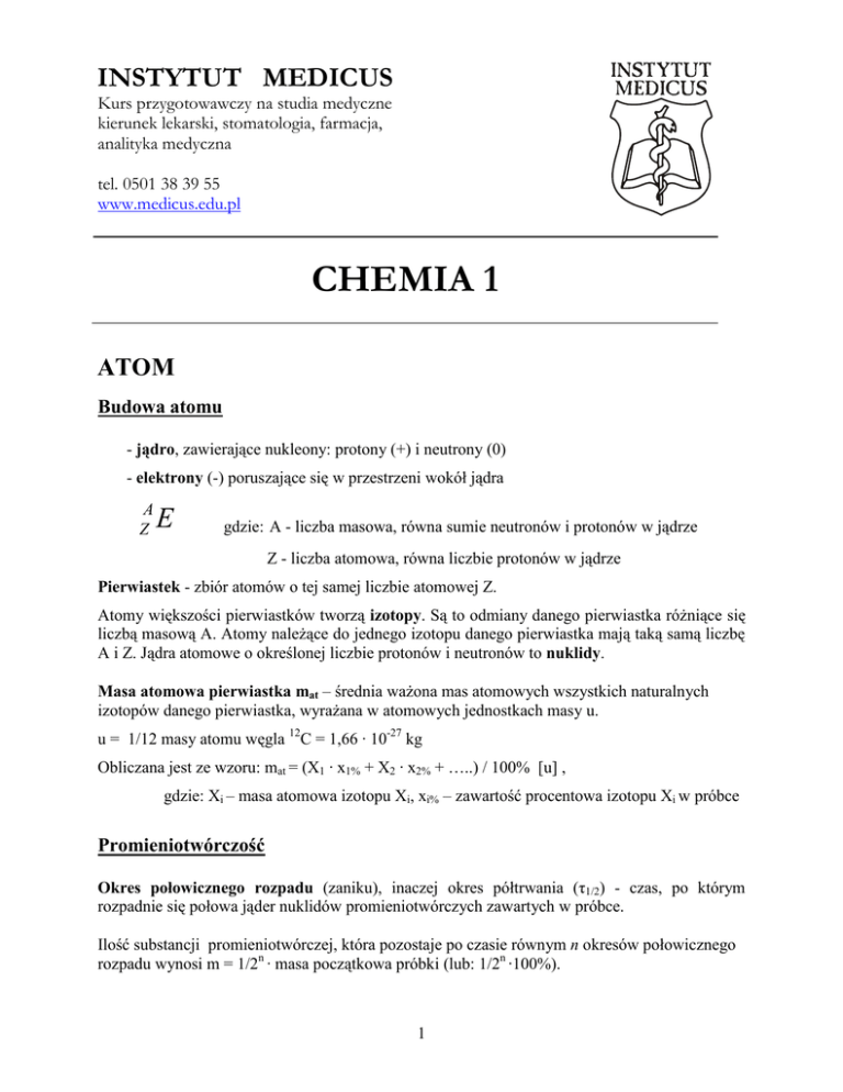 INSTYTUT MEDICUS Kurs przygotowawczy na studia medyczne kierunek lekarski, stomatologia, farmacja, analityka medyczna tel. 0501 38 39 55 www.medicus.edu.pl CHEMIA 1 ATOM Budowa atomu - jądro, zawierające nukleony: protony (+) i neutrony (0) - elektrony (-) poruszające się w przestrzeni wokół jądra A Z E gdzie: A - liczba masowa, równa sumie neutronów i protonów w jądrze Z - liczba atomowa, równa liczbie protonów w jądrze Pierwiastek - zbiór atomów o tej samej liczbie atomowej Z. Atomy większości pierwiastków tworzą izotopy. Są to odmiany danego pierwiastka różniące się liczbą masową A. Atomy należące do jednego izotopu danego pierwiastka mają taką samą liczbę A i Z. Jądra atomowe o określonej liczbie protonów i neutronów to nuklidy. Masa atomowa pierwiastka mat – średnia ważona mas atomowych wszystkich naturalnych izotopów danego pierwiastka, wyrażana w atomowych jednostkach masy u. u = 1/12 masy atomu węgla 12C = 1,66 · 10-27 kg Obliczana jest ze wzoru: mat = (X1 · x1% + X2 · x2% + …..) / 100% [u] , gdzie: Xi – masa atomowa izotopu Xi, xi% – zawartość procentowa izotopu Xi w próbce Promieniotwórczość Okres połowicznego rozpadu (zaniku), inaczej okres półtrwania (τ1/2) - czas, po którym rozpadnie się połowa jąder nuklidów promieniotwórczych zawartych w próbce. Ilość substancji promieniotwórczej, która pozostaje po czasie równym n okresów połowicznego rozpadu wynosi m = 1/2n · masa początkowa próbki (lub: 1/2n ·100%). 1 Przemiana promieniotwórcza Cząstka wyemitowana Przemiana w jądrze Skutki przemiany jądro helu 42 He (lub ) - A–4 Z-2 - elektron e- n e- + p+ + ’ Z+1 + pozyton e+ p+ e+ + n + Z-1 wychwyt K p+ + e- - Z-1 n „przechwycenie” przez jądro atomowe elektronu z powłoki najbliższej jądra ’ - antyneutrino, - neutrino (cząstki o znikomej masie spoczynkowej, bez ładunku) Elektrony w atomie Określonemu stanowi energetycznemu elektronu w atomie odpowiada zespół następujących liczb kwantowych, które kwantują (porcjują) wielkości fizyczne związane z energią elektronu: Liczba kwantowa Liczba możliwych wartości n główna liczba kwantowa l poboczna (orbitalna) liczba kwantowa ml magnetyczna liczba kwantowa s spinowa liczba kwantowa ms magnetyczna spinowa liczba kwantowa n 2l + 1 1 2 Możliwe wartości Wielkość kwantowana 1,2,3,... energia elektronu 0,1, 2, ..., n-1 moment pędu (oraz energia w atomie wieloelektronowym) decyduje o typie orbitalu i kształcie jego konturu rzut momentu pędu na wyróżniony kierunek decyduje o ułożeniu konturu orbitalu w przestrzeni spin - rzut spinu na wyróżniony kierunek - 0, 1, 2, ..., l ½ ½ 2 Dalsze znaczenie liczby - decyduje o rozmiarach konturu orbitalu - określa liczbę elektronów w powłoce (2n2) Orbital atomowy to funkcja falowa Ψ zawierająca określoną kombinację liczb kwantowych, opisująca stan elektronu w atomie. Kontur orbitalu (potocznie – niepoprawnie! – również nazywany orbitalem) to określona przestrzeń wokół jądra, gdzie jest największe prawdopodobieństwo napotkania elektronu opisywanego przez ten orbital. Orbitale o takiej samej wartości głównej liczby kwantowej tworzą powłokę (poziom energetyczny). Podpowłoka to zbiór orbitali mających takie same liczby kwantowe n i l – orbitale te mają taką samą energię, lecz ich kontury są różnie ułożone w przestrzeni. Typ orbitalu i kształt jego konturu zależy od wartości pobocznej liczby kwantowej l: Gdy l = 0 mamy 1 orbital typu s Gdy l = 2 mamy 5 orbitali typu d Gdy l = 1 mamy 3 orbitale typu p Gdy l = 3 mamy 7 orbitali typu f Ilość orbitali danego typu związana jest z wartościami, jakie może przyjmować ml dla danego l (orbital ml - krotnie zdegenerowany). Literowe symbole powłok związane są z wartością liczby n dla danej powłoki. I tak: gdy n = powłoka 2 Na niej może być 2n elektronów, czyli 1 2 3 4 5 K L M N O 2 8 18 32 50 Zasady zapełniania orbitali: 1. Zasada minimum energii. Elektrony obsadzają orbitale atomowe według wzrastającej ich energii, poczynając od najniższego: 1s 2s 2p 3s 3p 4s 3d 4p 5s 4d 5p 6s 4f 5d 6p 7s 5f 6d 7p 2. Zakaz Pauliego: Każdy elektron w atomie musi różnić się od pozostałych co najmniej jedną liczbą kwantową. Na danym orbitalu wartości n, l, ml, s są określone, a tylko ms może być różne. Stąd: dany orbital może być zajęty maksymalnie przez 2 elektrony o różnych spinach. 3. Reguła Hunda: Orbitale o tej samej energii zapełniane są w ten sposób, by jak najwięcej było elektronów niesparowanych. Elektrony niesparowane obsadzające daną podpowłokę mają jednakową orientacją spinu. Elektrony walencyjne - elektrony z ostatniej powłoki elektronowej, ewentualnie z 2 niecałkowicie zapełnionych podpowłok sąsiednich powłok - np. 4s i 3d. Decydują o właściwościach chemicznych atomu i biorą udział w tworzeniu wiązań chemicznych. Rdzeń atomowy – część atomu pozostała po odrzuceniu elektronów walencyjnych Promocja elektronowa – zmiany konfiguracji elektronowej, występujące w przypadku niektórych pierwiastków, polegające np. na przejściu elektronu z podpowłoki ns na podpowłokę (n-1)d , jak w przypadku atomów chromu i miedzi: [24Cr]: [Ar] 3d5 4s1 [29Cu]: [Ar] 3d10 4s1 3 Zapis konfiguracji elektronowej (na przykładzie siarki): pełny [16S]: 1s22s22p63s23p4 z użyciem rdzenia gazu szlachetnego [16S]: [Ne]3s23p4 klatkowy [16S]: 1s 2s 2p 3s 3p Stan podstawowy – stan, w którym elektrony zajmują najniższe możliwe poziomy energetyczne Stan wzbudzony – stan, w którym elektron (lub elektrony) zaabsorbował kwant energii i znajduje się na wyższym poziomie energetycznym. Promienie atomowe i jonowe – największy promień atomowy ma w danym okresie atom litowca, najmniejszy fluorowca. W obrębie grupy promień atomowy rośnie. Dla każdego pierwiastka: promień anionu > promień atomu > promień kationu. Energia jonizacji - ilość energii, 