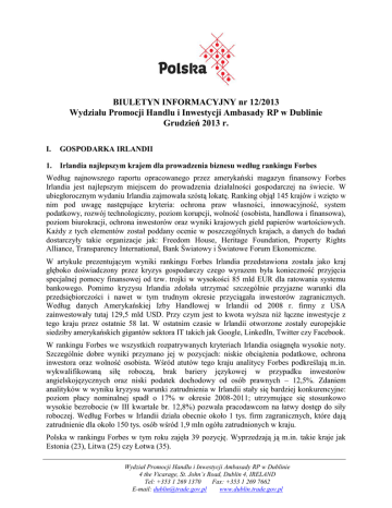 BIULETYN INFORMACYJNY nr 12/2013 Wydziału Promocji Handlu i Inwestycji Ambasady RP w Dublinie Grudzień 2013 r. I. GOSPODARKA IRLANDII 1. Irlandia najlepszym krajem dla prowadzenia biznesu według rankingu Forbes Według najnowszego raportu opracowanego przez amerykański magazyn finansowy Forbes Irlandia jest najlepszym miejscem do prowadzenia działalności gospodarczej na świecie. W ubiegłorocznym wydaniu Irlandia zajmowała szóstą lokatę. Ranking objął 145 krajów i wzięto w nim pod uwagę następujące kryteria: ochrona praw własności, innowacyjność, system podatkowy, rozwój technologiczny, poziom korupcji, wolność (osobista, handlowa i finansowa), poziom biurokracji, ochrona inwestorów oraz wyniki krajowych giełd papierów wartościowych. Każdy z tych elementów został poddany ocenie w poszczególnych krajach, a danych do badań dostarczyły takie organizacje jak: Freedom House, Heritage Foundation, Property Rights Alliance, Transparency International, Bank Światowy i Światowe Forum Ekonomiczne. W artykule prezentującym wyniki rankingu Forbes Irlandia przedstawiona została jako kraj głęboko doświadczony przez kryzys gospodarczy czego wyrazem była konieczność przyjęcia specjalnej pomocy finansowej od tzw. trojki w wysokości 85 mld EUR dla ratowania systemu bankowego. Pomimo kryzysu Irlandia zdołała utrzymać szczególnie przyjazne warunki dla przedsiębiorczości i nawet w tym trudnym okresie przyciągała inwestorów zagranicznych. Według danych Amerykańskiej Izby Handlowej w Irlandii od 2008 r. firmy z USA zainwestowały tutaj 129,5 mld USD. Przy czym jest to kwota wyższa niż łączne inwestycje z tego kraju przez ostatnie 58 lat. W ostatnim czasie w Irlandii otworzone zostały europejskie siedziby amerykańskich gigantów sektora IT takich jak Google, LinkedIn, Twitter czy Facebook. W rankingu Forbes we wszystkich rozpatrywanych kryteriach Irlandia osiągnęła wysokie noty. Szczególnie dobre wyniki przyznano jej w pozycjach: niskie obciążenia podatkowe, ochrona inwestora oraz wolność osobista. Wśród atutów tego kraju analitycy Forbes podkreślają m.in. wykwalifikowaną siłę roboczą, brak bariery językowej w przypadku inwestorów angielskojęzycznych oraz niski podatek dochodowy od osób prawnych – 12,5%. Zdaniem analityków w wyniku kryzysu warunki zatrudnienia w Irlandii stały się bardziej konkurencyjne: poziom płacy nominalnej spadł o 17% w okresie 2008-2011; utrzymujące się stosunkowo wysokie bezrobocie (w III kwartale br. 12,8%) pozwala pracodawcom na łatwy dostęp do siły roboczej. Według Forbes w Irlandii działa obecnie około 1 tys. firm zagranicznych, które dają zatrudnienie dla około 150 tys. osób wśród 1,9 mln ogółu zatrudnionych w kraju. Polska w rankingu Forbes w tym roku zajęła 39 pozycję. Wyprzedzają ją m.in. takie kraje jak Estonia (23), Litwa (25) czy Łotwa (35). Wydział Promocji Handlu i Inwestycji Ambasady RP w Dublinie 4 the Vicarage, St. John’s Road, Dublin 4, IRELAND Tel: +353 1 269 1370 Fax: +353 1 269 7662 E-mail: [email protected] www.dublin.trade.gov.pl Wydział Promocji Handlu i Inwestycji Ambasady RP w Dublinie 2. Irlandia wprowadza nowy program jakości produktów mleczarskich Irlandzka agencja rządowa odpowiedzialna za promocję sektora rolno-spożywczego Bord Bia ogłosiła nowy program jakości produktów mleczarskich. Według zapewnień agencji i irlandzkiego ministra rolnictwa Simona Coveney’a będzie to pierwszy tego typu projekt na świecie. Farmerzy będą zachęcani do spełniania standardów ISO odnośnie certyfikacji produktów. Instytucje przeprowadzające okresowe kontrole gospodarstw rolnych będą sprawdzały takie parametry jak poziom emisji dwutlenku węgla, stan zdrowotny zwierząt, bezpieczeństwo żywności i dostępność informacji na temat poszczególnych etapów produkcji. Nowy program jakości będzie wprowadzany od stycznia 2014 r. Zamiarem Bord Bia jest pełne wdrożenie tego systemu do 2016 r. we wszystkich irlandzkich gospodarstwach rolnych zajmujących się produkcją mleczarską, których liczba szacowana jest na 18 tys. Roczna produkcja mleka w Irlandii wynosi obecnie ponad 5 mld litrów. Wprowadzenie nowego programu jakości związane jest ze spodziewanym od 2015 r. stopniowym wzrostem produkcji mleka w Irlandii. W terminie tym nastąpi zniesienie tzw. kwot mlecznych, czyli górnego pułapu produkcji mleka. Według wstępnych szacunków do 2020 r. produkcja mleka wzrośnie o 50%. Zamiarem agencji Bord Bia jest stymulowanie w ten sposób zrównoważonego wzrostu produkcji, która spełnia najwyższe wymogi jakości. Więcej informacji na temat nowego programu dostępnych jest na stronie internetowej Bord Bia. W ubiegłym roku polski eksport produktów mleczarskich do Irlandii wyniósł ponad 8,5 mln EUR i wzrósł w stosunku do poprzedniego roku o prawie 23%. W tym samym czasie import tego asortymentu z Irlandii do Polski wyniósł prawie 31 mln EUR (wzrost o 94%). Po 9 miesiącach br. nasz eksport produktów mleczarskich do Irlandii osiągnął poziom 7,6 mln EUR (wzrost w stosunku do analogicznego okresu o 24%), a import z tego kraju 32,6 mln EUR (wzrost o 44%). 3. Produkcja przemysłowa w Irlandii w październiku 2013 r. Według wstępnych danych Central Statistics Office (CSO) produkcja przemysłowa firm irlandzkich w październiku 2013 r. w wyrażeniu ilościowym zmniejszyła się o 12,1% w porównaniu z wrześniem br., natomiast w stosunku do października 2012 r. spadła o 7,6%. W październiku 2013 r. nowoczesne sektory obejmujące gałęzie związane z zaawansowanymi technologiami i przemysłem chemicznym w porównaniu z wrześniem br. odnotowały spadek produkcji w wysokości 16,7% (a w skali roku spadek wyniósł 11,7%). Natomiast w tzw. sektorach tradycyjnych produkcja zwiększyła się o 0,3% (w skali roku wzrosła o 1,5%). W wyrażeniu wartościowym produkcja przemysłowa w październiku 2013 r. w stosunku do poprzedniego mi
