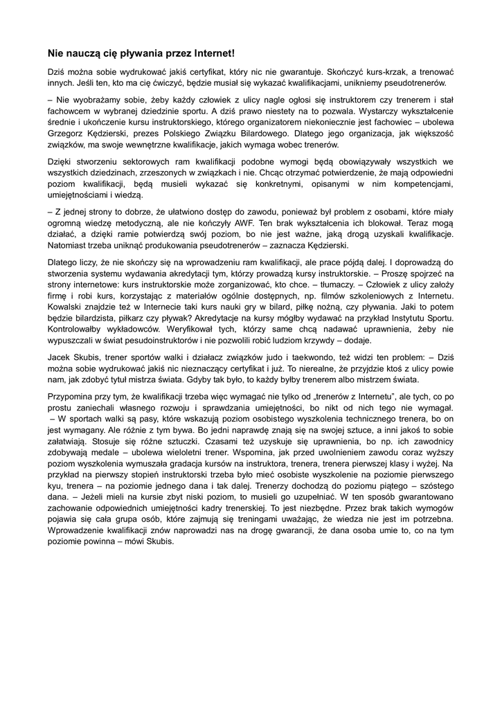 Nie nauczą cię pływania przez Internet! Dziś można sobie wydrukować jakiś certyfikat, który nic nie gwarantuje. Skończyć kurs-krzak, a trenować innych. Jeśli ten, kto ma cię ćwiczyć, będzie musiał się wykazać kwalifikacjami, unikniemy pseudotrenerów. – Nie wyobrażamy sobie, żeby każdy człowiek z ulicy nagle ogłosi się instruktorem czy trenerem i stał fachowcem w wybranej dziedzinie sportu. A dziś prawo niestety na to pozwala. Wystarczy wykształcenie średnie i ukończenie kursu instruktorskiego, którego organizatorem niekoniecznie jest fachowiec – ubolewa Grzegorz Kędzierski, prezes Polskiego Związku Bilardowego. Dlatego jego organizacja, jak większość związków, ma swoje wewnętrzne kwalifikacje, jakich wymaga wobec trenerów. Dzięki stworzeniu sektorowych ram kwalifikacji podobne wymogi będą obowiązywały wszystkich we wszystkich dziedzinach, zrzeszonych w związkach i nie. Chcąc otrzymać potwierdzenie, że mają odpowiedni poziom kwalifikacji, będą musieli wykazać się konkretnymi, opisanymi w nim kompetencjami, umiejętnościami i wiedzą. – Z jednej strony to dobrze, że ułatwiono dostęp do zawodu, ponieważ był problem z osobami, które miały ogromną wiedzę metodyczną, ale nie kończyły AWF. Ten brak wykształcenia ich blokował. Teraz mogą działać, a dzięki ramie potwierdzą swój poziom, bo nie jest ważne, jaką drogą uzyskali kwalifikacje. Natomiast trzeba uniknąć produkowania pseudotrenerów – zaznacza Kędzierski. Dlatego liczy, że nie skończy się na wprowadzeniu ram kwalifikacji, ale prace pójdą dalej. I doprowadzą do stworzenia systemu wydawania akredytacji tym, którzy prowadzą kursy instruktorskie. – Proszę spojrzeć na strony internetowe: kurs instruktorskie może zorganizować, kto chce. – tłumaczy. – Człowiek z ulicy założy firmę i robi kurs, korzystając z materiałów ogólnie dostępnych, np. filmów szkoleniowych z Internetu. Kowalski znajdzie też w Internecie taki kurs nauki gry w bilard, piłkę nożną, czy pływania. Jaki to potem będzie bilardzista, piłkarz czy pływak? Akredytacje na kursy mógłby wydawać na przykład Instytutu Sportu. Kontrolowałby wykładowców. Weryfikował tych, którzy same chcą nadawać uprawnienia, żeby nie wypuszczali w świat pesudoinstruktorów i nie pozwolili robić ludziom krzywdy – dodaje. Jacek Skubis, trener sportów walki i działacz związków judo i taekwondo, też widzi ten problem: – Dziś można sobie wydrukować jakiś nic nieznaczący certyfikat i już. To nierealne, że przyjdzie ktoś z ulicy powie nam, jak zdobyć tytuł mistrza świata. Gdyby tak było, to każdy byłby trenerem albo mistrzem świata. Przypomina przy tym, że kwalifikacji trzeba więc wymagać nie tylko od „trenerów z Internetu”, ale tych, co po prostu zaniechali własnego rozwoju i sprawdzania umiejętności, bo nikt od nich tego nie wymagał. – W sportach walki są pasy, które wskazują poziom osobistego wyszkolenia technicznego trenera, bo on jest wymagany. Ale różnie z tym bywa. Bo jedni naprawdę znają się na swojej sztuce, a inni jakoś to sobie załatwiają. Stosuje się różne sztuczki. Czasami też uzyskuje się uprawnienia, bo np. ich zawodnicy zdobywają medale – ubolewa wieloletni trener. Wspomina, jak przed uwolnieniem zawodu coraz wyższy poziom wyszkolenia wymuszała gradacja kursów na instruktora, trenera, trenera pierwszej klasy i wyżej. Na przykład na pierwszy stopień instruktorski trzeba było mieć osobiste wyszkolenie na poziomie pierwszego kyu, trenera – na poziomie jednego dana i tak dalej. Trenerzy dochodzą do poziomu piątego – szóstego dana. – Jeżeli mieli na kursie zbyt niski poziom, to musieli go uzupełniać. W ten sposób gwarantowano zachowanie odpowiednich umiejętności kadry trenerskiej. To jest niezbędne. Przez brak takich wymogów pojawia się cała grupa osób, które zajmują się treningami uważając, że wiedza nie jest im potrzebna. Wprowadzenie kwalifikacji znów naprowadzi nas na drogę gwarancji, że dana osoba umie to, co na tym poziomie powinna – mówi Skubis.