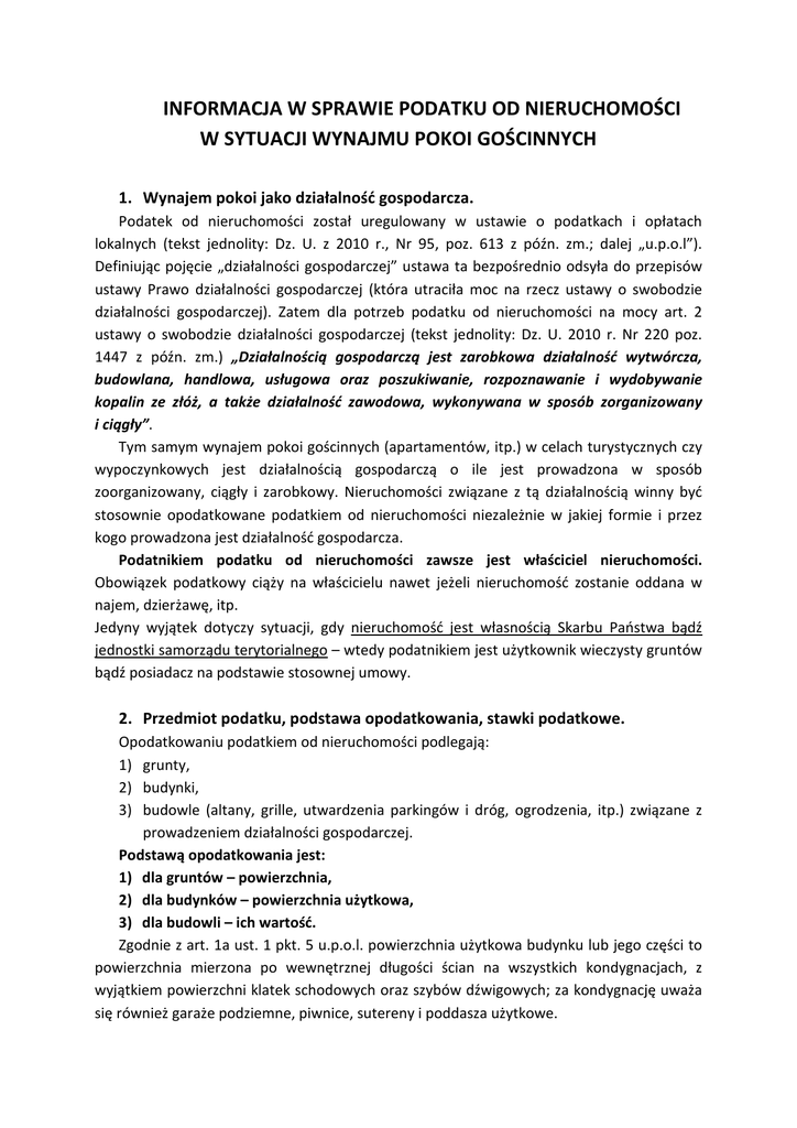 INFORMACJA W SPRAWIE PODATKU OD NIERUCHOMOŚCI W SYTUACJI WYNAJMU POKOI GOŚCINNYCH 1. Wynajem pokoi jako działalność gospodarcza. Podatek od nieruchomości został uregulowany w ustawie o podatkach i opłatach lokalnych (tekst jednolity: Dz. U. z 2010 r., Nr 95, poz. 613 z późn. zm.; dalej „u.p.o.l”). Definiując pojęcie „działalności gospodarczej” ustawa ta bezpośrednio odsyła do przepisów ustawy Prawo działalności gospodarczej (która utraciła moc na rzecz ustawy o swobodzie działalności gospodarczej). Zatem dla potrzeb podatku od nieruchomości na mocy art. 2 ustawy o swobodzie działalności gospodarczej (tekst jednolity: Dz. U. 2010 r. Nr 220 poz. 1447 z późn. zm.) „Działalnością gospodarczą jest zarobkowa działalność wytwórcza, budowlana, handlowa, usługowa oraz poszukiwanie, rozpoznawanie i wydobywanie kopalin ze złóż, a także działalność zawodowa, wykonywana w sposób zorganizowany i ciągły”. Tym samym wynajem pokoi gościnnych (apartamentów, itp.) w celach turystycznych czy wypoczynkowych jest działalnością gospodarczą o ile jest prowadzona w sposób zoorganizowany, ciągły i zarobkowy. Nieruchomości związane z tą działalnością winny być stosownie opodatkowane podatkiem od nieruchomości niezależnie w jakiej formie i przez kogo prowadzona jest działalność gospodarcza. Podatnikiem podatku od nieruchomości zawsze jest właściciel nieruchomości. Obowiązek podatkowy ciąży na właścicielu nawet jeżeli nieruchomość zostanie oddana w najem, dzierżawę, itp. Jedyny wyjątek dotyczy sytuacji, gdy nieruchomość jest własnością Skarbu Państwa bądź jednostki samorządu terytorialnego – wtedy podatnikiem jest użytkownik wieczysty gruntów bądź posiadacz na podstawie stosownej umowy. 2. Przedmiot podatku, podstawa opodatkowania, stawki podatkowe. Opodatkowaniu podatkiem od nieruchomości podlegają: 1) grunty, 2) budynki, 3) budowle (altany, grille, utwardzenia parkingów i dróg, ogrodzenia, itp.) związane z prowadzeniem działalności gospodarczej. Podstawą opodatkowania jest: 1) dla gruntów – powierzchnia, 2) dla budynków – powierzchnia użytkowa, 3) dla budowli – ich wartość. Zgodnie z art. 1a ust. 1 pkt. 5 u.p.o.l. powierzchnia użytkowa budynku lub jego części to powierzchnia mierzona po wewnętrznej długości ścian na wszystkich kondygnacjach, z wyjątkiem powierzchni klatek schodowych oraz szybów dźwigowych; za kondygnację uważa się również garaże podziemne, piwnice, sutereny i poddasza użytkowe. Ponadto na mocy art. 1a ust. 1 pkt. 3 u.p.o.l. grunty, budynki i budowle związane z prowadzeniem działalności gospodarczej to grunty, budynki i budowle będące w posiadaniu przedsiębiorcy lub innego podmiotu prowadzącego działalność gospodarczą, z wyjątkiem budynków mieszkalnych oraz gruntów związanych z tymi budynkami (wyjątek omówiony w pkt. 4). Stawki podatku od nieruchomości określane są przez Radę Miasta i publikowane m.in. w Biuletynie Informacji Publicznej (www.bip.wisla.pl). Na rok 2012 obowiązuje uchwała nr XI/144/2011 z dnia 27 października 2011 r. w której określono następujące stawki podatku: dla gruntów związanych z prowadzeniem działalności gospodarczej – 0,78 zł/m2 rocznie, dla budynków związanych z prowadzeniem działalności gospodarczych – 20,81 zł/m2 rocznie, dla budowli – 2% wartości rocznie. Wszelkie nieruchomości będące w posiadaniu przedsiębiorcy, bądź podmiotu prowadzącego działalność gospodarczą, co do zasady podlegają opodatkowaniu stawkami podatku odpowiednimi dla działalności gospodarczej. 3. Terminy. Jeżeli w trakcie roku podatkowego zaistniało zdarzenie mające wpływ na wysokość opodatkowania w tym roku, a w szczególności zmiana sposobu wykorzystywania przedmiotu opodatkowania lub jego części, podatek ulega obniżeniu lub podwyższeniu, poczynając od pierwszego dnia miesiąca następującego po miesiącu, w którym nastąpiło to zdarzenie. Stosownie do art. 6 ust. 6 u.p.o.l osoby fizyczne są obowiązane złożyć właściwemu organowi podatkowemu „informację o nieruchomościach i obiektach budowlanych ...” w ciągu 14 dni od dnia zaistnienia okoliczności mających wpływ na wysokość podatku. Informację taką można złożyć również w formie elektronicznej poprzez system SEKAP. (www.sekap.pl) Zwrócić uwagę należy na okoliczność, że wykonywanie działalności gospodarczej obejmuje nie tylko faktyczne wykonanie czynności należących do zakresu tej działalności, lecz także czynności zmierzające do zaistnienia takich czynności gospodarczych (czynności przygotowawcze). Prowadzenie działalności gospodarczej występuje zarówno w okresach wykonywania innych czynności związanych z działalnością – takich jak poszukiwanie nowych klientów, zamieszczanie ogłoszeń w prasie, załatwianie spraw urzędowych. Wszystkie te czynności pozostają w ścisłym związku z działalnością usługową, bowiem zmierzają do stworzenia właściwych warunków do jej wykonywania. Reasumując, rozpoczęcie (zakończenie) prowadzenia działalności gospodarczej wywołuje skutki w podatku od nieruchomości od pierwszego dnia następnego miesiąca. Za prowadzenie działalności gospodarczej należy rozumieć również wszelkie czynności przygotowawcze jak np. poszukiwanie klientów. Wraz z każdą zmianą mającą wpływ na wysokość podatku od nieruchomości (np. rozpoczęcie, zakończenie czy zawieszenie prowadzenia działalności gospodarczej) należy złożyć stosowne oświadczenie podatkowe. 4. Wynajem pokoi w budynku mieszkalnym. Wszelkie nieruchomości będące w posiadaniu przedsiębiorcy, bądź podmiotu prowadzącego działalność gospodarczą, podlegają opodatkowaniu stawkami podatku odpowiednimi dla działalności gospodarczej. Dzieje się tak nawet jeżeli nieruchomość jest związana z działalnością gospodarczą wyłącznie pośrednio i w danym czasie nie 