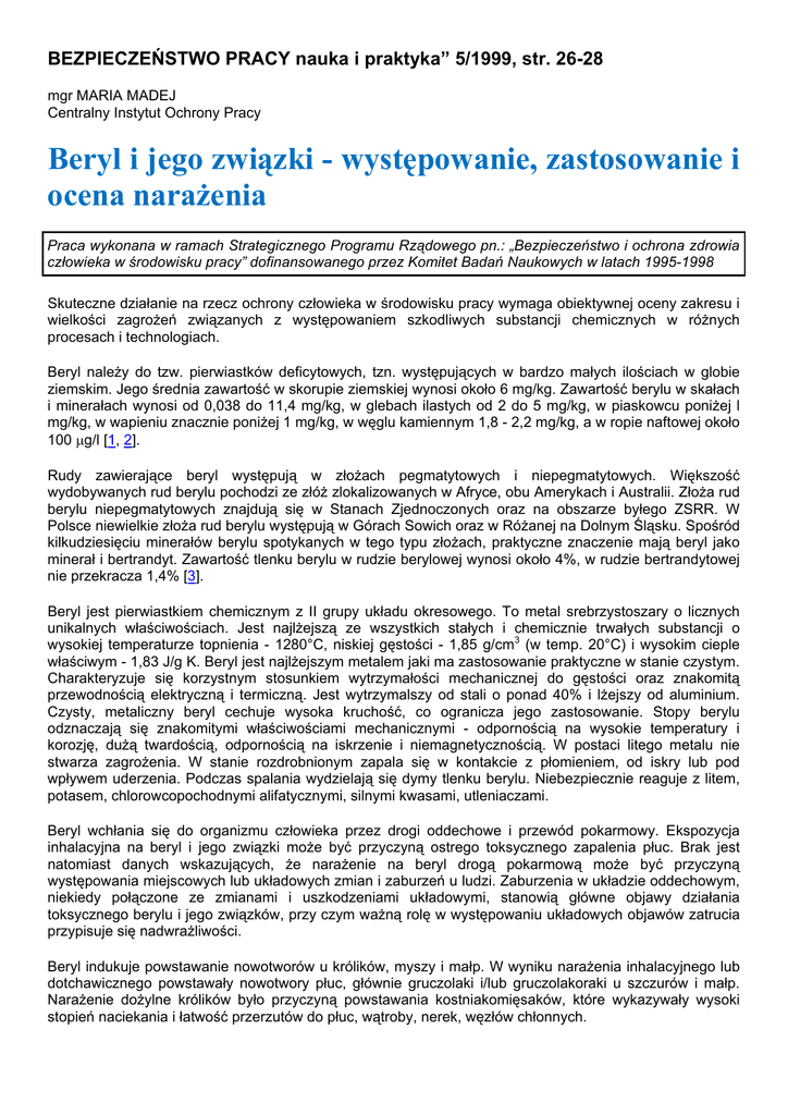 BEZPIECZEŃSTWO PRACY nauka i praktyka” 5/1999, str. 26-28 mgr MARIA MADEJ Centralny Instytut Ochrony Pracy Beryl i jego związki - występowanie, zastosowanie i ocena narażenia Praca wykonana w ramach Strategicznego Programu Rządowego pn.: „Bezpieczeństwo i ochrona zdrowia człowieka w środowisku pracy” dofinansowanego przez Komitet Badań Naukowych w latach 1995-1998 Skuteczne działanie na rzecz ochrony człowieka w środowisku pracy wymaga obiektywnej oceny zakresu i wielkości zagrożeń związanych z występowaniem szkodliwych substancji chemicznych w różnych procesach i technologiach. Beryl należy do tzw. pierwiastków deficytowych, tzn. występujących w bardzo małych ilościach w globie ziemskim. Jego średnia zawartość w skorupie ziemskiej wynosi około 6 mg/kg. Zawartość berylu w skałach i minerałach wynosi od 0,038 do 11,4 mg/kg, w glebach ilastych od 2 do 5 mg/kg, w piaskowcu poniżej l mg/kg, w wapieniu znacznie poniżej 1 mg/kg, w węglu kamiennym 1,8 - 2,2 mg/kg, a w ropie naftowej około 100 μg/l [1, 2]. Rudy zawierające beryl występują w złożach pegmatytowych i niepegmatytowych. Większość wydobywanych rud berylu pochodzi ze złóż zlokalizowanych w Afryce, obu Amerykach i Australii. Złoża rud berylu niepegmatytowych znajdują się w Stanach Zjednoczonych oraz na obszarze byłego ZSRR. W Polsce niewielkie złoża rud berylu występują w Górach Sowich oraz w Różanej na Dolnym Śląsku. Spośród kilkudziesięciu minerałów berylu spotykanych w tego typu złożach, praktyczne znaczenie mają beryl jako minerał i bertrandyt. Zawartość tlenku berylu w rudzie berylowej wynosi około 4%, w rudzie bertrandytowej nie przekracza 1,4% [3]. Beryl jest pierwiastkiem chemicznym z II grupy układu okresowego. To metal srebrzystoszary o licznych unikalnych właściwościach. Jest najlżejszą ze wszystkich stałych i chemicznie trwałych substancji o wysokiej temperaturze topnienia - 1280°C, niskiej gęstości - 1,85 g/cm3 (w temp. 20°C) i wysokim cieple właściwym - 1,83 J/g K. Beryl jest najlżejszym metalem jaki ma zastosowanie praktyczne w stanie czystym. Charakteryzuje się korzystnym stosunkiem wytrzymałości mechanicznej do gęstości oraz znakomitą przewodnością elektryczną i termiczną. Jest wytrzymalszy od stali o ponad 40% i lżejszy od aluminium. Czysty, metaliczny beryl cechuje wysoka kruchość, co ogranicza jego zastosowanie. Stopy berylu odznaczają się znakomitymi właściwościami mechanicznymi - odpornością na wysokie temperatury i korozję, dużą twardością, odpornością na iskrzenie i niemagnetycznością. W postaci litego metalu nie stwarza zagrożenia. W stanie rozdrobnionym zapala się w kontakcie z płomieniem, od iskry lub pod wpływem uderzenia. Podczas spalania wydzielają się dymy tlenku berylu. Niebezpiecznie reaguje z litem, potasem, chlorowcopochodnymi alifatycznymi, silnymi kwasami, utleniaczami. Beryl wchłania się do organizmu człowieka przez drogi oddechowe i przewód pokarmowy. Ekspozycja inhalacyjna na beryl i jego związki może być przyczyną ostrego toksycznego zapalenia płuc. Brak jest natomiast danych wskazujących, że narażenie na beryl drogą pokarmową może być przyczyną występowania miejscowych lub układowych zmian i zaburzeń u ludzi. Zaburzenia w układzie oddechowym, niekiedy połączone ze zmianami i uszkodzeniami układowymi, stanowią główne objawy działania toksycznego berylu i jego związków, przy czym ważną rolę w występowaniu układowych objawów zatrucia przypisuje się nadwrażliwości. Beryl indukuje powstawanie nowotworów u królików, myszy i małp. W wyniku narażenia inhalacyjnego lub dotchawicznego powstawały nowotwory płuc, głównie gruczolaki i/lub gruczolakoraki u szczurów i małp. Narażenie dożylne królików było przyczyną powstawania kostniakomięsaków, które wykazywały wysoki stopień naciekania i łatwość przerzutów do płuc, wątroby, nerek, węzłów chłonnych. Beryl i jego związki wchodzą w reakcję z DNA i mogą być przyczyną występowania mutacji genowych, wzrostu częstości abberacji chromosomowych i wymian chromatyd siostrzanych w hodowanych somatycznych komórkach ssaków, ale nie wykazują działania mutagennego w testowanych układach bakteryjnych. Dane dotyczące teratogennego działania berylu i wpływu na rozrodczość są niewystarczające do wyciągnięcia wniosku, że beryl i jego związki mogą działać teratogennie oraz wpływać na rozrodczość u ludzi i zwierząt. Dokonując przeglądu istniejących badań, Międzynarodowa Agencja Badań nad Rakiem (IARC) w 1993 roku zakwalifikowała beryl do grupy l związków kancerogennych dla ludzi, uznając epidemiologiczne dowody jego rakotwórczości za wystarczające. Beryl i związki berylu, zgodnie z rozporządzeniem Ministra Zdrowia i Opieki Społecznej z dnia 11 września 1996 roku, został zaliczony do czynników rakotwórczych dla ludzi [4]. Substancja ta pod względem zagrożeń dla zdrowia lub życia została sklasyfikowana jako niebezpieczna zgodnie z rozporządzeniem Ministra Zdrowia i Opieki Społecznej z dnia 21 sierpnia 1997 roku [5]. Działa bardzo toksycznie w przypadku narażenia drogą oddechową i toksycznie w przypadku spożycia. Może być przyczyną raka w następstwie narażenia drogą oddechową. Działa drażniąco na oczy, układ oddechowy i skórę. Może powodować uczulenie w razie kontaktu ze skórą. Stwarza poważne zagrożenie zdrowia w następstwie narażenia długotrwałego. Beryl metaliczny otrzymuje się przez redukcję fluorku berylu za pomocą magnezu lub z wodorotlenku berylu przekształcając go w chlorek berylu (BeCl2) przez ogrzewanie z węglem i chlorem, a następnie elektrolizę stopionego chlorku. Najważniejszy stop berylowy z miedzią, tzw. brąz berylowy, otrzymuje się z tlenku berylu przez redukcję węglem w obecności płynnej miedzi. Proces prowadzi się w temperaturze 1800 - 2000°C w piecu łukowym; otr