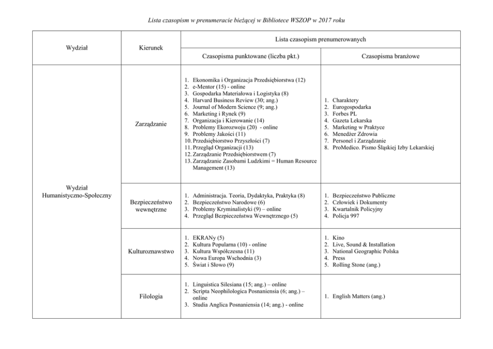 Lista czasopism w prenumeracie bieżącej w Bibliotece WSZOP w 2017 roku Lista czasopism prenumerowanych Wydział Kierunek Czasopisma branżowe Czasopisma punktowane (liczba pkt.) 1. Ekonomika i Organizacja Przedsiębiorstwa (12) 2. e-Mentor (15) - online 3. Gospodarka Materiałowa i Logistyka (8) 4. Harvard Business Review (30; ang.) 5. Journal of Modern Science (9; ang.) 6. Marketing i Rynek (9) 7. Organizacja i Kierowanie (14) 8. Problemy Ekorozwoju (20) - online 9. Problemy Jakości (11) 10. Przedsiębiorstwo Przyszłości (7) 11. Przegląd Organizacji (13) 12. Zarządzanie Przedsiębiorstwem (7) 13. Zarządzanie Zasobami Ludzkimi = Human Resource Management (13) 1. 2. 3. 4. 5. 6. 7. 8. Charaktery Eurogospodarka Forbes PL Gazeta Lekarska Marketing w Praktyce Menedżer Zdrowia Personel i Zarządzanie ProMedico. Pismo Śląskiej Izby Lekarskiej Bezpieczeństwo wewnętrzne 1. 2. 3. 4. Administracja. Teoria, Dydaktyka, Praktyka (8) Bezpieczeństwo Narodowe (6) Problemy Kryminalistyki (9) – online Przegląd Bezpieczeństwa Wewnętrznego (5) 1. 2. 3. 4. Bezpieczeństwo Publiczne Człowiek i Dokumenty Kwartalnik Policyjny Policja 997 Kulturoznawstwo 1. 2. 3. 4. 5. EKRANy (5) Kultura Popularna (10) - online Kultura Współczesna (11) Nowa Europa Wschodnia (3) Świat i Słowo (9) 1. 2. 3. 4. 5. Kino Live, Sound & Installation National Geographic Polska Press Rolling Stone (ang.) Zarządzanie Wydział Humanistyczno-Społeczny Filologia 1. Linguistica Silesiana (15; ang.) – online 2. Scripta Neophilologica Posnaniensia (6; ang.) – online 3. Studia Anglica Posnaniensia (14; ang.) - online 1. English Matters (ang.) Lista czasopism prenumerowanych Wydział Kierunek Czasopisma punktowane (liczba pkt.) Wydział Nauk Technicznych Czasopisma o profilu ogólnym: 1. 2. 3. 4. 5. 6. 7. 8. Bloomberg Businessweek (ang.) Fabryka Silesia Forum Akademickie Gazeta Wyborcza Polityka Science (50; ang.) Scientific American (35; ang.) Tygodnik Powszechny Zarządzanie i inżynieria produkcji 1. Aparatura Badawcza i Dydaktyczna (10) – online 2. Bezpieczeństwo Pracy (7) 3. Bezpieczeństwo Pracy i Ochrona Środowiska w Górnictwie (6) 4. Journal of Ecology and Health (5) – online 5. Journal of Sustainable Mining (10; ang.) – online 6. Management and Production Engineering Review (12; ang.) 7. Medycyna Pracy (15) 8. Medycyna Środowiskowa (8) 9. Przegląd Prawa Ochrony Środowiska (6) – online 10. Zeszyty Naukowe WSZOP (7) Czasopisma branżowe 1. Atest 2. Biuletyn Górniczy 3. Chemia Przemysłowa 4. Journal of Chemical Health and Safety (ang.) 5. Kwartalnik Ekologia 6. Magazyn Ex - online 7. Nowa Energia 8. Ochrona Przeciwpożarowa 9. Polska Energia 10. Promotor BHP 11. Przyjaciel przy Pracy 12. Strażak 13. W Akcji